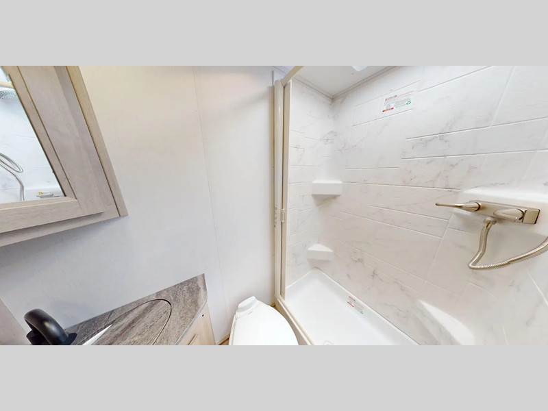 Each is built with SuperLite composite substrate, a fiberglass roof, a one-piece fiberglass front cap, and fiberglass running boards. Some top features include blackout roller shades in the living room and bedroom, a 10" touchscreen with CarPlay/Android radio with USB and Bluetooth, and an all-enclosed bathroom with a privacy door allowing you to skip the public facilities along the way. And since there is all-wheel drive, you can tackle tougher roads!