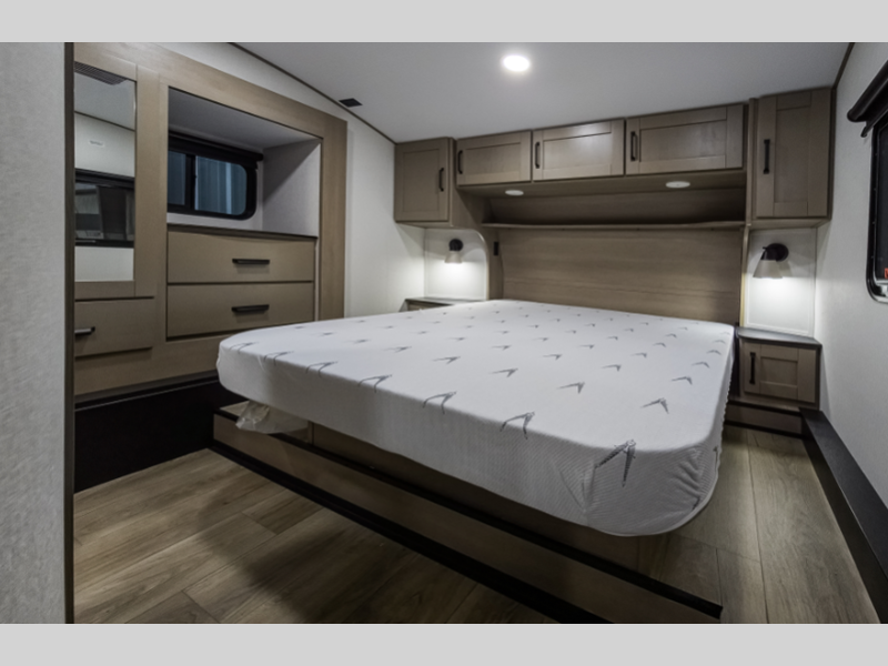 Reflection is built with the Arctic 4-Season Protection package which provides a 35K BTU high-capacity furnace, double insulated roof and front cap, a heated and underbelly with circulating heat, and 12V heat pads on the holding tanks to mention a few features that allow you to travel during any climate. The interior offers residential cabinetry, a deep-seated stainless-steel kitchen sink in the gourmet kitchen, a spacious shower with a glass door, and ductless flooring in the living area to name a few comforts.