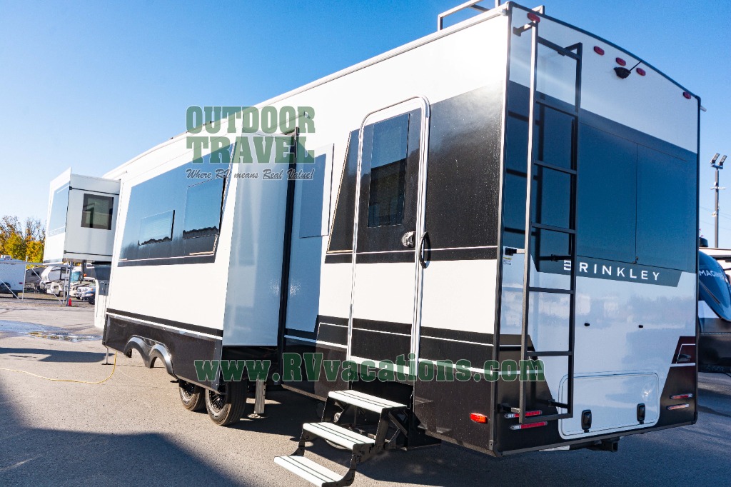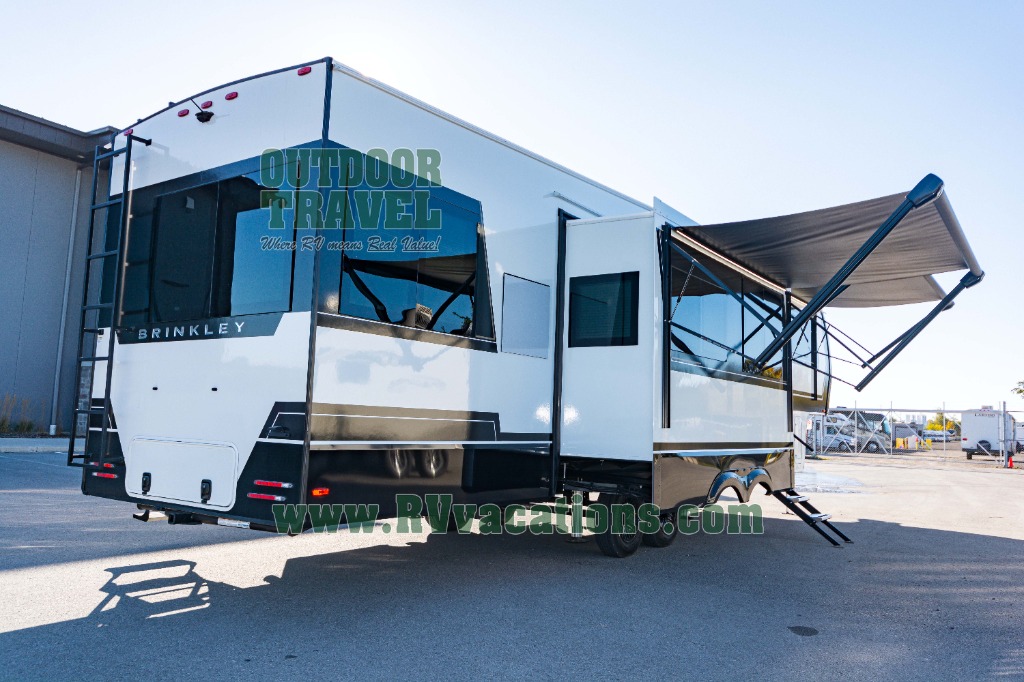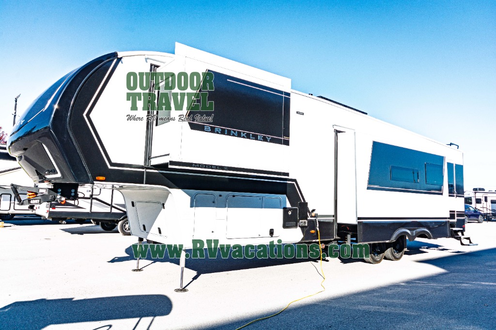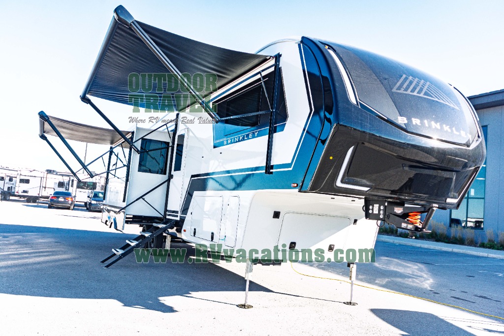 The Brinkley mid-profile Model Z fifth wheels bring you clean lines and an upscale look with plenty of style and exciting new features like the industry first brass plumbing connections. These units also feature an automotive grade front cap, plenty of exterior storage, dual exterior hot and cold showers, and wide stance leveling jacks for easy set up. Residential frameless windows provide a clean look and beautiful views, and ample electrical outlets and 6 USB/USB-C outlets allow all of your electronics and appliances to easily be used and charged.