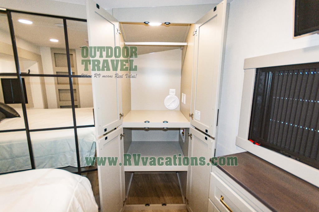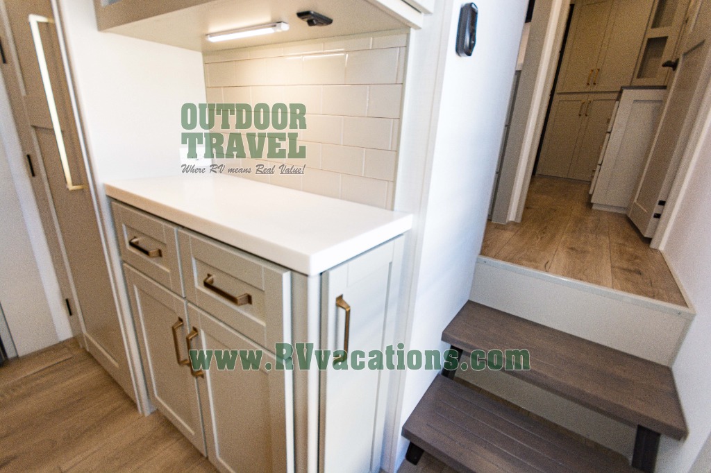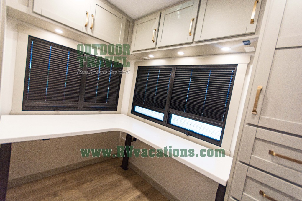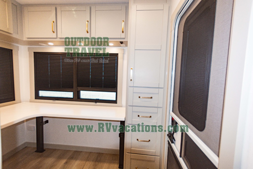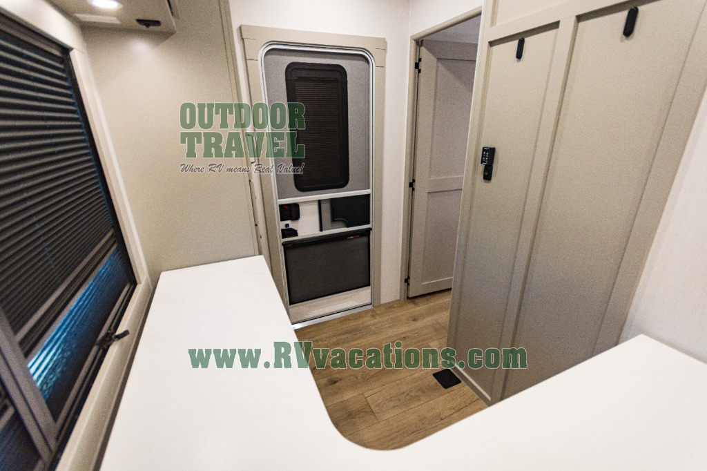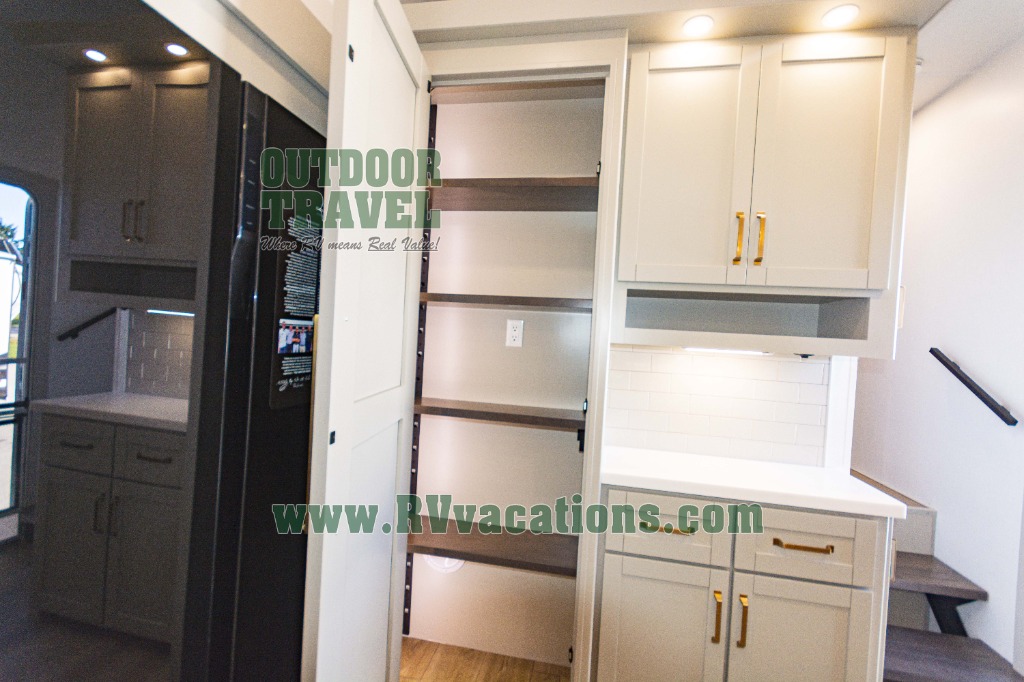 If you're looking for a feature-packed fifth wheel, this is the one! The rear multipurpose flex space can be used as an office/butler's pantry/laundry room/mudroom! There is an adjustable-height desk, storage space, plus washer and dryer prep. One of the dual entry doors is even found here for added convenience. The combined middle kitchen and living room includes dual opposing slides, a tri-fold sofa, theater seating, and a sliding desk/dining table. There is also a televator and fireplace, kitchen island with pet bowls, and an 84" pantry with adjustable shelving to name a few more features. A full bath towards the front includes a 30" x 42" shower, and the front private bedroom will feel just like home with its king bed slide out. There is also a sliding dresser top with hidden storage, bedside shelves, a front wardrobe, and washer and dryer prep here also!