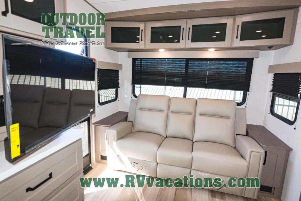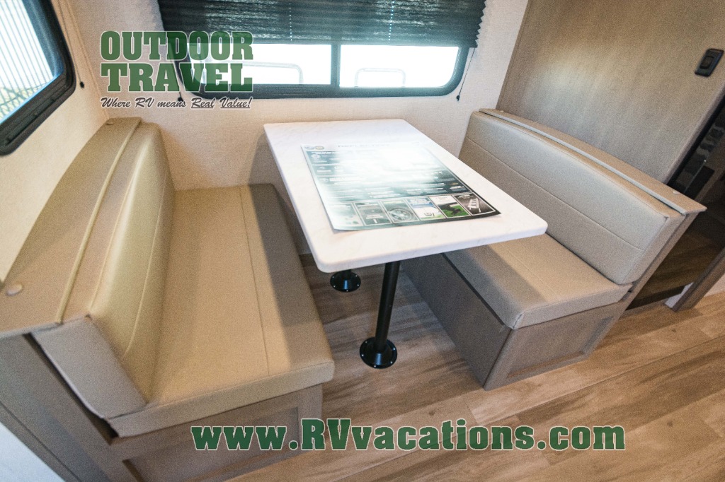 This is the perfect couple's trailer with a space for an overnight guest or two little ones on the booth dinette. You can switch out this dinette for an optional swivel dinette as well, and the standard theater seating can be replaced by an optional trundle bed if you need more sleeping space. A 40" HDTV will keep you entertained when the weather isn't cooperating, and you can whip up your best meals in the full kitchen. And a 19' power awning will provide shade if you choose to take your plate outdoors! The spacious full bath will let you clean up each day, and you'll feel right at home in the front private bedroom with a queen bed!