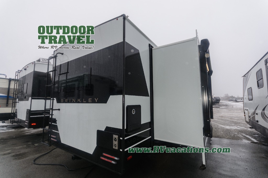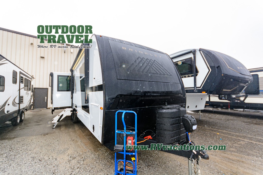 The lightweight Model I travel trailer by Brinkley is the perfect choice for those looking for an easy tow and at-home comforts! There is a drop-frame chassis, high-performance Road Armor suspension equalizer system, and Demco EZ Latch trailer coupler that automatically latches when dropped onto a hitch ball without the need of a safety pin. Additional exterior features include square Euro frameless windows, automotive-grade paint, full-width LED strip lighting in the pass-thru, and a pet & property security campside tie-down to keep your gear and furry friends safe. Inside, you'll be wowed by Brinkley's CraftSense wood trim construction, residential solid surface kitchen countertops, dimmable bedroom lights, and marine-grade neon LED shower lighting to name a few stand-out features!