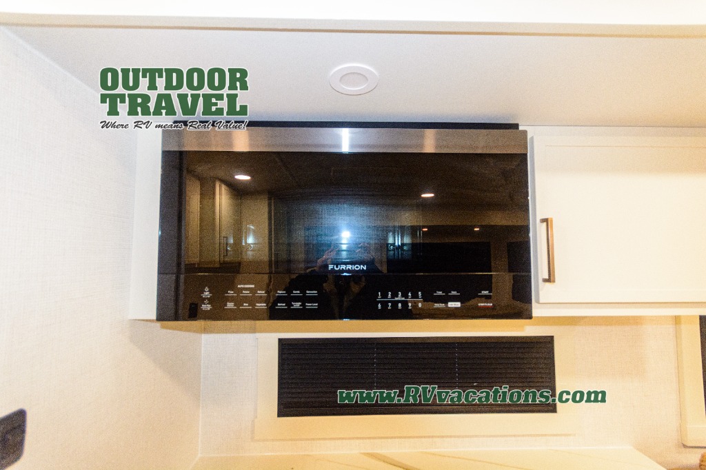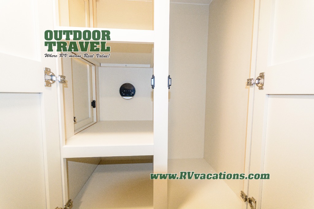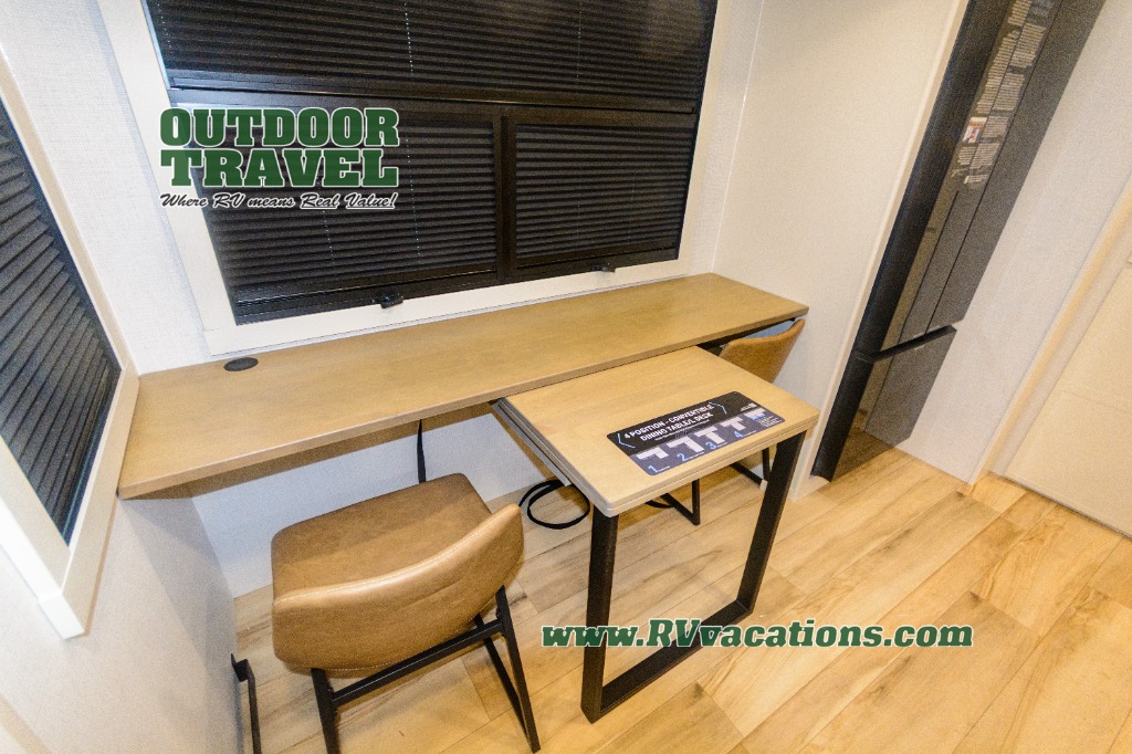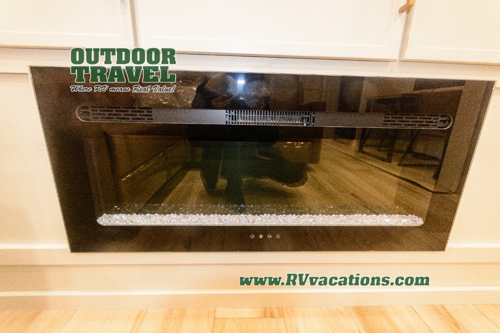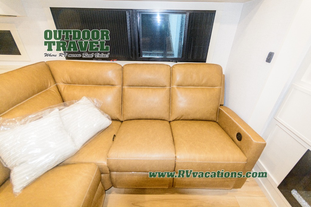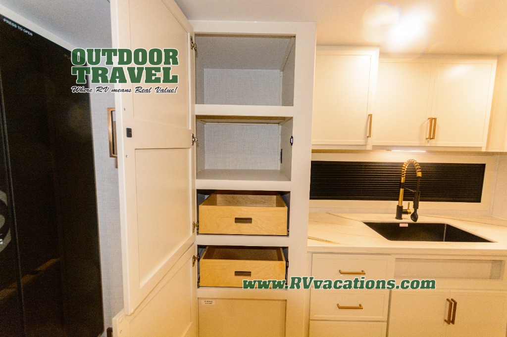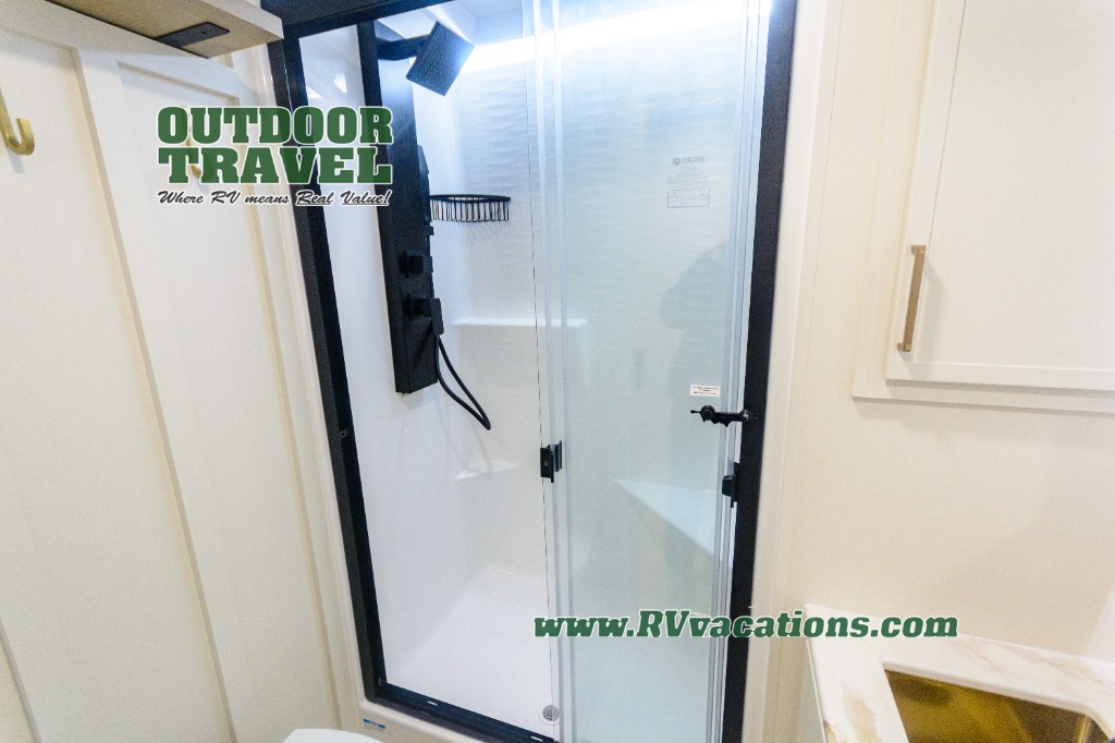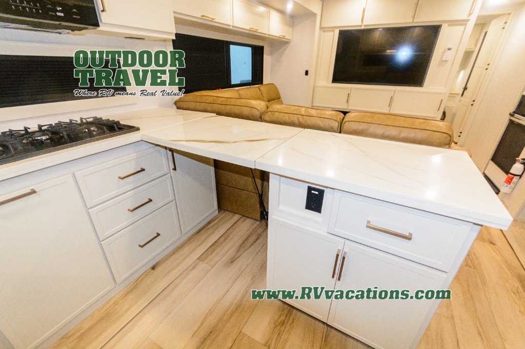 Savor the joy of cooking and sharing meals with loved ones in this beautifully appointed kitchen! This rear kitchen features a spacious pantry with drawers and outlets, a 30" convection microwave, a flip-up counter, and a 12V refrigerator. The convertible dining table and L-desk create a refined space for meals, work, and relaxation. The adjacent L-sofa forms a cozy sanctuary for reading, socializing, or enjoying the entertainment center and fireplace. There is a full bathroom with everything you need to keep your personal hygiene on the road. Plus, the front bedroom’s peaceful haven features a plush king bed, nightstands with storage, and a MaxSpace split-level wardrobe. Additionally, the two exterior awnings create a spacious outdoor living area, ideal for relaxing, entertaining, or enjoying the great outdoors.