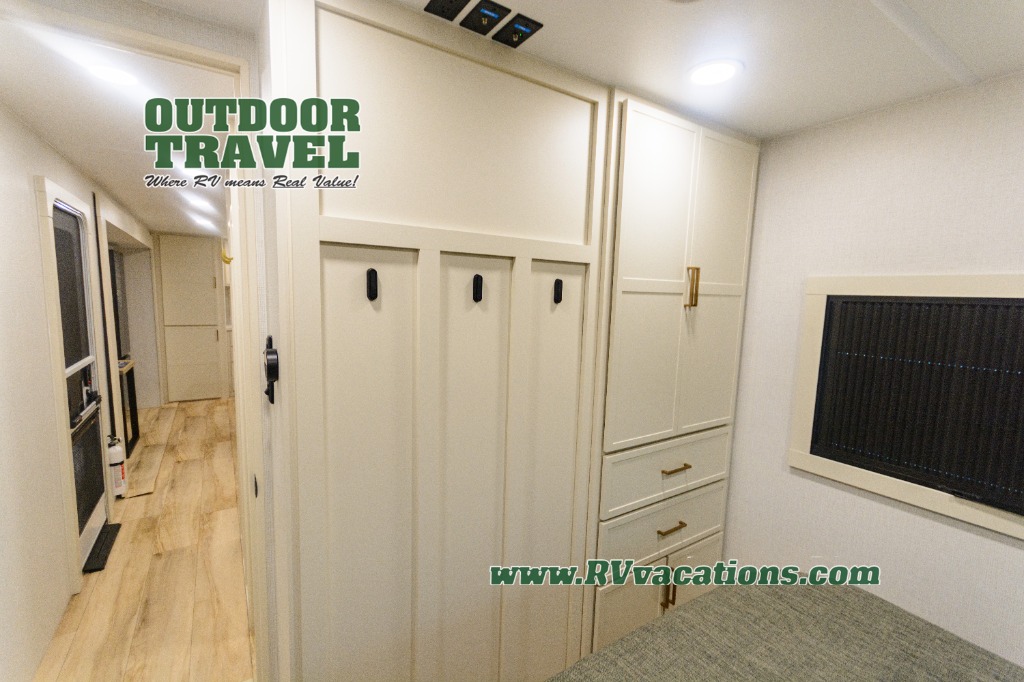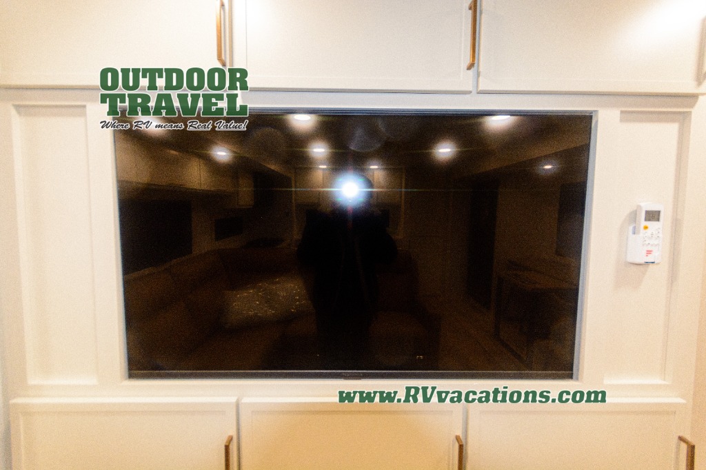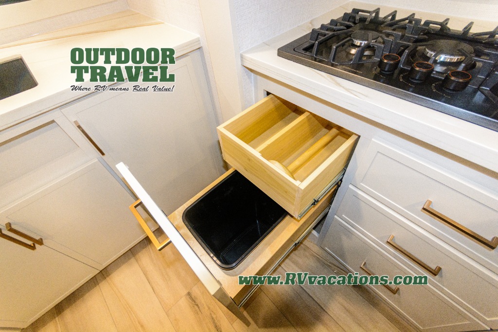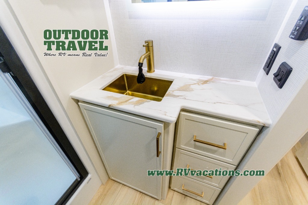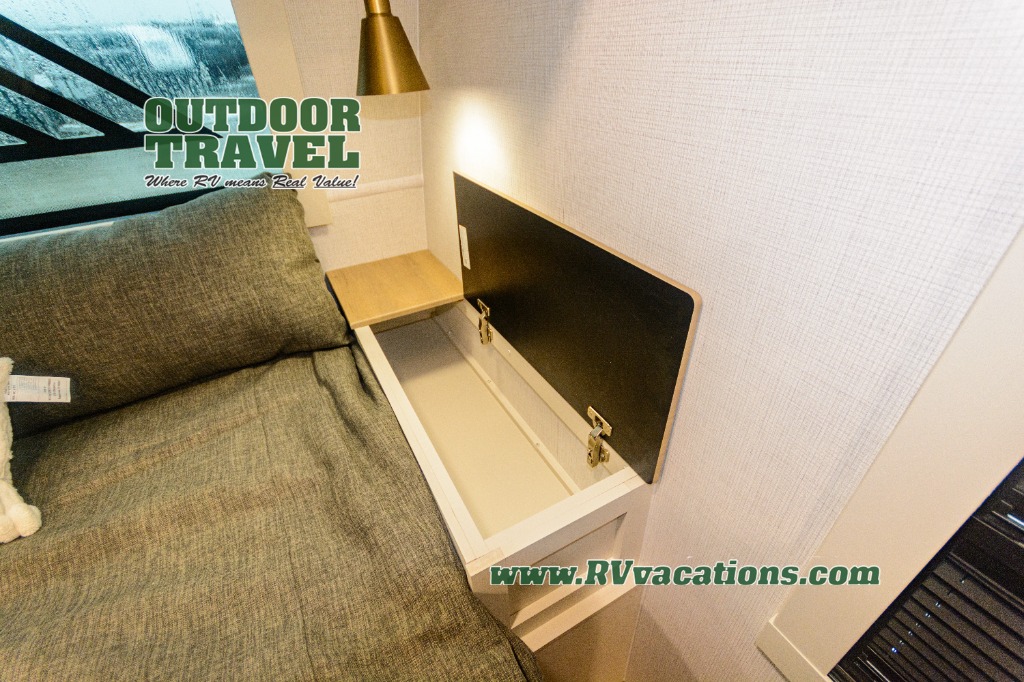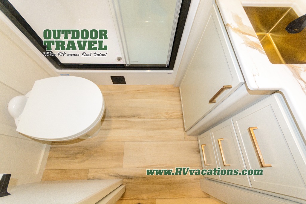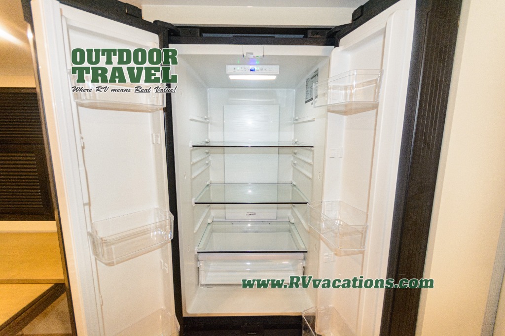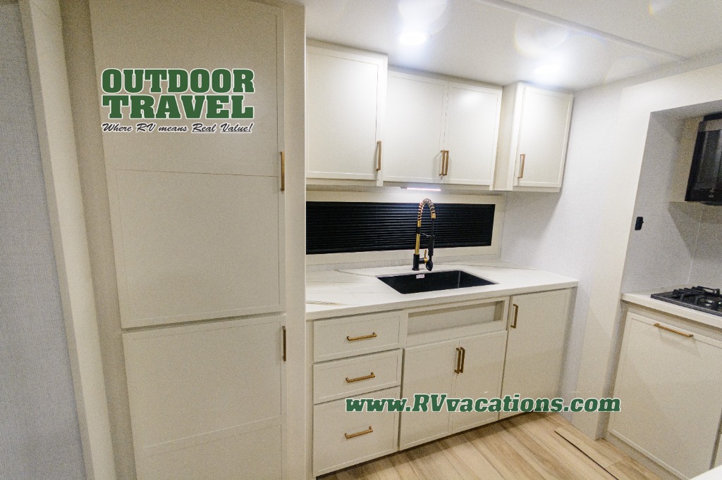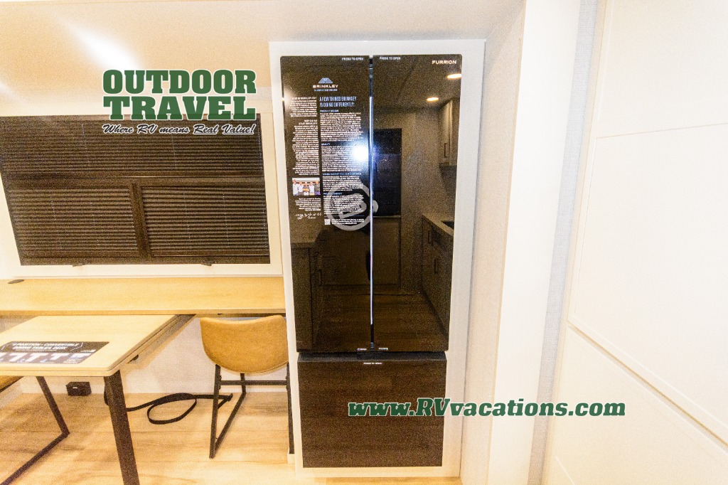 Savor the joy of cooking and sharing meals with loved ones in this beautifully appointed kitchen! This rear kitchen features a spacious pantry with drawers and outlets, a 30" convection microwave, a flip-up counter, and a 12V refrigerator. The convertible dining table and L-desk create a refined space for meals, work, and relaxation. The adjacent L-sofa forms a cozy sanctuary for reading, socializing, or enjoying the entertainment center and fireplace. There is a full bathroom with everything you need to keep your personal hygiene on the road. Plus, the front bedroom’s peaceful haven features a plush king bed, nightstands with storage, and a MaxSpace split-level wardrobe. Additionally, the two exterior awnings create a spacious outdoor living area, ideal for relaxing, entertaining, or enjoying the great outdoors.