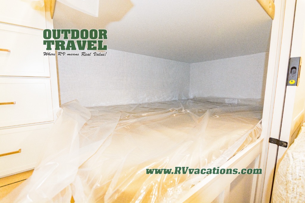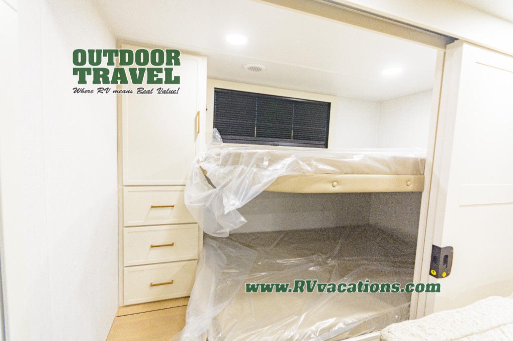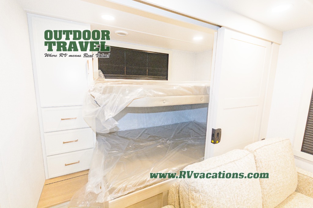 Grab the whole gang and head to the campground in this bunkhouse travel trailer! The 48" x 74" bunks can sleep two to four, and there is a floor to ceiling storage cabinet with drawers, a top bunk window, outlets and USB ports, plus double space-saving pocket doors. Up front you'll find the master bedroom with a 66" x 80" king bed and a MaxSpace Split-Level Wardrobe, TV prep, your own exterior entry door, plus quick access to the walk-thru bath. Everyone can meet in the combined kitchen and living room to relax on the theater seating or tri-fold sofa, and there is pull-out dining table with a drawer and a window above for great outdoor views. The outside is just as accommodating as the inside with its exterior speakers, LED chassis lighting, rear storage compartment with dual access doors, and exterior 12V refrigerator for cold drinks!