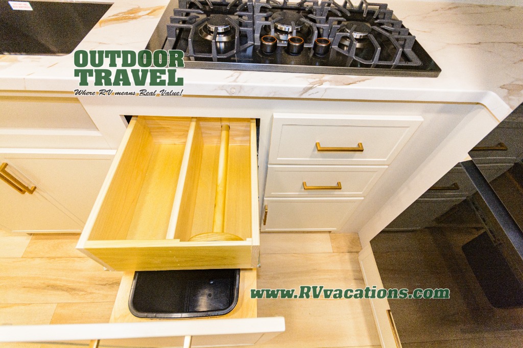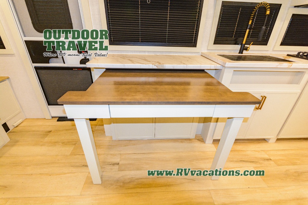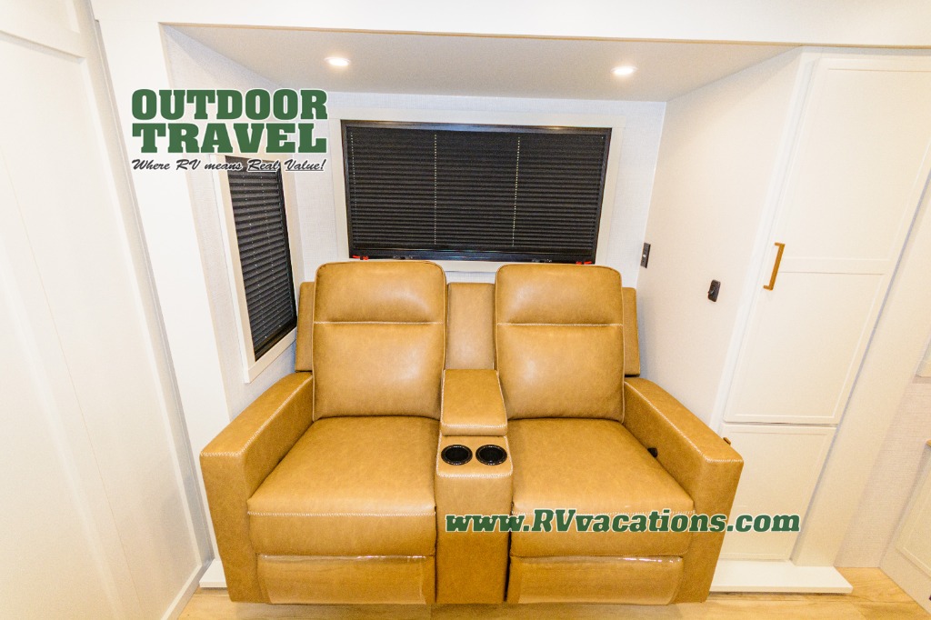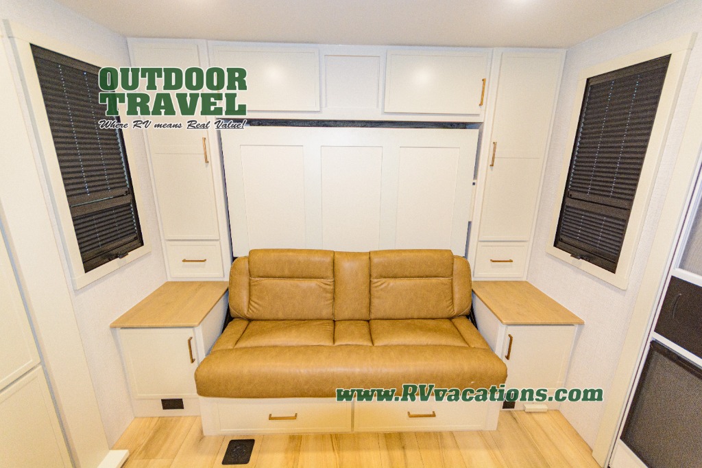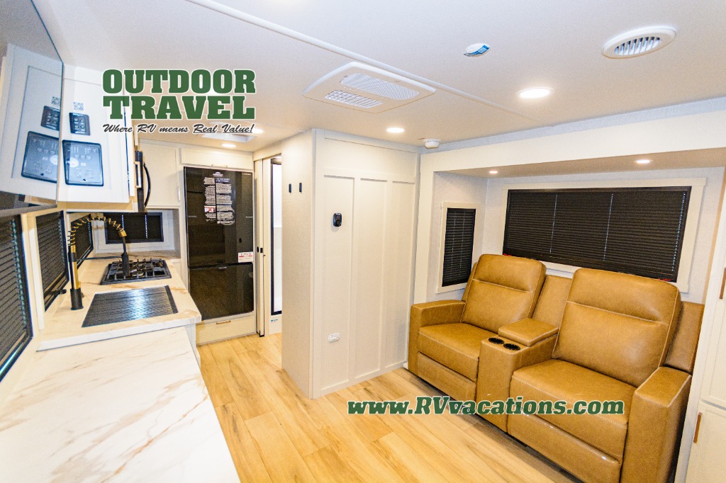 This is the perfect travel trailer for the couple looking for comfort at the campground! Once you've unloaded the pass-thru storage, you can put out the 16' patio awning and relax in your camp chairs. Head inside to make lunch in the fully equipped kitchen that includes a three-burner range, 30" convection microwave, and dishwasher prep. There is a pantry with outlets within the large slide out, along with a 10-cu. ft. refrigerator, plus theater seating across from the TV. And if you need sleeping space for guests, just choose the optional tri-fold sofa in place of the theater seating! You'll appreciate the front sofa plus a Feather-Lift bed system, providing seating space during the day and sleeping space at night! A pull-out table with a drawer provides a place to dine together, and a full bath on board will let you freshen up each day.