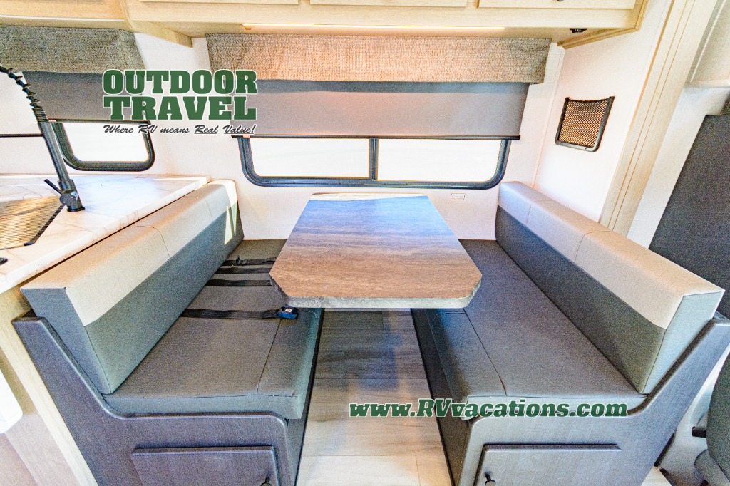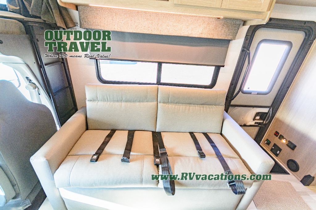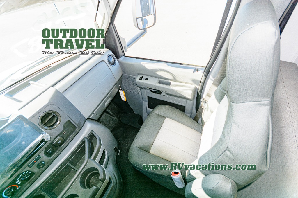 Start traveling in true luxury with this motorhome! The rear private bedroom has a queen bed to lay your head at night, a closet, and wardrobes on either side of the 12V TV. It also leads into the separated bathroom which has a 24" x 36" shower and toilet across from a sink with a medicine cabinet above it. The undermount 1.3 cu. ft. convection microwave will come in handy on those nights when you don't feel like cooking and the flip-up countertop will make your meal prepping easier. You can enjoy your meals at the booth dinette and lay down on the sofa to catch up on your book. The 60" x 80" bunk over cab mat offers a comfortable sleeping space but can be switched out for the optional Trekker cap with a built-in entertainment center!