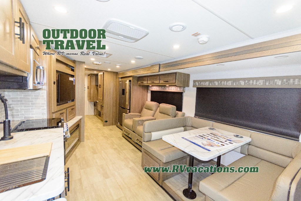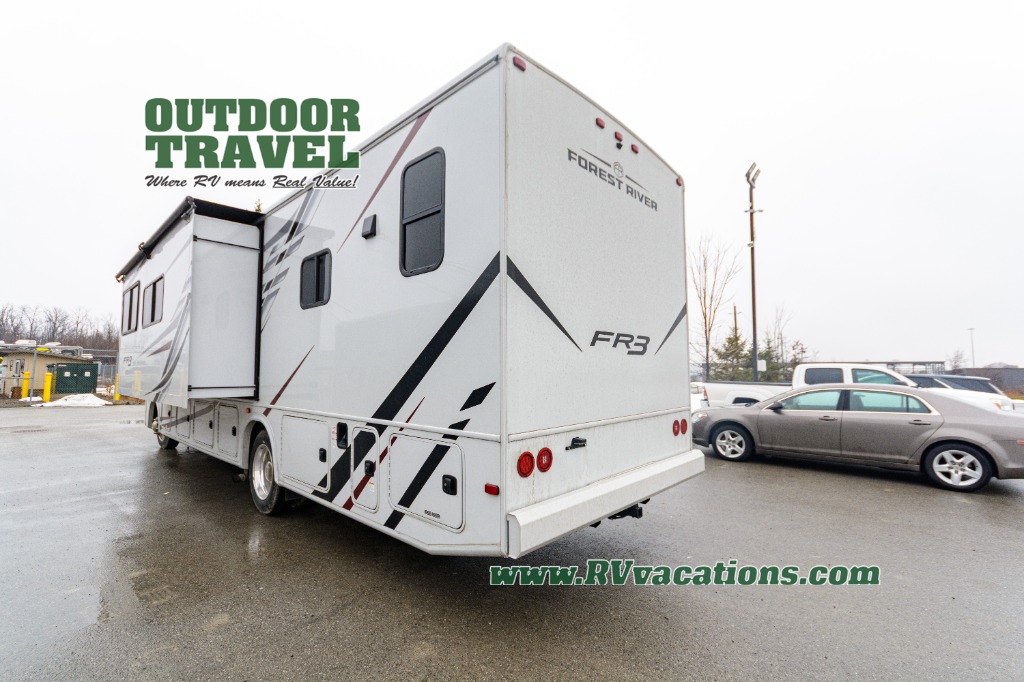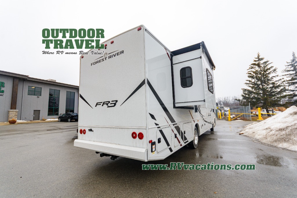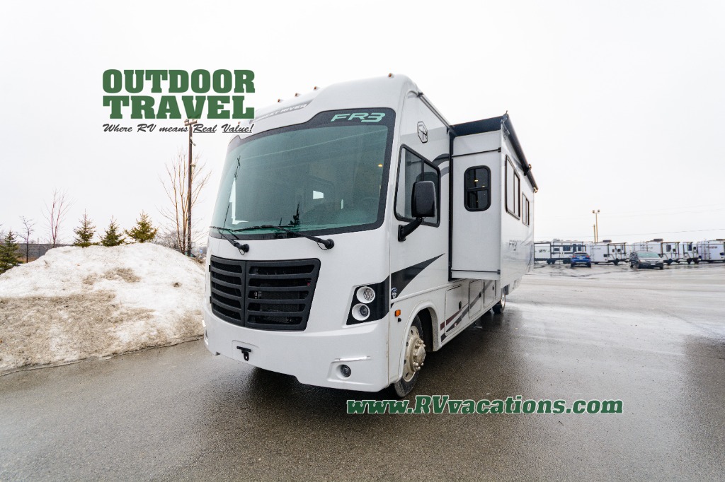 With each FR3 Class A gas motorhome by Forest River, you will find an easy-to-drive coach with a spacious interior allowing you to gather with friends and family with convenience and style found throughout! Each is built with vacuum-bonded construction, a one-piece fiberglass roof with extended rain spouts, a steel firewall and A-pillar extension, Bi-LED headlamps and lower LED fog lights, and grey Rotocast storage boxes with drains. Inside, you will enjoy black hardware, appliances, plumbing fixtures, and a glass shower door frame. You will also find a stainless steel kitchen sink with a bamboo cutting board and roll-up dryer, heavy-duty full-extension ball bearing drawer guides, dual-access dinette storage with doors, and nightstands with charging stations to keep your cellphones ready for whatever is next. Make your selection today!