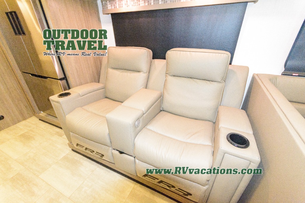 Spacious and inviting for couples or families, this FR3 Class A gas motorhome offers convenience throughout including a half bath for the kids and guests and a full rear bathroom for the owners. This full bathroom is located within the rear master suite where you will also find a king-size bed for relaxing. Once at your destination, you can quickly set up the power awning to relax outside while watching the exterior TV and visiting with other RVers. You might have decided to add the washer and dryer option in the bedroom, so a load of laundry might even get done. Once you are ready to fill your tummy, the full kitchen offers everything you need plus a residential microwave. You might even decide to relax on one of the theater seats after dinner as you watch the big game on the 40" LED 12V TV with a fireplace below.