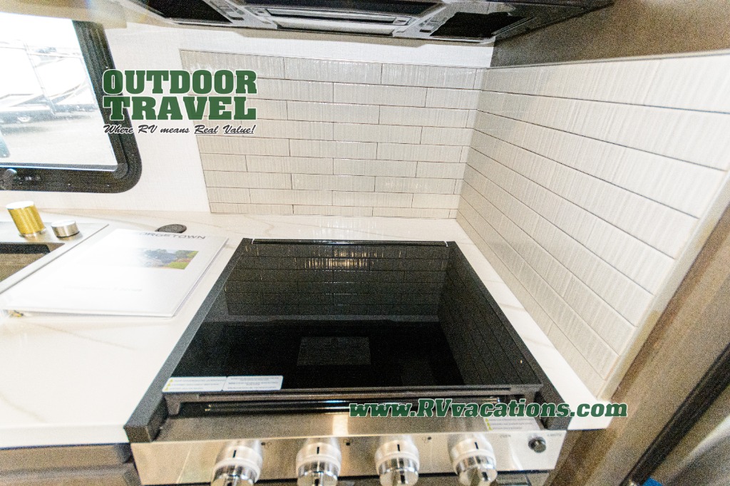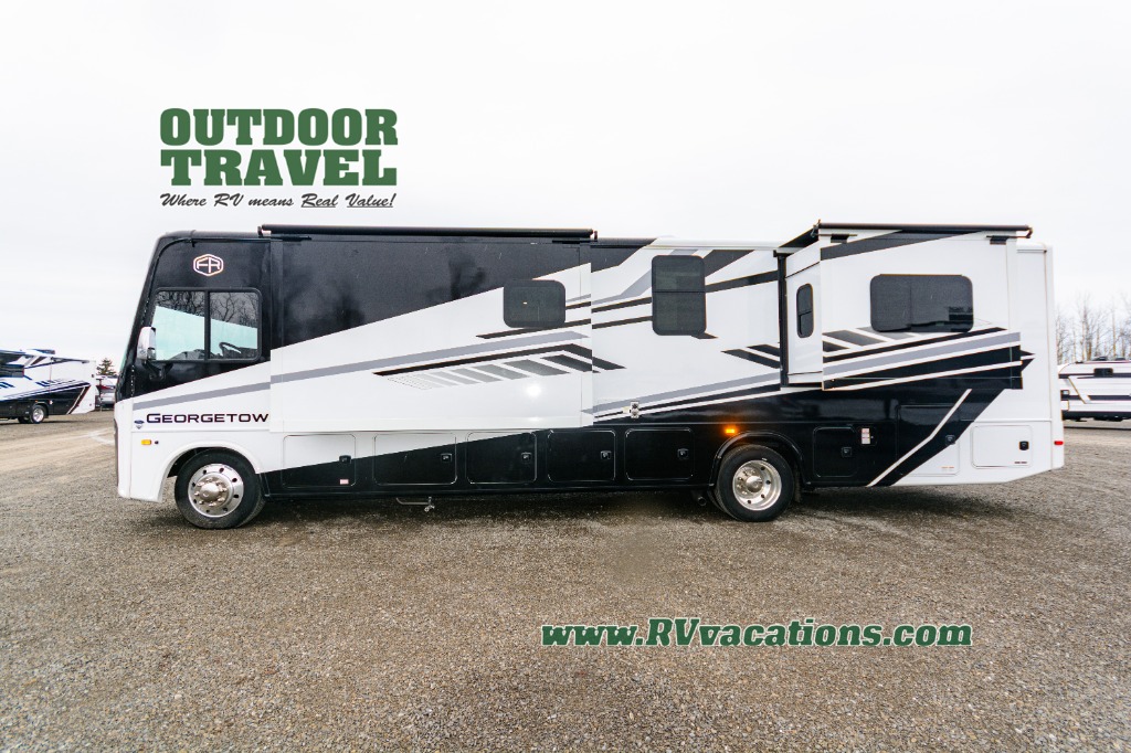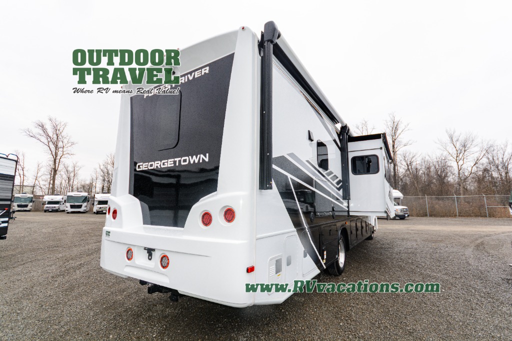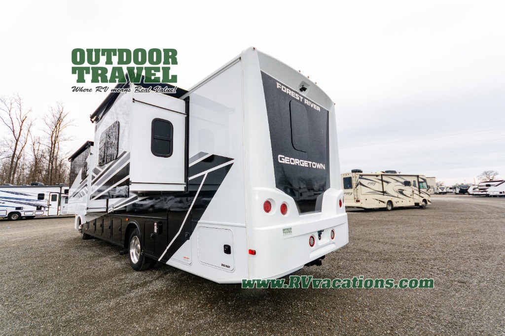A spacious design and true luxury come together to create these Forest River Georgetown 5 Series Class A gas motorhomes! Their solid surface kitchen countertops, day and night shades throughout, and designer bedspread will have you feeling right at home. The color side and rear cameras help to prevent any dings or bumps while you travel, and the automatic hydraulic leveling jacks will keep your unit leveled wherever you set up. Durable construction consists of a crowned roof, 2" aluminum framed vacuum bonded gel coated sidewalls, plus high density block foam insulation that will allow you to travel at any time of the year. You will appreciate the 50 Amp service, two house batteries, and 6,000-watt Yamaha generator to keep you powered up. An outside shower is also included on all models, along with rotocast storage compartments with drains, a power awning, and so much more!