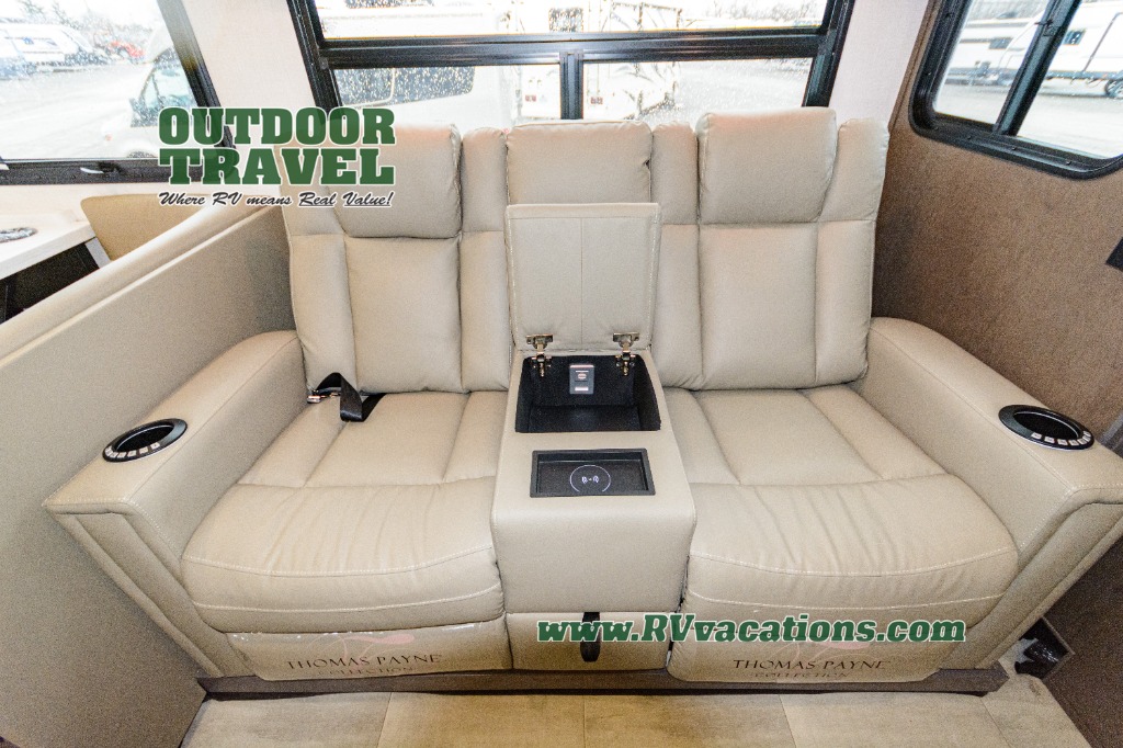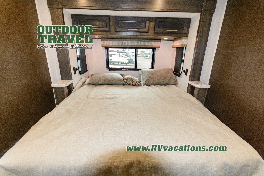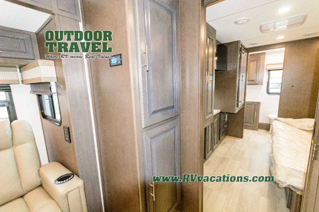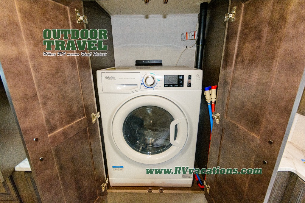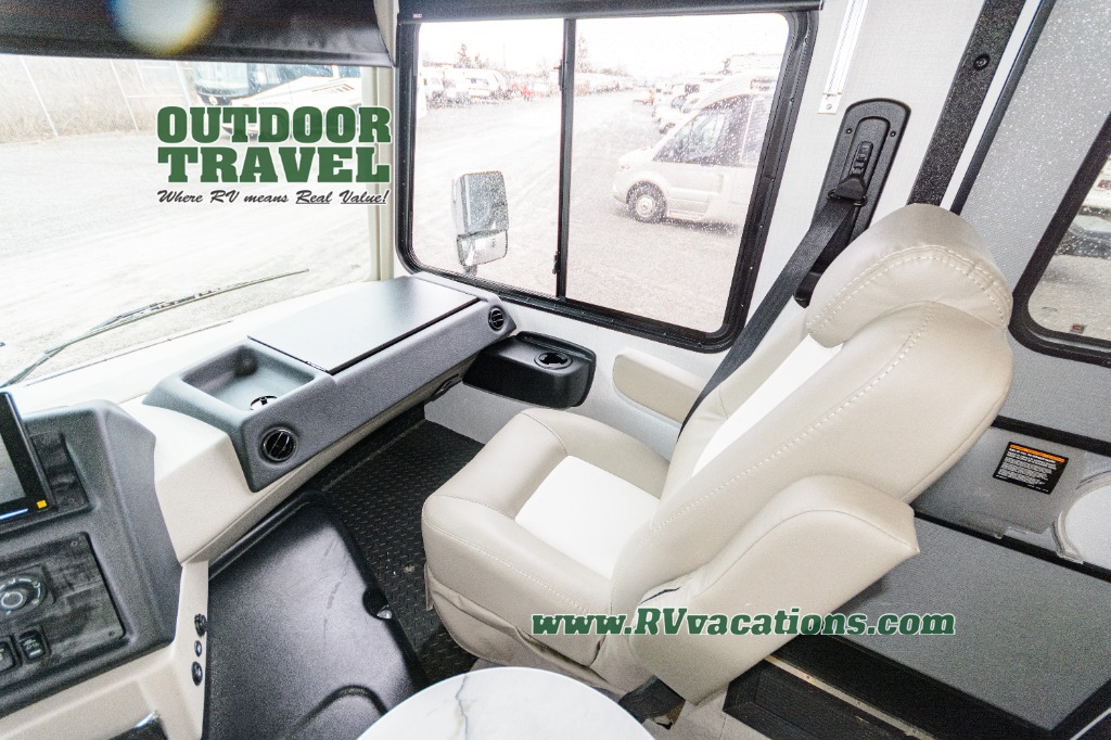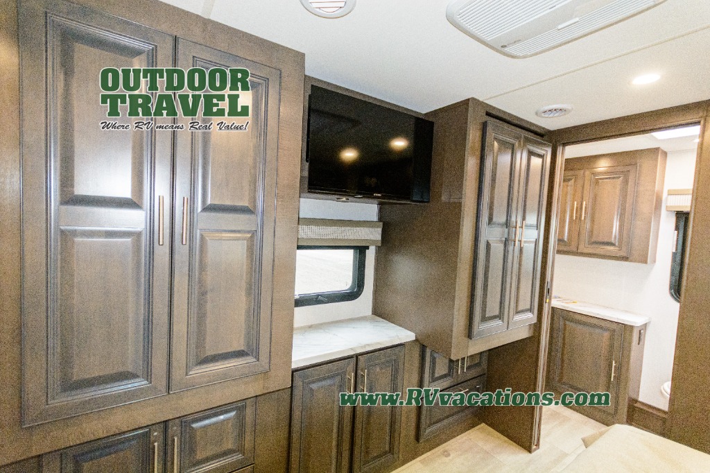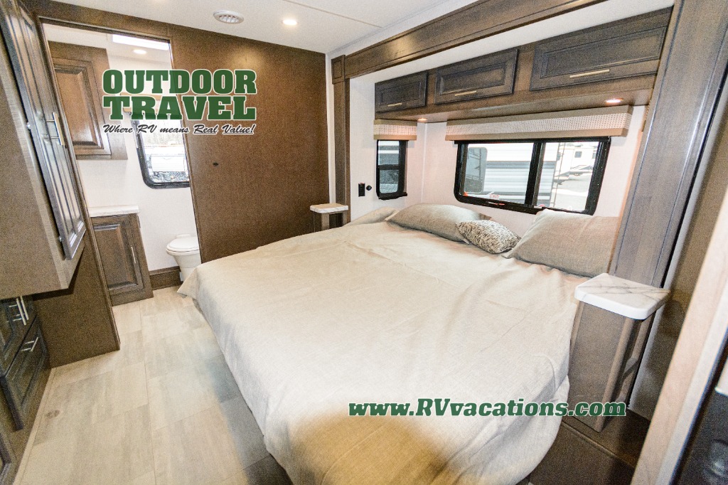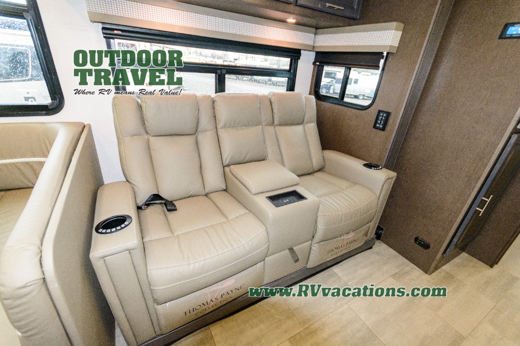 Three slides help to open up this motorhome! The kitchen slide features all of your essentials for cooking delicious meals and you even have a hutch with overhead cabinets to store all of your dishes. The Dream Dinette and Thomas Payne theater seating slide not only open up the living area but also provide comfortable places to eat meals and unwind in front of the 5,000 BTU fireplace and 40" LED TV after a long day of traveling. The half bathroom is close to the kitchen and living area, so you don't have to go far for a quick bathroom break. The master suite will have you feeling right at home with a 72" x 80" king bed slide to lay your head on at night with a dresser across from it that also has a 32" LED TV and wardrobes on either side of it with one of them with an optional washer and dryer. Plus, you even have access to the full rear bathroom which has a shower with a seat to freshen up in each morning!