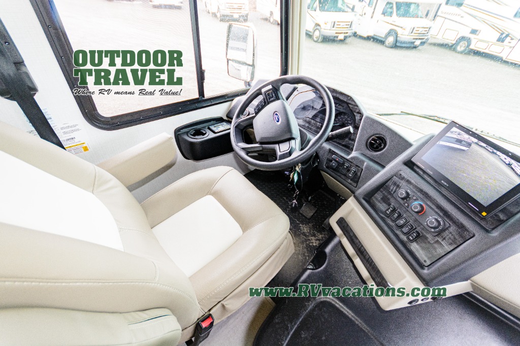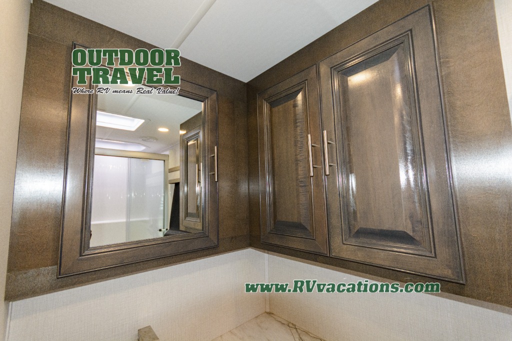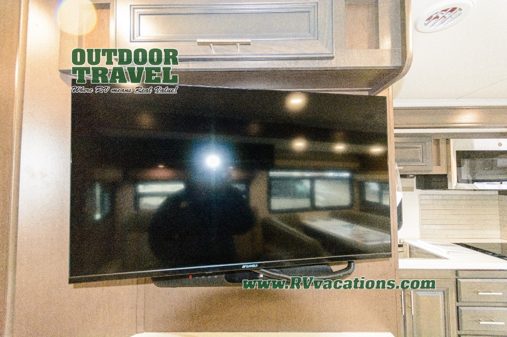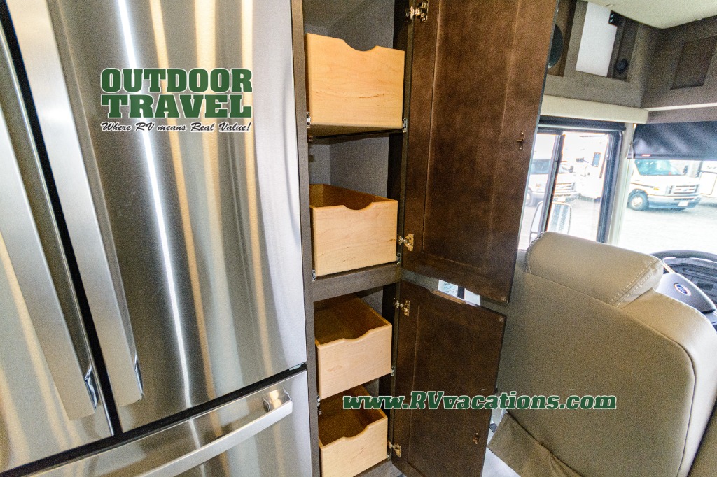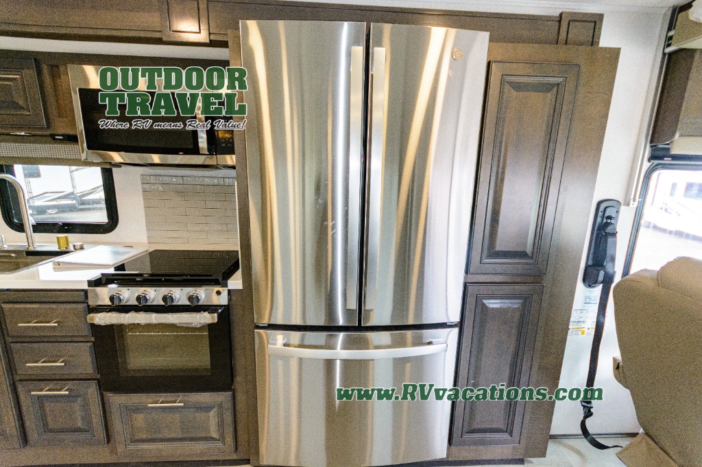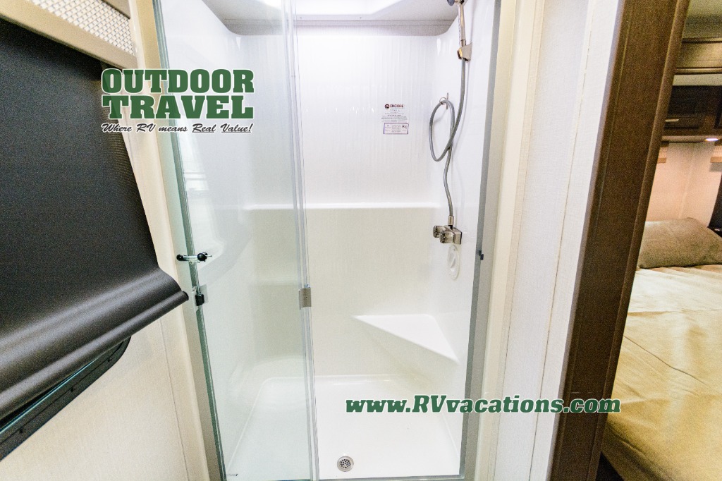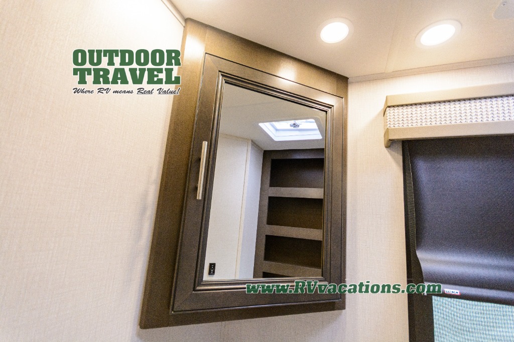 Three slides help to open up this motorhome! The kitchen slide features all of your essentials for cooking delicious meals and you even have a hutch with overhead cabinets to store all of your dishes. The Dream Dinette and Thomas Payne theater seating slide not only open up the living area but also provide comfortable places to eat meals and unwind in front of the 5,000 BTU fireplace and 40" LED TV after a long day of traveling. The half bathroom is close to the kitchen and living area, so you don't have to go far for a quick bathroom break. The master suite will have you feeling right at home with a 72" x 80" king bed slide to lay your head on at night with a dresser across from it that also has a 32" LED TV and wardrobes on either side of it with one of them with an optional washer and dryer. Plus, you even have access to the full rear bathroom which has a shower with a seat to freshen up in each morning!