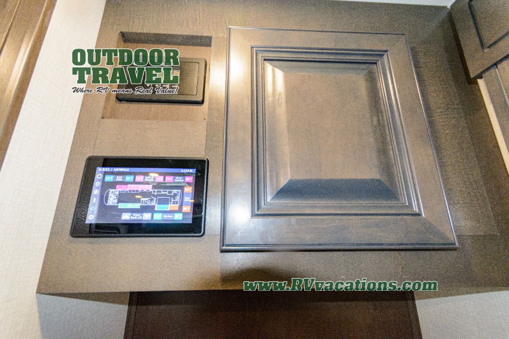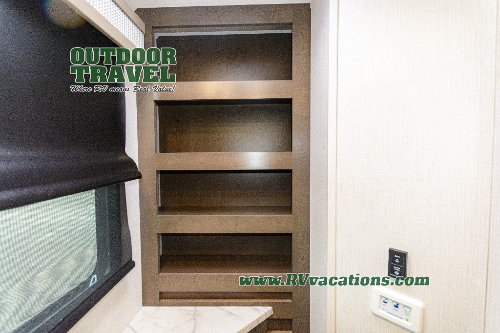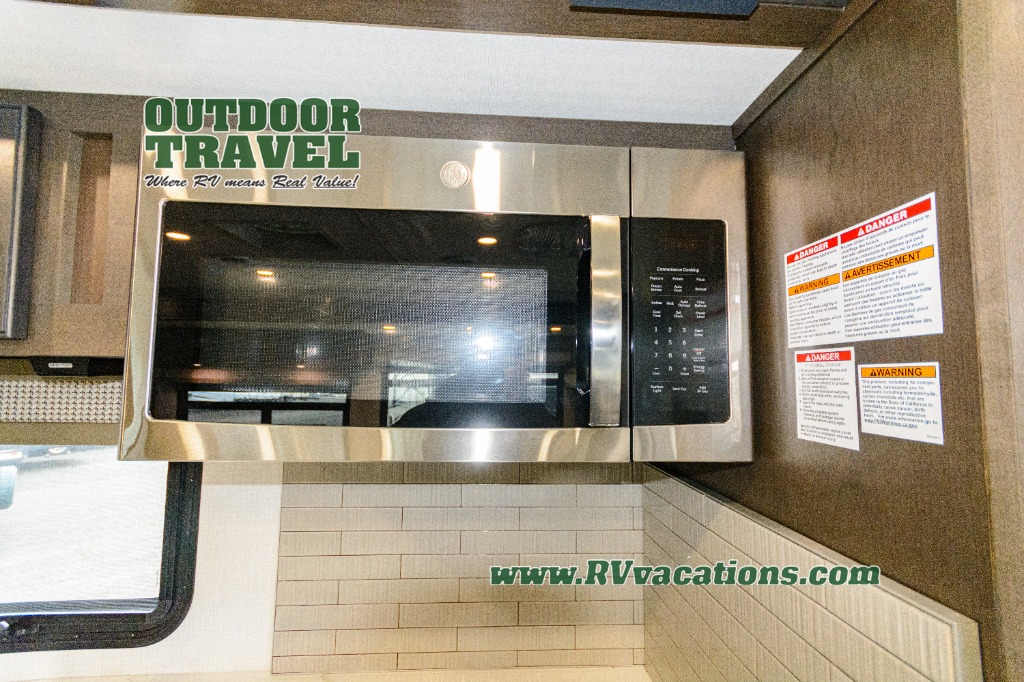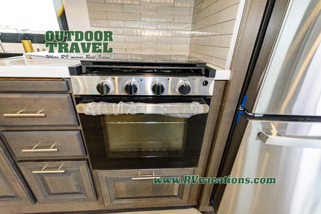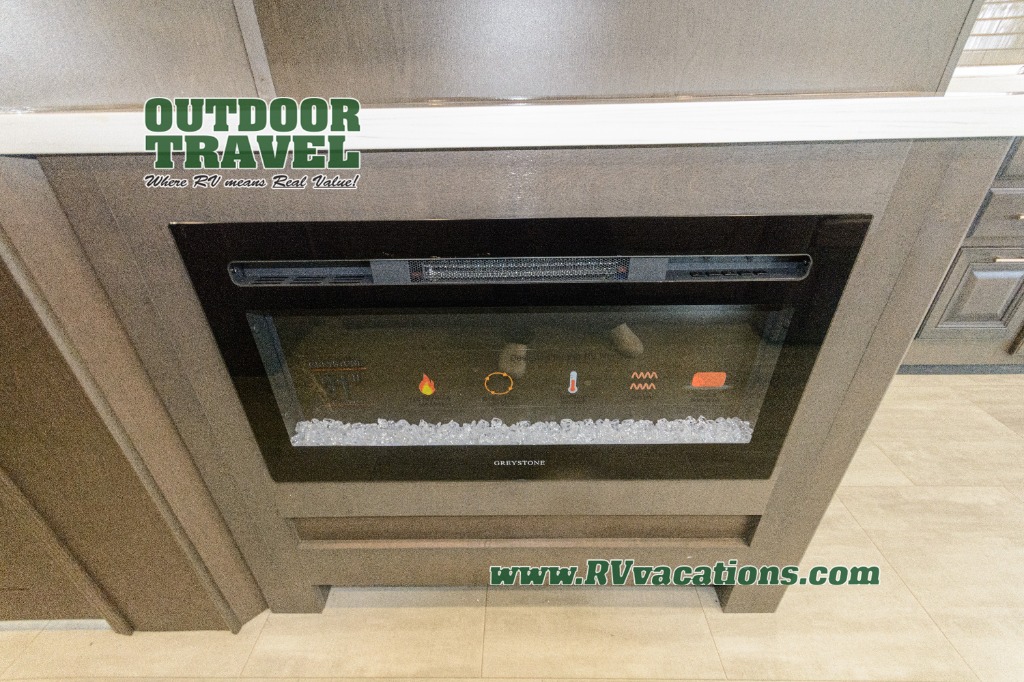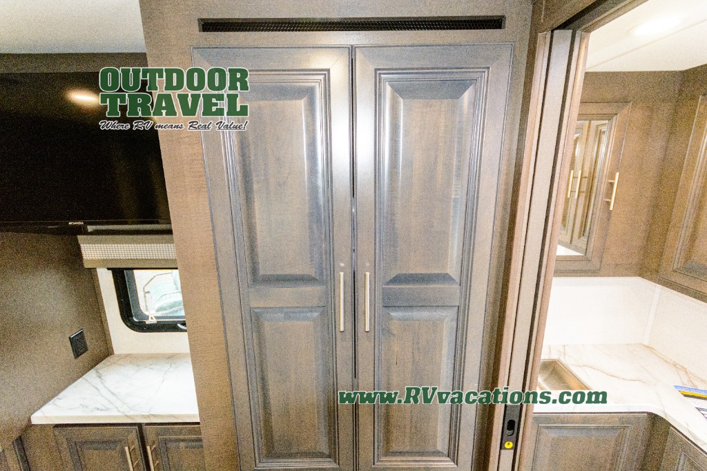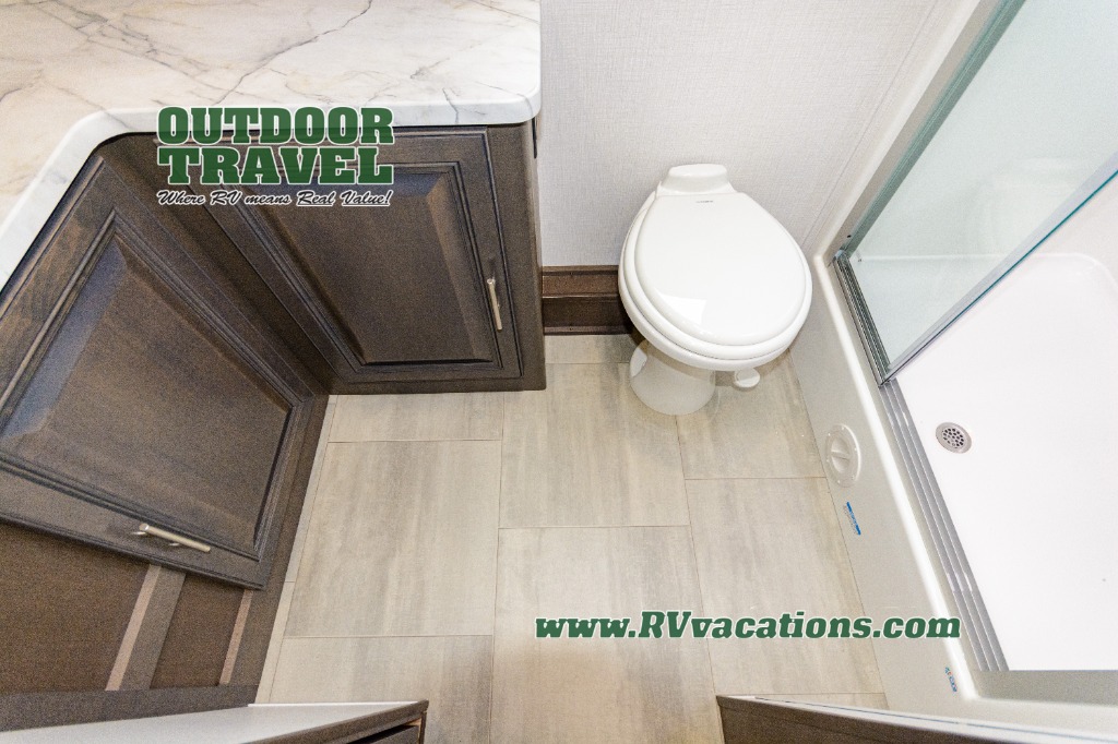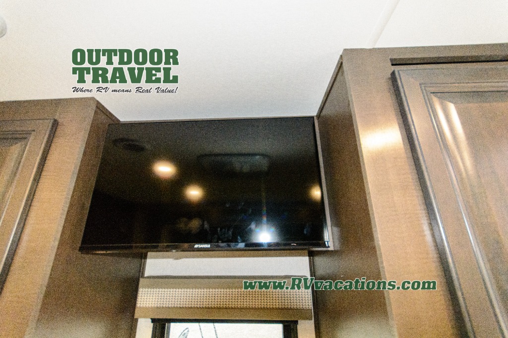 Three slides help to open up this motorhome! The kitchen slide features all of your essentials for cooking delicious meals and you even have a hutch with overhead cabinets to store all of your dishes. The Dream Dinette and Thomas Payne theater seating slide not only open up the living area but also provide comfortable places to eat meals and unwind in front of the 5,000 BTU fireplace and 40" LED TV after a long day of traveling. The half bathroom is close to the kitchen and living area, so you don't have to go far for a quick bathroom break. The master suite will have you feeling right at home with a 72" x 80" king bed slide to lay your head on at night with a dresser across from it that also has a 32" LED TV and wardrobes on either side of it with one of them with an optional washer and dryer. Plus, you even have access to the full rear bathroom which has a shower with a seat to freshen up in each morning!