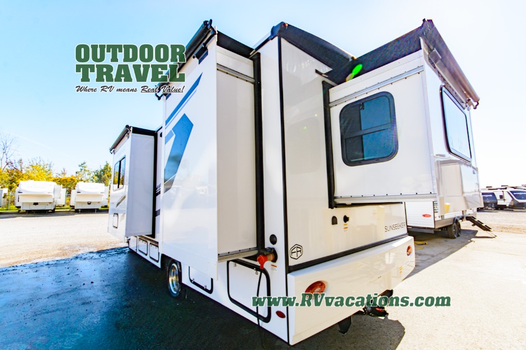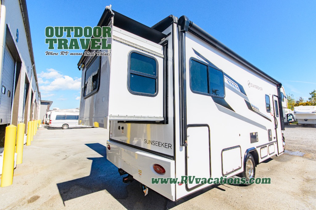 With any Sunseeker Classic Class C gas motorhome by Forest River, you will enjoy more features and quality construction at a great value! Each model comes standard with a fiberglass roof and 2" aluminum framed laminated sidewalls for maximum durability. The Winegard Air 360+ digital antenna is your all-in-one solution for your internet, TV, and FM signal needs, and you have Gateway 4G Wi-Fi capability too. The exterior has an outside shower, heated/enclosed tanks, Rotocast storage compartments, and a power awning with an LED light strip to name a few conveniences. Each drive will be made easy thanks to a 10" touchscreen CarPlay/Android radio with USB and Bluetooth, backup camera/side view cameras with a 3-way monitor, and Ultraleather seating for added comfort. You'll also love the black out roller shades, soft touch self-closing drawer guides, oxygen-infused shower head with a flexible extension, and many more interior comforts!