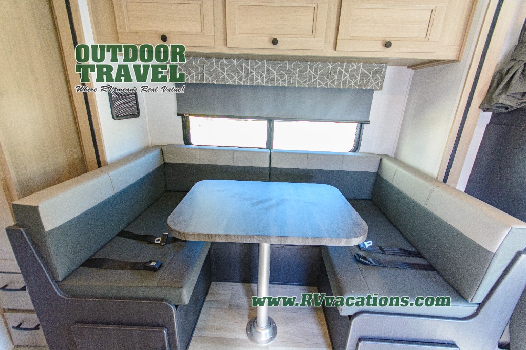 This Sunseeker Classic Class C gas motorhome has a rear private bedroom that holds the queen-size bed on a unique rear slide out. The bedroom also has its own 12V TV and wardrobe slide, so you have extra space without adding travel length. Another slide holds the U-shaped dinette out in the main living area, and you can watch the second LED TV out there. The bathroom has the toilet and 24" x 36" shower on one side of the coach and the medicine cabinet and sink on the other side so two people can freshen up at once. The kitchen has everything needed for a full weekend of delicious meals with the pantry, convection microwave, flip-up countertop, and 10.7-cubic foot refrigerator.