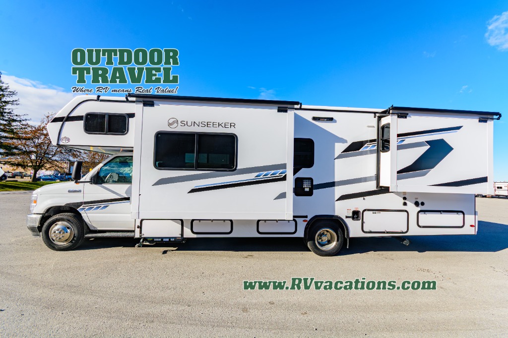 Grab your sunhat and your adventurous spirit and head out with this Sunseeker Classic Class C gas motorhome! There is a rear private bedroom to change your clothes and sleep soundly, and the RV queen bed slide adds more space to this area. The split-style bathroom has a 24" x 36" shower on one side of the coach while the lavatory and vanity stay secluded on the other side. If you don't need the extra sleeping space from the bunk over the cab, you can choose to add the optional Trekker cap with a built-in entertainment center and storage in its place. Sit back with a big bowl of cereal at the booth dinette, or get a little more comfortable on the sofa. You can also go outside to prepare some heartier food at the outdoor kitchen.