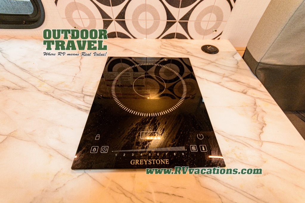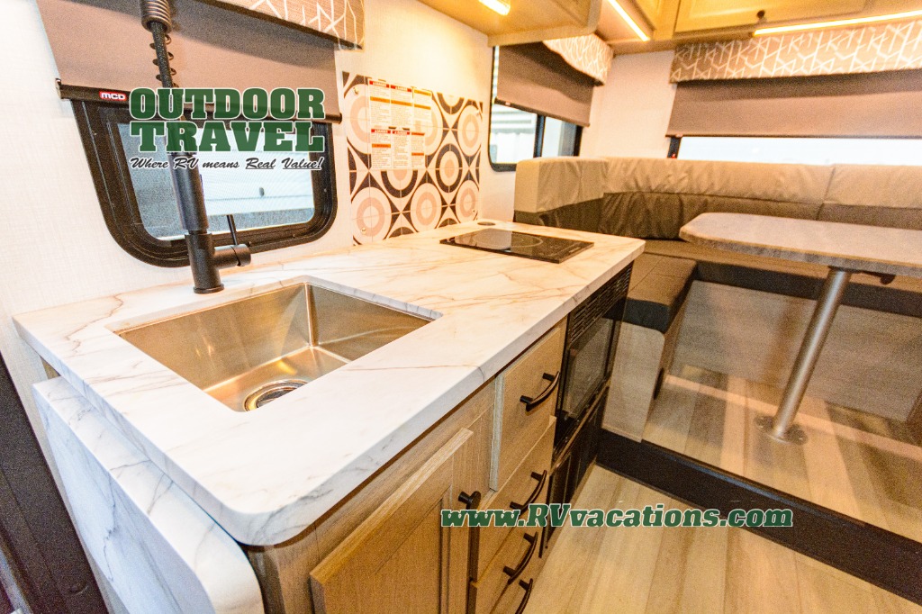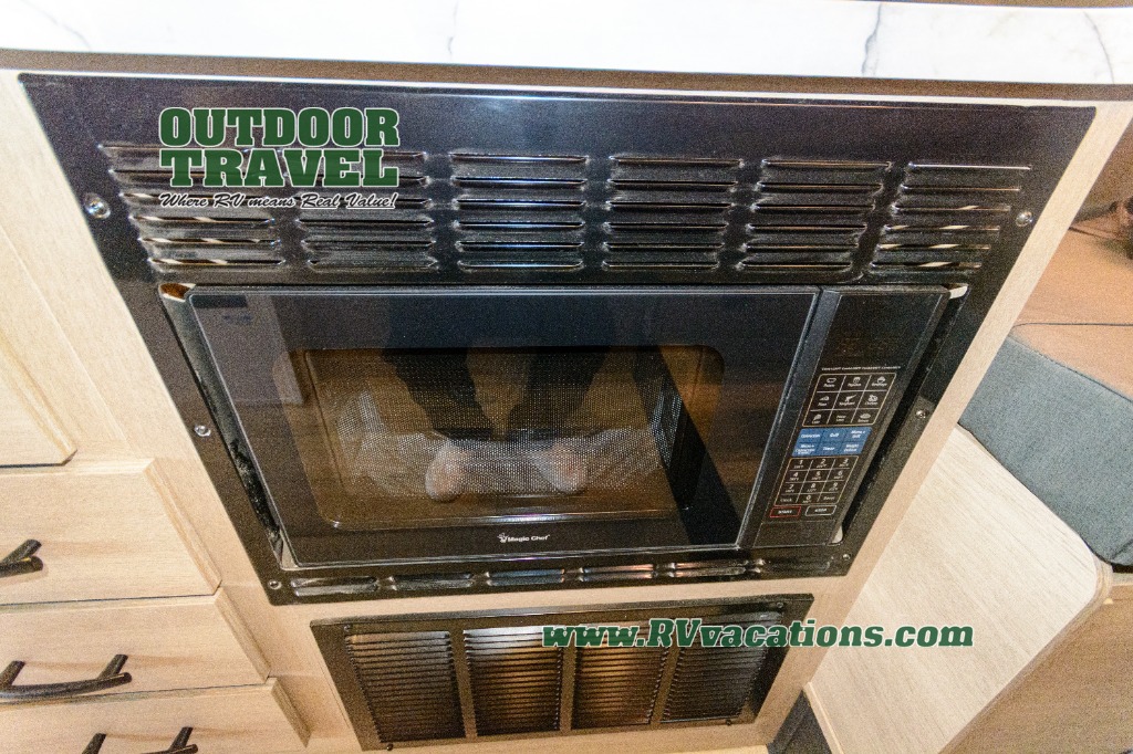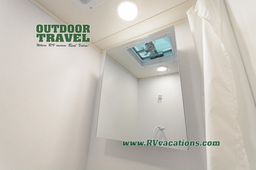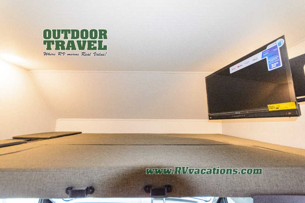 Upon entering this unit, you’re greeted by a spacious 60" x 80" cab-over bunk, providing plenty of comfortable sleeping space for family or guests. Near the entrance, a swing-arm 12V TV lets you enjoy your favorite shows and movies while on the road. Moving toward the center, you’ll find a pantry and a 10.7 cu. ft. refrigerator, perfect for storing both fresh groceries and dry goods. Adjacent to it is the well-designed wet bath, equipped with an oxygen-infused showerhead and flexible extension for a refreshing experience, complemented by a shower skylight and electric roof fan for added light and ventilation. Across the way, the kitchen comes fully equipped with a recessed two-burner range and flush glass cover, a convection microwave/air fryer, and a flip-up countertop that expands your workspace, making meal prep easy and efficient. At the rear, the inviting U-shaped dinette offers a cozy spot to relax, dine, or gather with friends, and at night, it effortlessly converts into an additional sleeping area so you can rest in complete comfort.