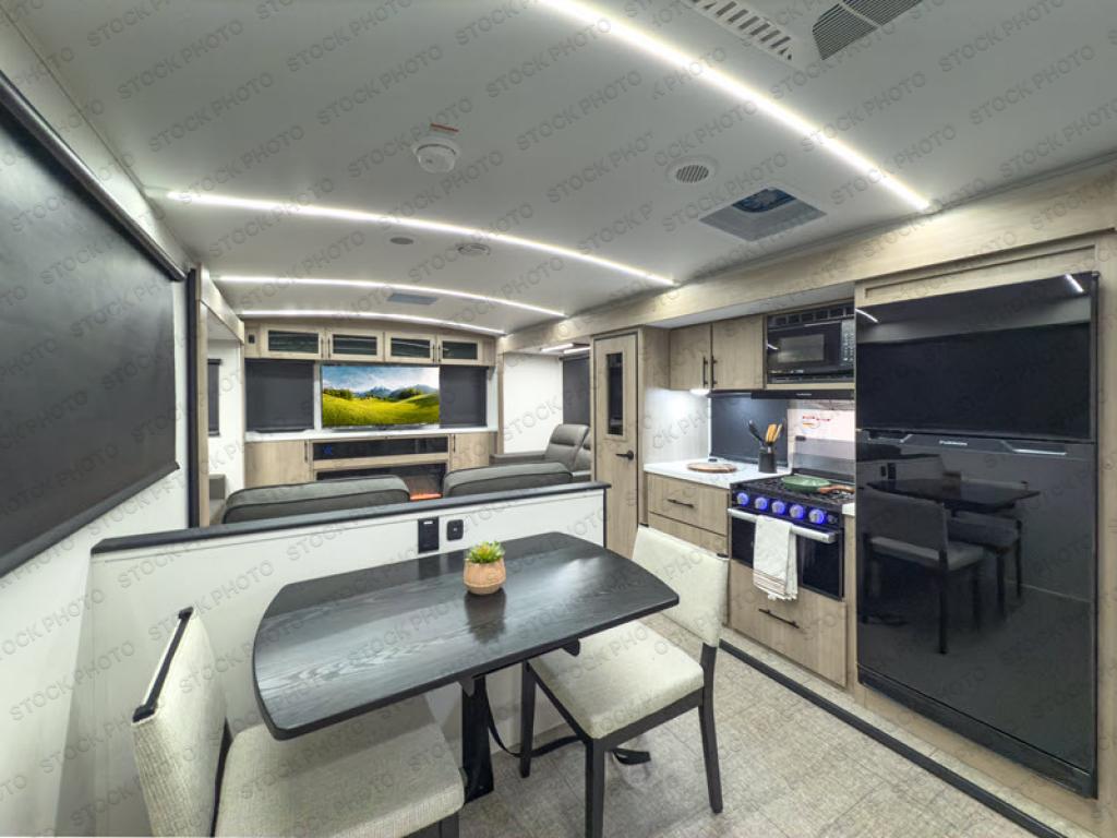 The rear living room on this Imagine travel trailer is just what you'll want when you're looking for a little down time. This room has opposing tri-fold sofas within slides, theater seating, and a TV. Another place that you can sit down at is the free-standing adjustable dinette. You can sit here with a fresh cup of coffee in the afternoon as you map out your hike for tomorrow. The kitchen offers you a flip-up countertop extension, a microwave, a three-burner range with oven, a 10-cubic foot 12V refrigerator, and pantry to help you make meals, and there is a private bedroom with a 60" x 80" bed to rest on at the end of the day.