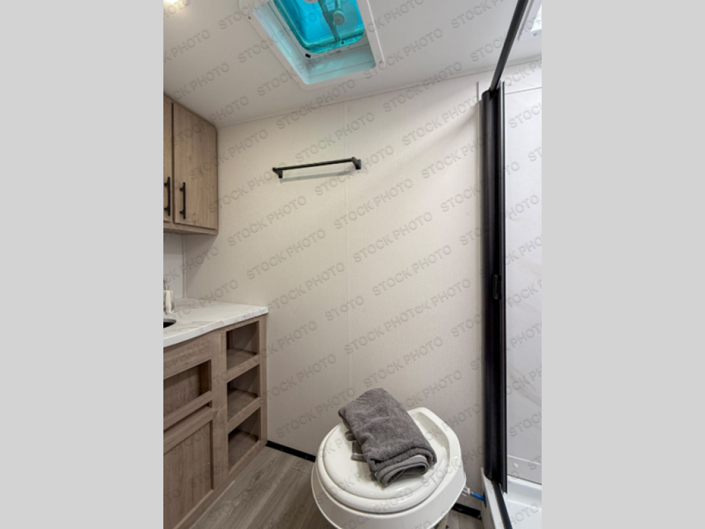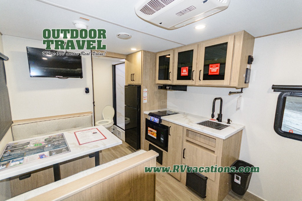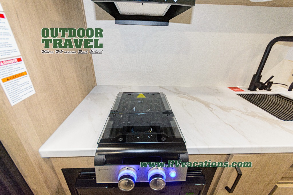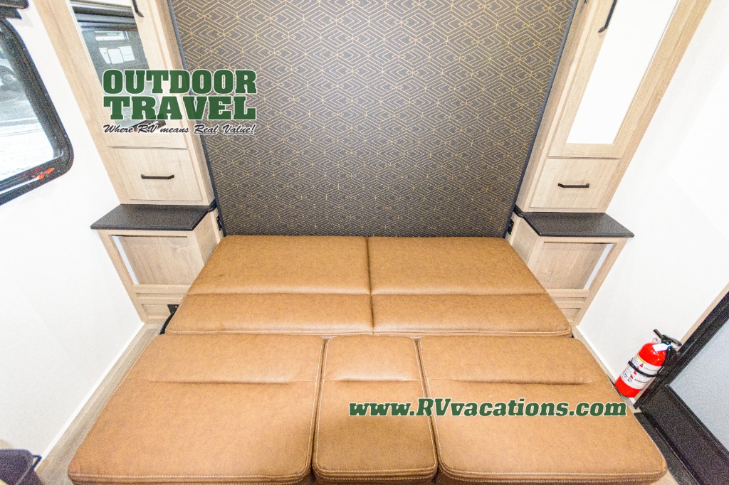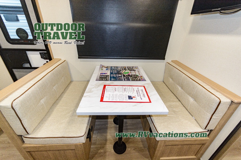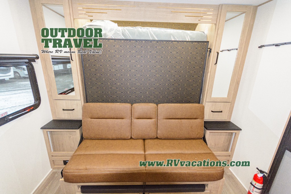 Start looking for your favorite campground to take this travel trailer to! After a fun day at the beach, you can rinse the sand out of your hair with the walk-in shower with a skylight in the full rear bathroom. Depending on what time you enter the unit will determine whether you see the Murphy bed or sofa with shoe storage underneath and wardrobes on either side of it. The booth dinette is not only great for enjoying meals prepared with the two-burner cooktop, but also for transforming into an extra sleeping space!