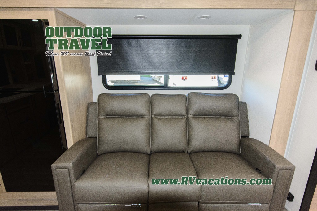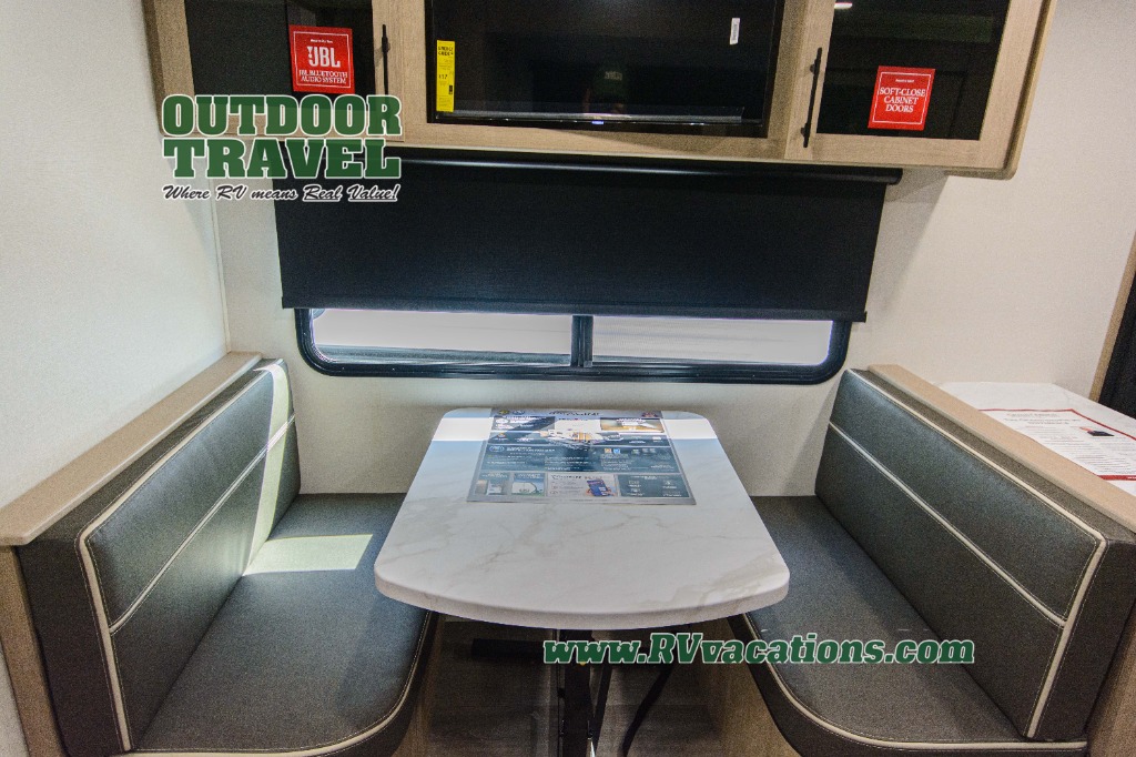 Treat yourself to a weekend of fun in this Imagine XLS travel trailer! Whether it's just you and your spouse, or you've chosen to bring along a group of friends, this trailer will meet the need. The front bedroom can sleep two people on the walk-around queen-size bed. The bedroom is quite functional because it not only contains the second exterior entry door, but it also has a private entrance into the walk-through bathroom since it is located on the other side of the bathroom. The booth dinette is functional too because it can transform from a dining location into a sleeping location, and the theater seating is directly across from the LED TV for easy viewing.