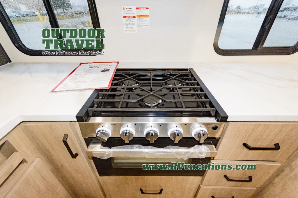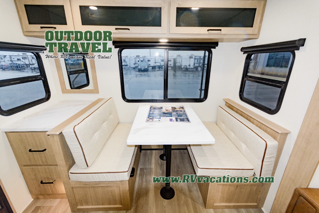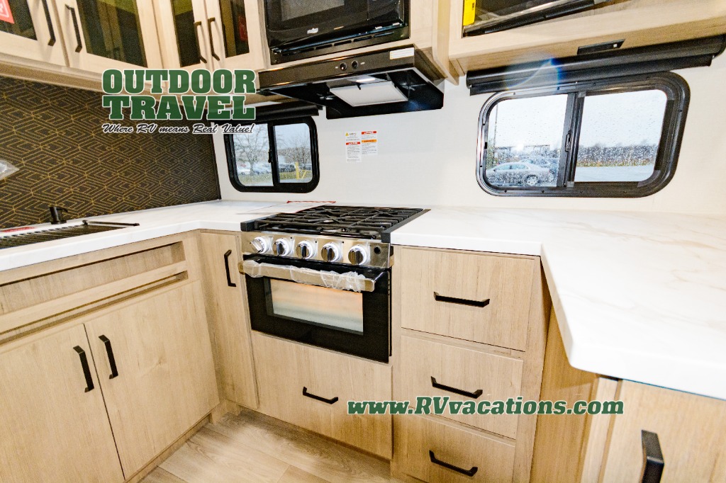 This 25RLE model travel trailer is designed for both comfort and convenience from front to back. At the front, the private bedroom features a spacious 60" x 80" queen bed with built-in wardrobe cubby storage and one of two entry doors for easy access. Moving down the hall, the full bathroom offers a residential-style walk-in shower with a skylight that adds both light and headroom, along with a mirrored medicine cabinet and linen shelves for towels and toiletries. The main living area opens up with a large slide out that houses 60" theater seating and a 10-cu. ft. refrigerator for all your fresh groceries, while a nearby pantry keeps your dry goods organized. Across from the slide, the U-shaped kitchen provides ample counter space, a three-burner range with oven, stainless steel sink, and microwave, everything you need to cook in comfort. At the rear, the booth dinette creates the perfect spot for meals or games and easily converts into an extra-sleeping area when needed.