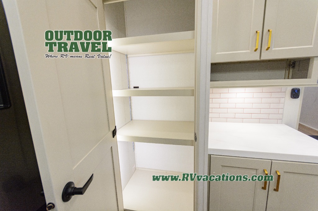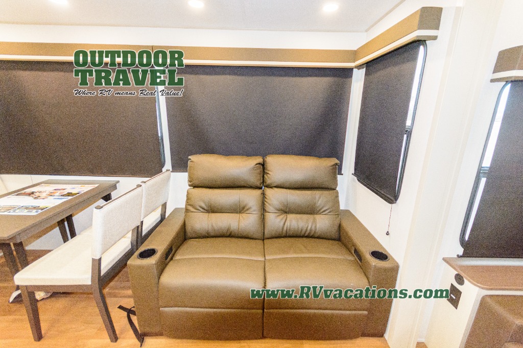 You'll feel right at home in this spacious fifth wheel with triple slides, a front master bedroom, and a kitchen island with extra counter space. The theatre seating is right across from the entertainment center which includes a 40" TV and fireplace, and there is a rear tri-fold sofa if you have any guests staying over. This model includes a hutch in the kitchen with cabinets above to store you nice dishes, plus there is a large pantry with washer and dryer prep if you plan to go full-time. Head to the dual entry bath that includes a linen closet and a spacious shower, and check out the front master bedroom with its queen bed, and slide out wardrobe. You can choose the optional king bed if you enjoy a bit more room in bed!