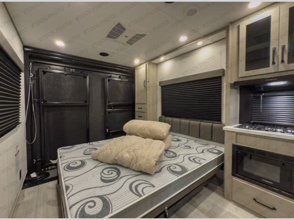 Get ready to take your adventures to the next level with this amazing toy Hauler. A spacious interior features a queen-sized murphy bed, perfect for relaxing after a long day of exploring. A convenient microwave and three-burner cooktop offer endless culinary possibilities, while a 12V 8cu. refrigerator keeps your essentials at the perfect temperature. Ample overhead cabinets provide additional storage for gear, cookware, and more. At the front of this toy hauler, a full bathroom with a closet provides a private retreat, and the ramp door/patio offers easy access to your toys and outdoor living space. Plus, a 13' awning offers shade and protection from the elements.
