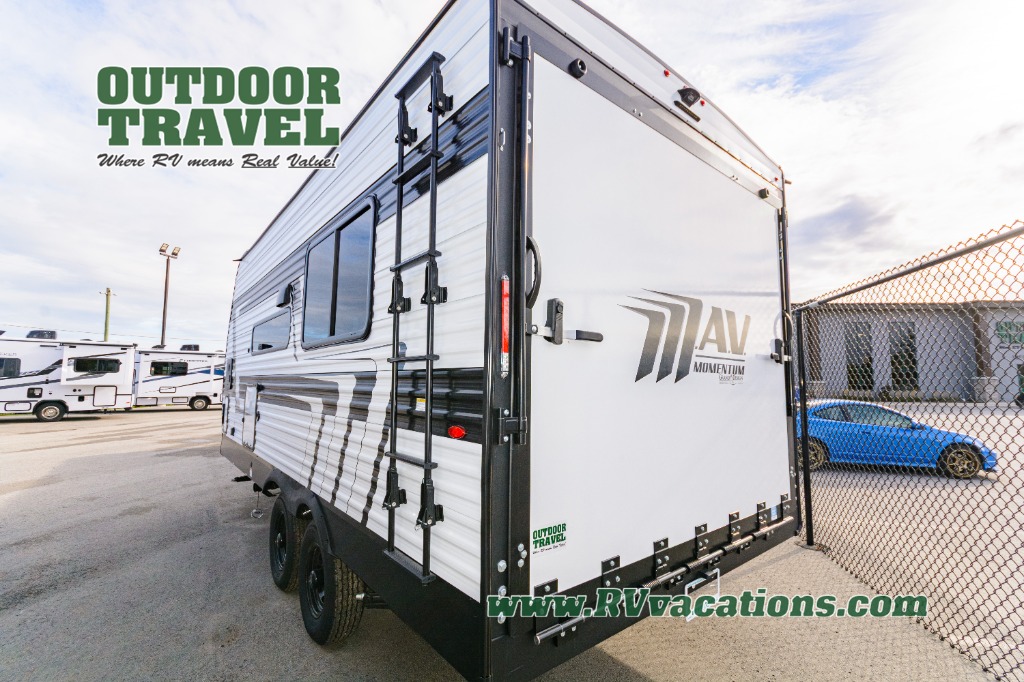 The Momentum MAV toy hauler travel trailers by Grand Design are designed to provide exactly what you need. The spacious garage provides tons of cargo space, with no wheel wells to get in the way. Additional storage includes magnetic storage door catches, and overhead consoles throughout. Conveniences like motion sensor lights and USB outlets will make your life easier, and you will be comfortable in all seasons with the 30K BTU furnace plus 15K BTU ducted air conditioning. The standard Solar Package comes with a 180W solar panel, a 40 Amp charge controller with Bluetooth, and a 12V refrigerator so you can go off-grid when the adventure calls for it.