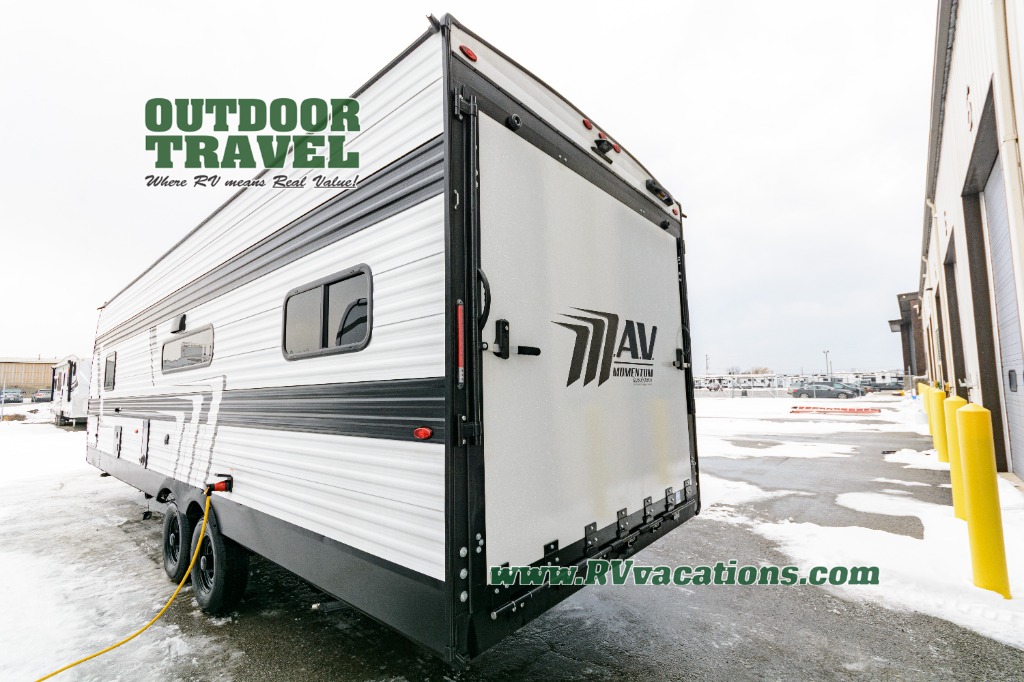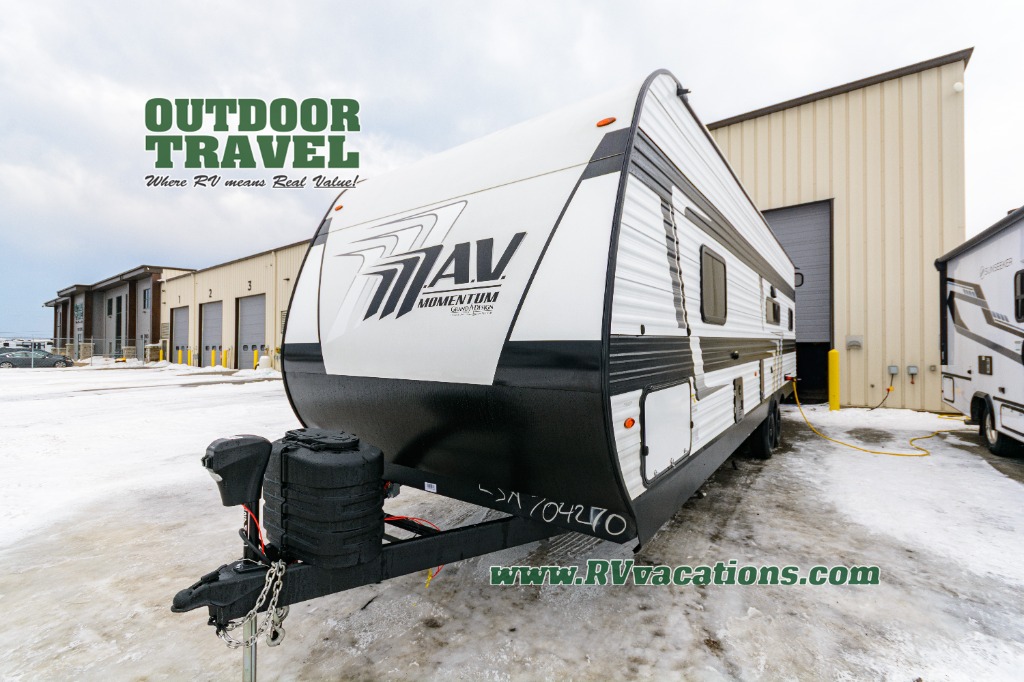 The Momentum MAV toy hauler travel trailers by Grand Design are designed to provide exactly what you need. The spacious garage provides tons of cargo space, with no wheel wells to get in the way. Additional storage includes magnetic storage door catches, and overhead consoles throughout. Conveniences like motion sensor lights and USB outlets will make your life easier, and you will be comfortable in all seasons with the 30K BTU furnace plus 15K BTU ducted air conditioning. The standard Solar Package comes with a 180W solar panel, a 40 Amp charge controller with Bluetooth, and a 12V refrigerator so you can go off-grid when the adventure calls for it.