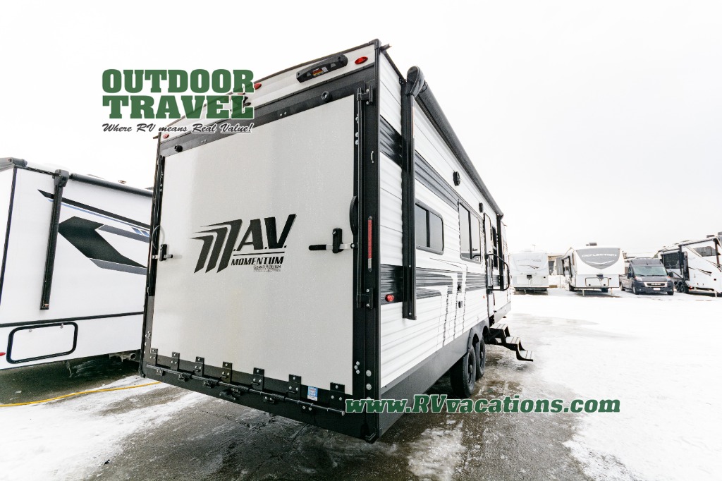You will love this Momentum MAV toy hauler travel trailer! The front bedroom features a queen bed, and there is plenty of room to walk around. The sliding solid bedroom door helps with space. Overhead storage and a pair of nightstands are convenient storage, plus there is a wardrobe with both drawers and space to hang items. The kitchen offers a microwave, stainless steel sink, and an 8 cu. ft. 12V refrigerator. In the garage, you'll find rollover sofas with a table and a top bed for guests to sleep on. The ramp door/patio will provide additional living space once your toys are unloaded, and the pull down screen will keep bugs out!