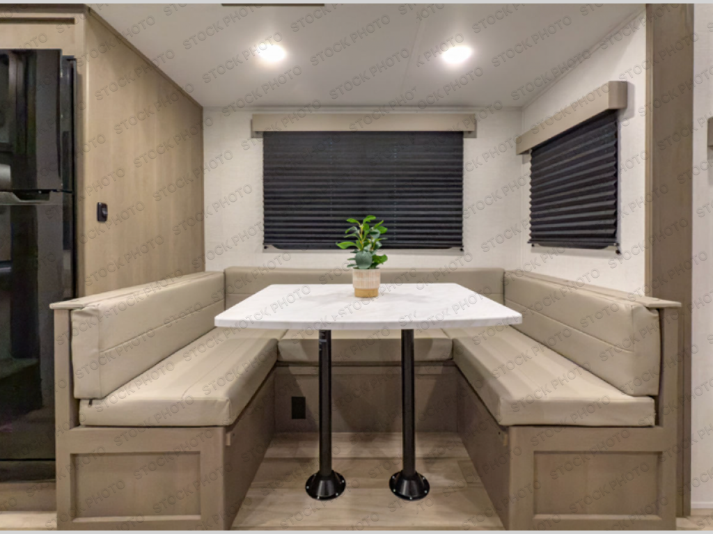 Camping with friends and family just got a whole lot easier in this fifth wheel with double-size bunks and a front private bedroom. Your guests will also have a wardrobe to keep their things tidy, and the bedroom closet will be perfect for your things. If you have other guests stay over, they can sleep on the U-shaped dinette within the slide out or the tri-fold sofa, and there is a 40" high-definition LED TV here to keep everyone entertained on rainy days. Everyone can take turns cleaning up in the full bath that includes a residential walk-in shower, a power vent fan, plus a large vanity top with a deep sink. And you will feel right at home in the front private bedroom with its queen bed, overhead cabinets, and TV prep if you'd like to add a television!