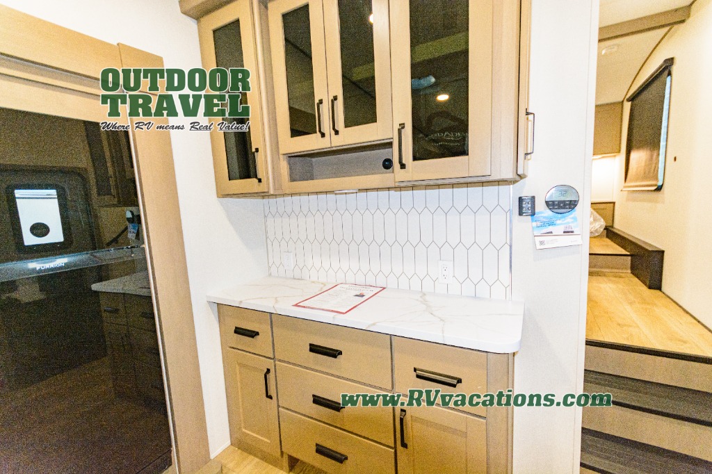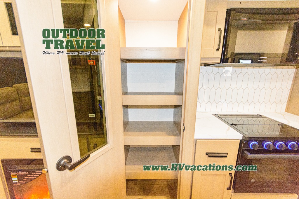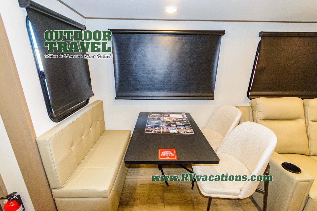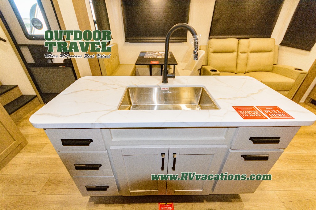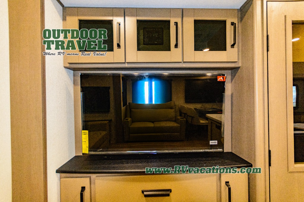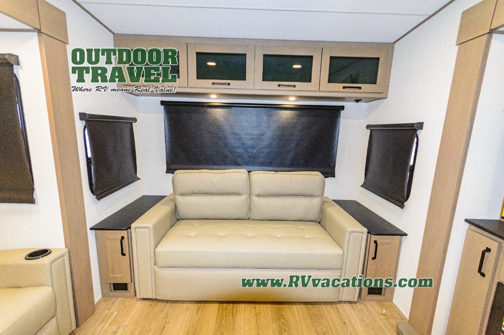 Get ready to enjoy everything the campgrounds and surrounding area has to offer when you are setup to camp in this fifth wheel! The two electric awnings offer protected areas creating outdoor living spaces; just grab your camping chairs from the unobstructed pass-through storage. And the interior offers a spacious living area and kitchen combination with dual opposing slides for maximum space. You can sit on the tri-fold sofa or the dinette to lounge back and rest after a day of adventure. The hutch and kitchen island offer counter space to prepare and serve meals, and there is a large pantry for goodies. The 40" LED HDTV with a fireplace below provides entertainment before bedtime or on a rainy day. And the front bedroom offers privacy, a walk-around queen bed, and plenty of storage!