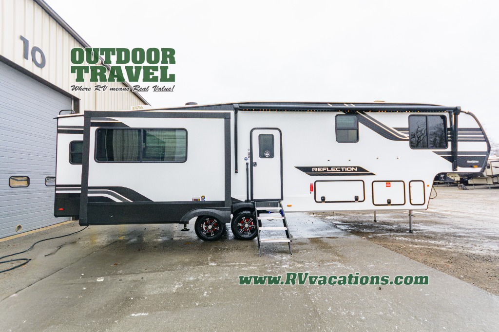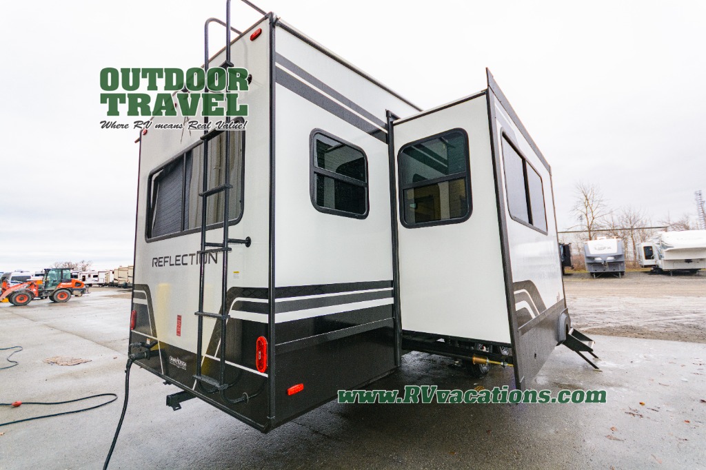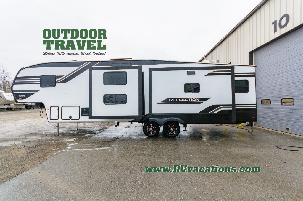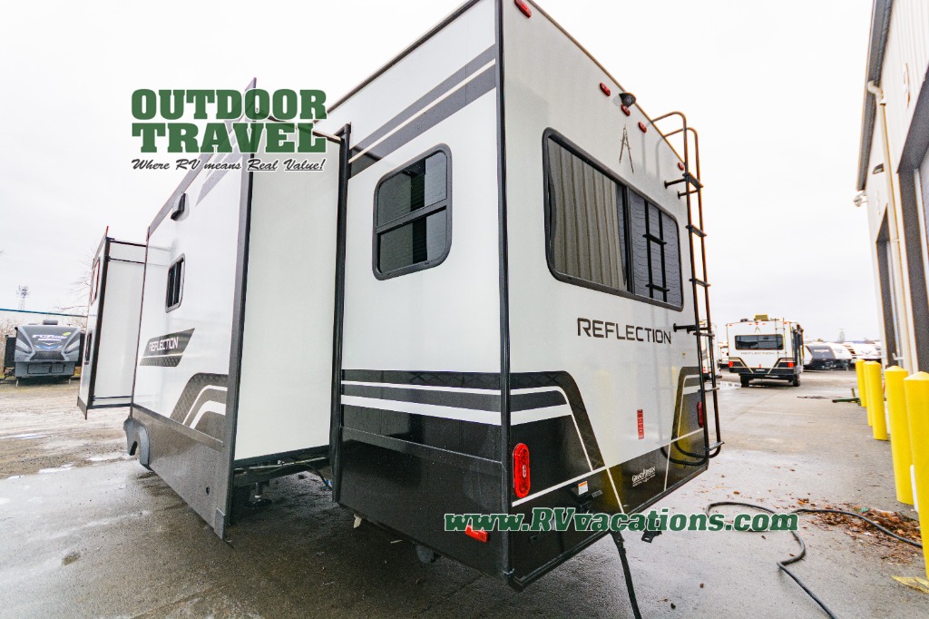 With any Reflection fifth wheel by Grand Design, you will have a solar panel for off-grid camping and a 60 amp charge controller and inverter prep, a Universal All-In-One docking station, unobstructed pass-through storage, and Goodyear Endurance tires. Each is constructed of gel coat exterior sidewalls, residential 5" truss rafters, walk-on roof decking, a fiberglass and radiant foil roof and front cap insulation plus laminated aluminum framed side walls, roof and end walls in slide rooms. Head inside to enjoy residential hardwood cabinet doors, premium Congoleum flooring, a spacious shower with a glass door, and many more comforts!