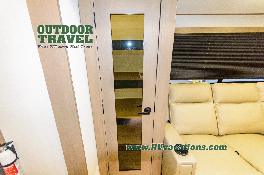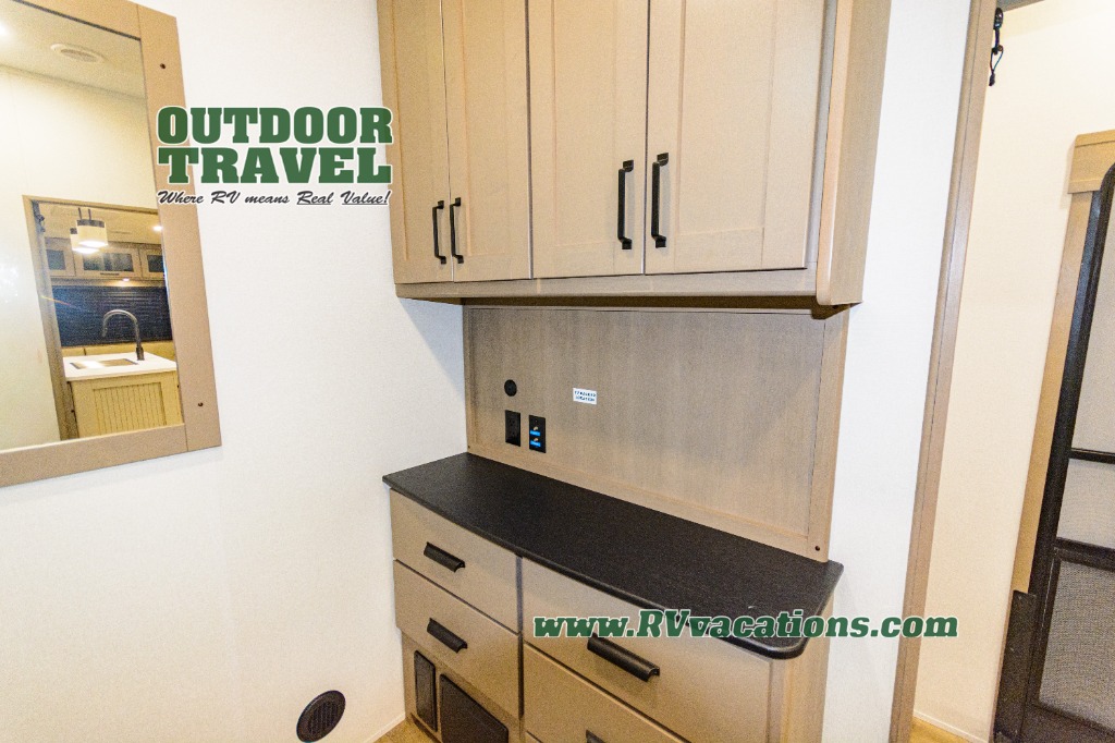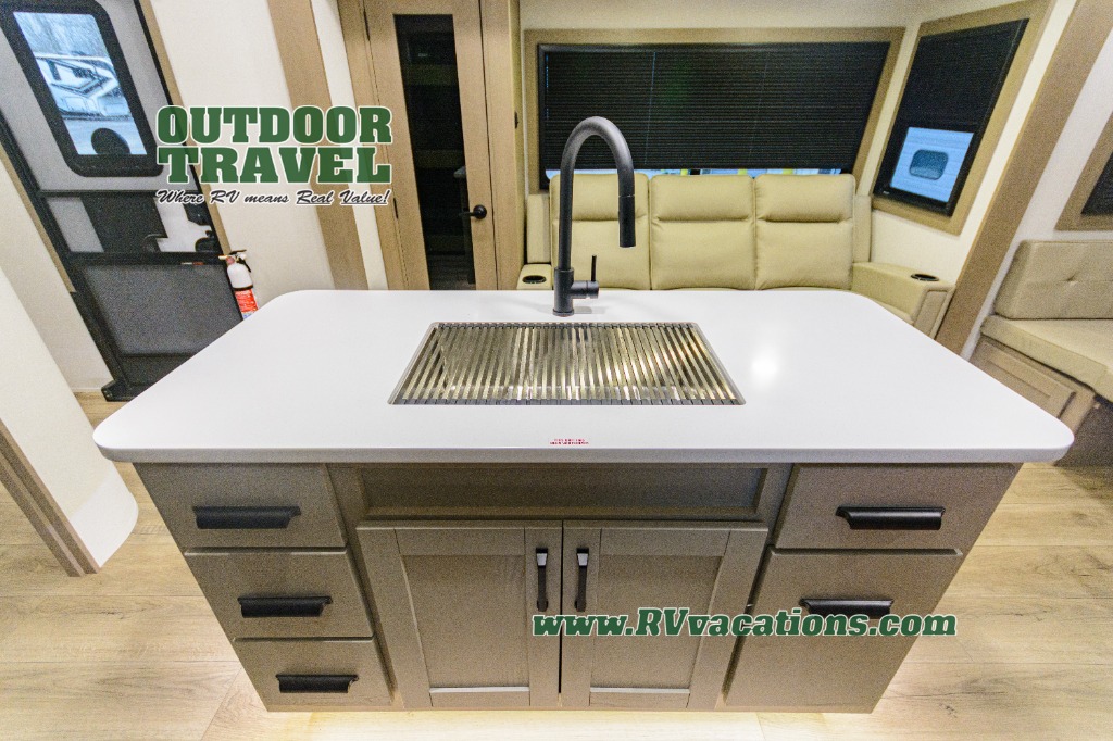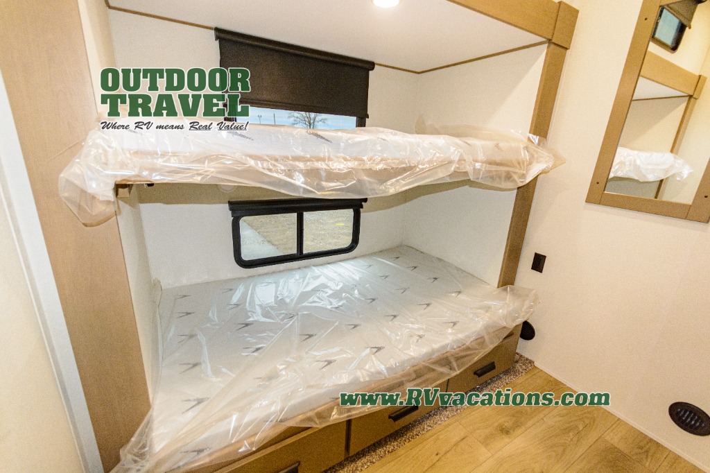 When you are looking for a versatile extra room for either a second bedroom or living area as well as an office, this middle bunkhouse might just work! There is a slide out with two bunks and drawers plus a dresser. You can sleep like a queen on the walk-around bed in the front private bedroom that offers more clothing storage and windows for views. The rear main living and kitchen area provides plenty of seating on the a 78" triple person theater seats, and on the 92" U-shaped lounge with table with windows within the slide for natural lighting and great views. The kitchen island gives the cook more space to make and serve meals, and the gourmet kitchen includes a 16 cu. ft. refrigerator, plus a pantry for dry goods. There is an exterior outside kitchen with a griddle and a 1.6 cu. ft. refrigerator for beverages and such, plus you will find an LP quick connect, Coax TV hookup, and a spray port to wash off your dirty shoes.