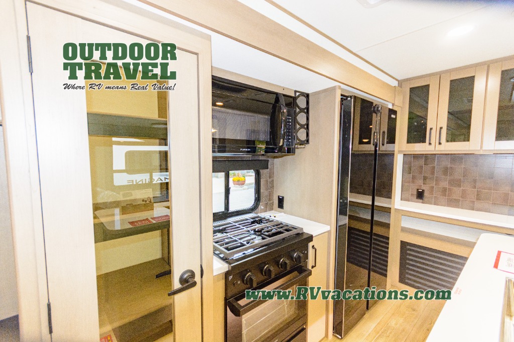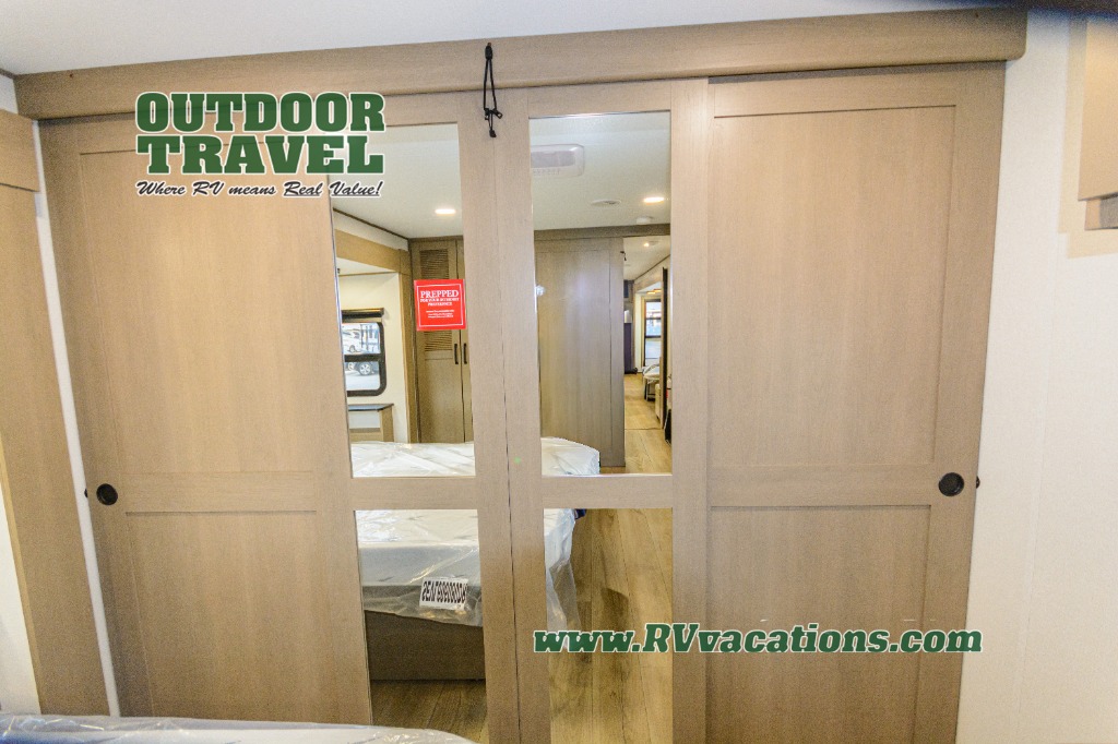 This rear living travel trailer will be perfect for extended stays at the campground or quick weekend trips to the lake! Once you've unloaded your gear from the pass-thru storage, head inside to relax on the rear tri-fold sofa with an adjustable headrest or on the theater seating across from the 40" TV and fireplace. There is also a booth dinette where you can dine together, or you can choose the optional swivel dinette. The spacious kitchen island will make meal time easier than ever, plus there is a pantry and 16 cu. ft. 12V refrigerator for food storage. The full bath is right next to the front private bedroom for easy nighttime use, and speaking of nighttime, you're sure to sleep soundly on the queen bed slide. There is also a large front closet, TV prep, plus washer and dryer prep if you choose to add these appliances.