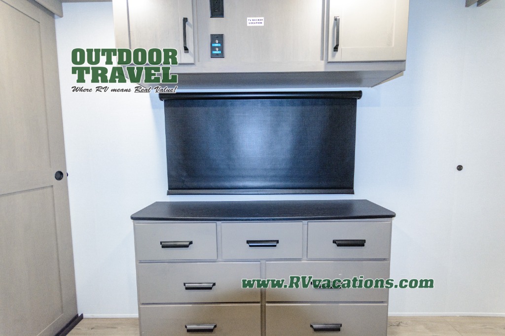 This rear living travel trailer will be perfect for extended stays at the campground or quick weekend trips to the lake! Once you've unloaded your gear from the pass-thru storage, head inside to relax on the rear tri-fold sofa with an adjustable headrest or on the theater seating across from the 40" TV and fireplace. There is also a booth dinette where you can dine together, or you can choose the optional swivel dinette. The spacious kitchen island will make meal time easier than ever, plus there is a pantry and 16 cu. ft. 12V refrigerator for food storage. The full bath is right next to the front private bedroom for easy nighttime use, and speaking of nighttime, you're sure to sleep soundly on the queen bed slide. There is also a large front closet, TV prep, plus washer and dryer prep if you choose to add these appliances.