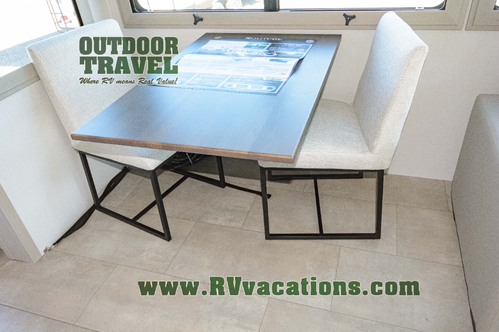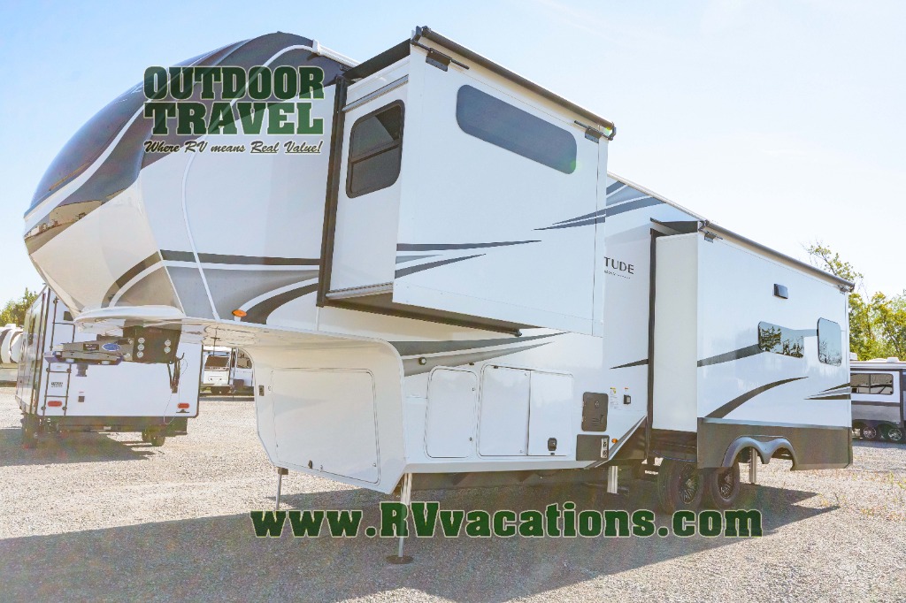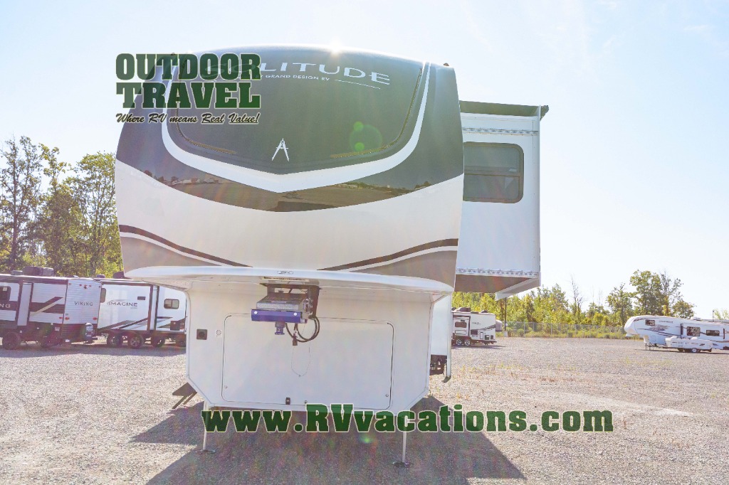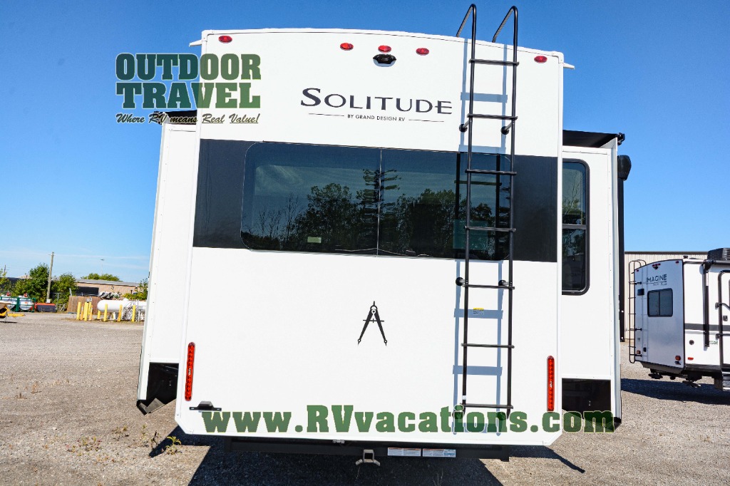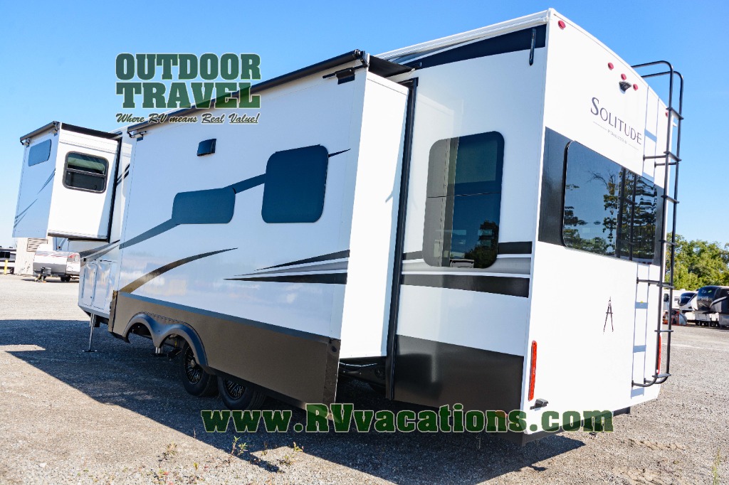 Each Solitude fifth wheel by Grand Design features a 101" wide-body construction, heavy duty 8,000 lb. axles, frameless tinted windows, and high-gloss gel coat sidewalls. You can camp year around thanks to the Weather-Tek Package that includes a 35K BTU high-capacity furnace, an all-in-one enclosed and heated utility center, and a fully enclosed underbelly with heated tanks and storage. Inside, you'll love the premium roller shades, hardwood cabinet doors, solid surface countertops, plus residential finishes throughout to make you truly feel at home. Each model also includes a MORryde CRE3000 suspension system, self adjusting brakes, and a MORryde pin box that will provide smooth towing from home to campground. Affordable luxury is possible with the Solitude fifth wheels; choose yours today!