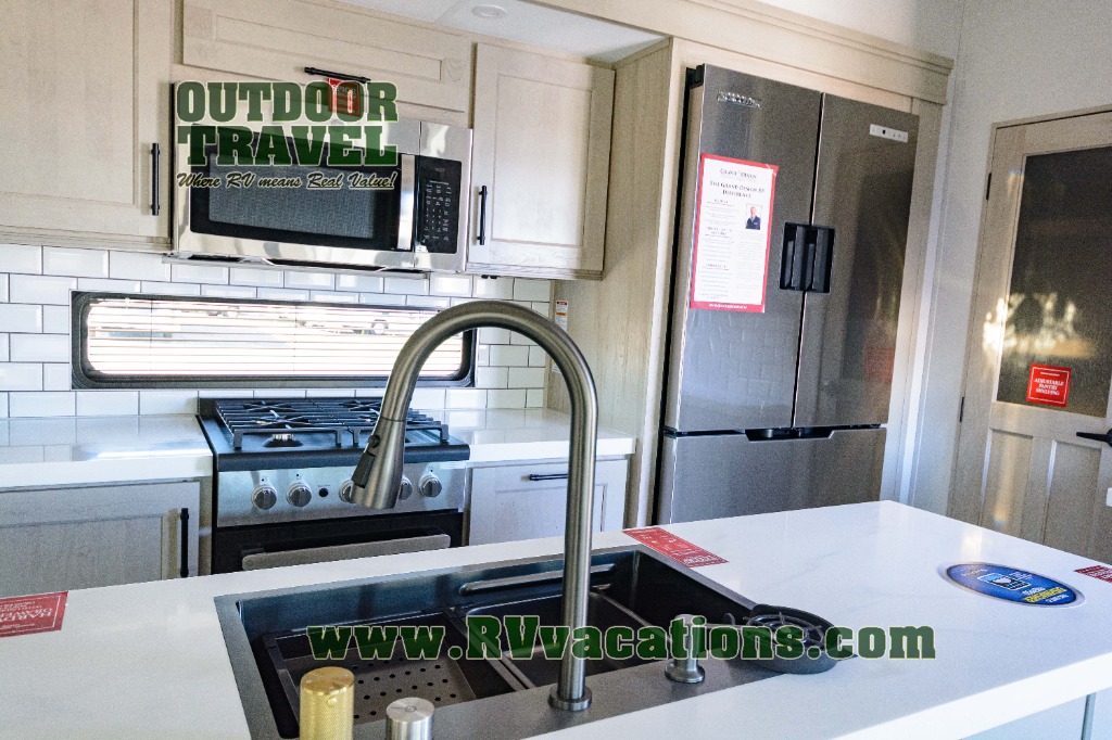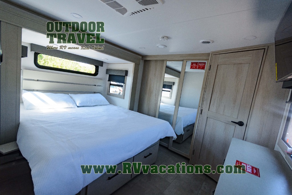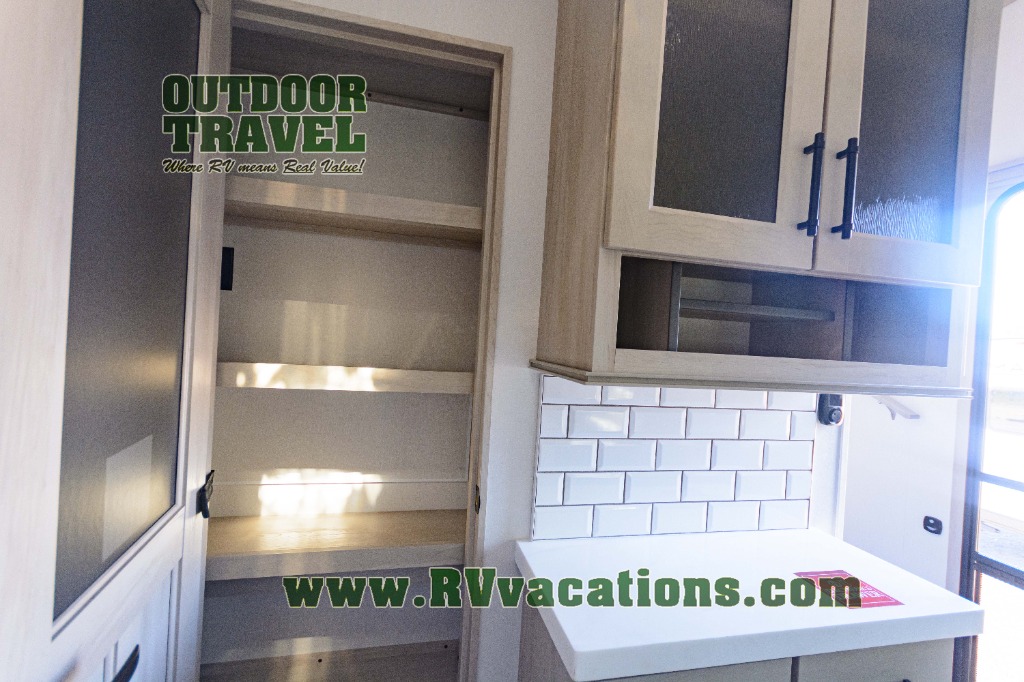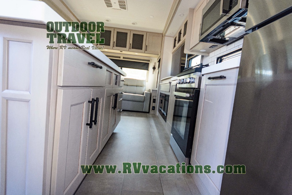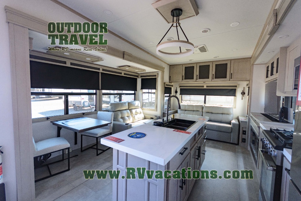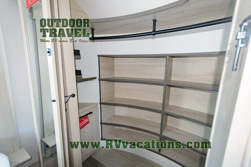 Traveling for long periods at a time is made easy with this gourmet kitchen that can feed your entire group a holiday meal! The professional-grade stainless steel cooktop with a built-in oven, microwave, 12V 20 cu. ft. refrigerator, and a kitchen island offers everything you will need to enjoy cooking for your family and guests. There is abundant storage throughout multiple overhead cabinets, a kitchen pantry and hutch, a bath linen cabinet for your towels, and in the front master bedroom which features a large closet. In the bedroom there is also a queen bed slide for added space to sleep comfortable at night, or you may choose an optional king bed if you enjoy more space. You will also find a closet with washer/dryer prep, large wardrobe, a clothes hamper plus a slide top dresser. Two nice awnings will provide outdoor living space keeping you protected from the sun and rain, and you can add an optional pull-out kitchen to enjoy convenient cooking outdoors as well.