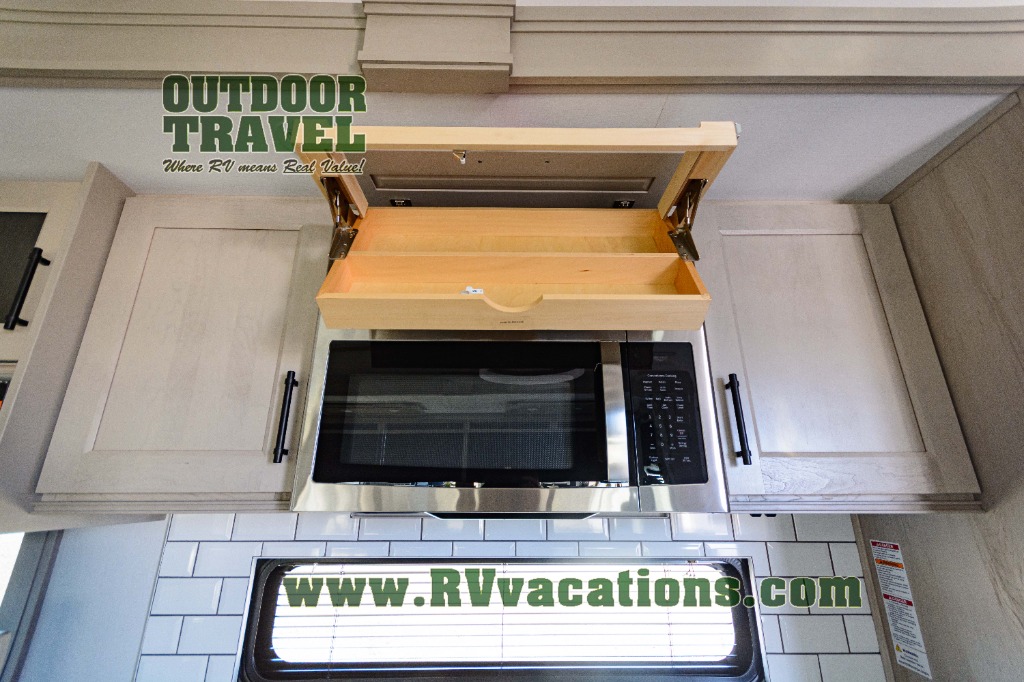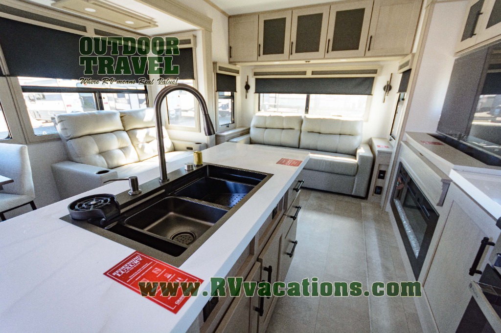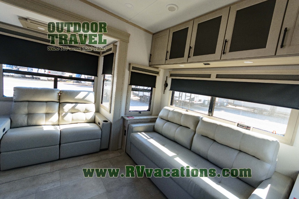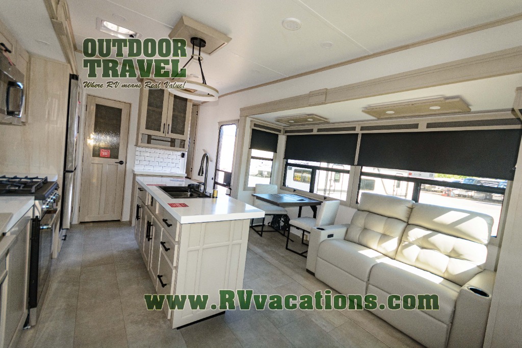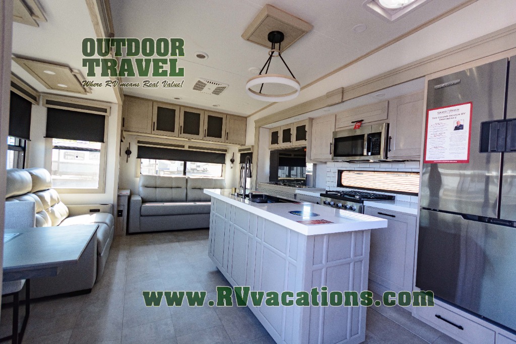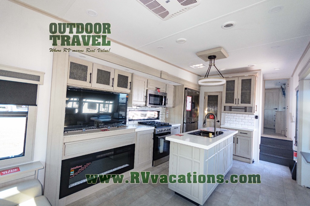 Traveling for long periods at a time is made easy with this gourmet kitchen that can feed your entire group a holiday meal! The professional-grade stainless steel cooktop with a built-in oven, microwave, 12V 20 cu. ft. refrigerator, and a kitchen island offers everything you will need to enjoy cooking for your family and guests. There is abundant storage throughout multiple overhead cabinets, a kitchen pantry and hutch, a bath linen cabinet for your towels, and in the front master bedroom which features a large closet. In the bedroom there is also a queen bed slide for added space to sleep comfortable at night, or you may choose an optional king bed if you enjoy more space. You will also find a closet with washer/dryer prep, large wardrobe, a clothes hamper plus a slide top dresser. Two nice awnings will provide outdoor living space keeping you protected from the sun and rain, and you can add an optional pull-out kitchen to enjoy convenient cooking outdoors as well.