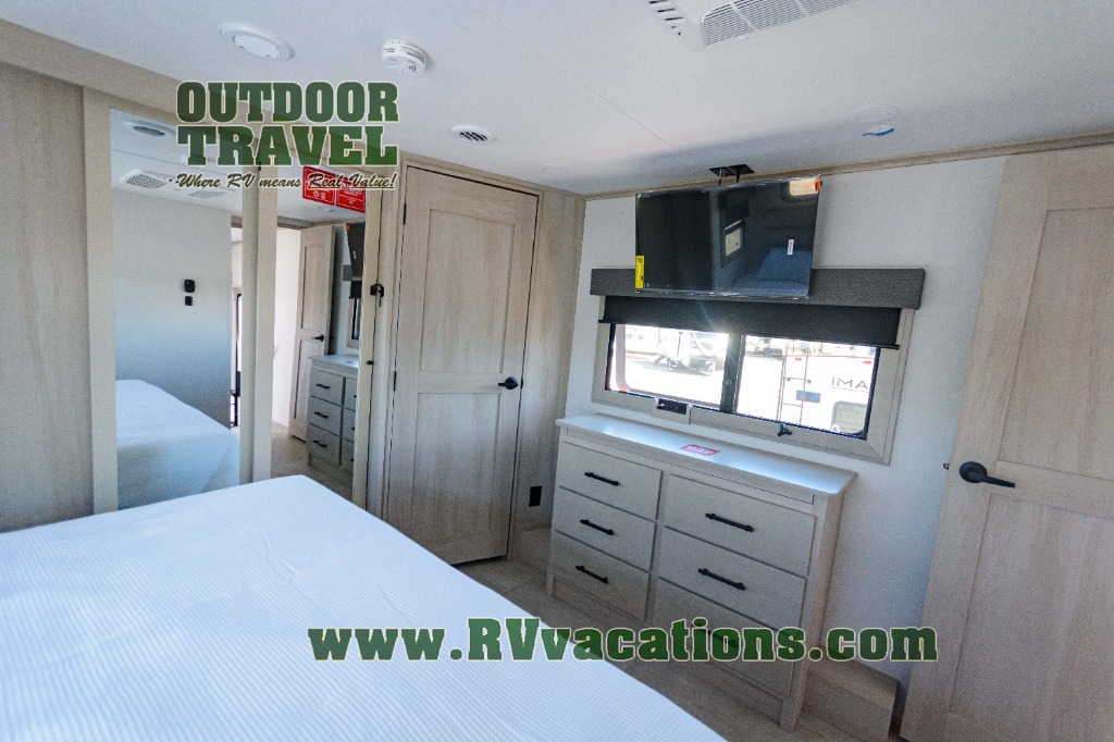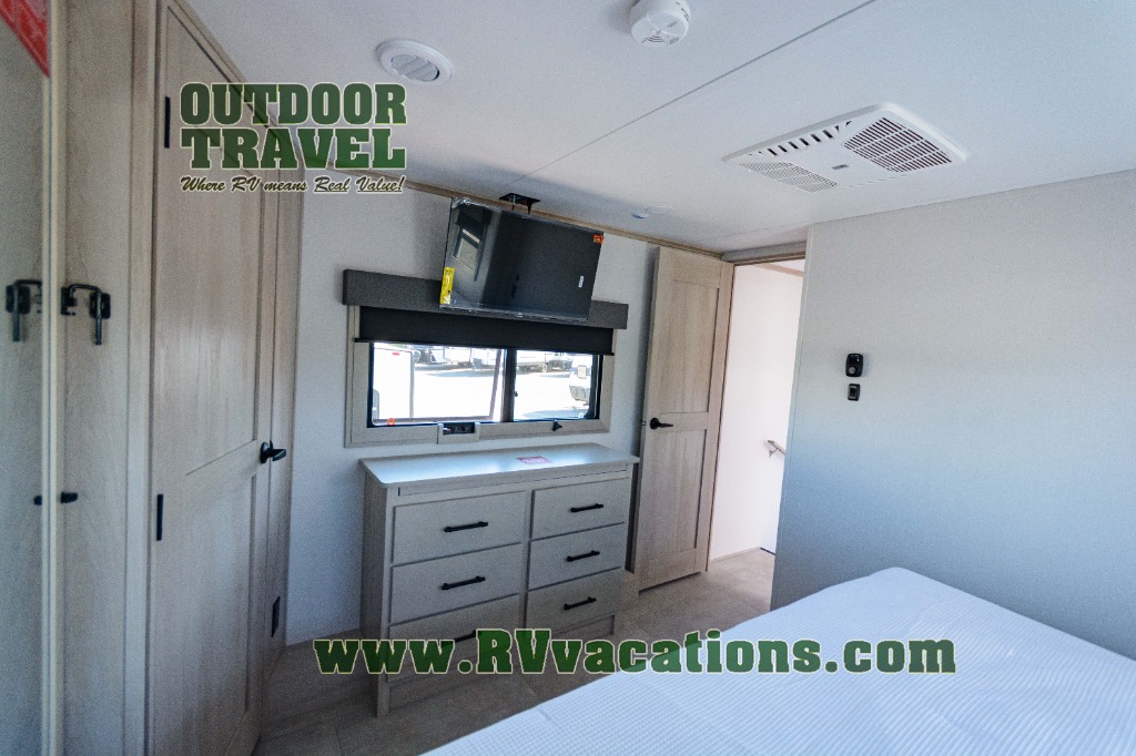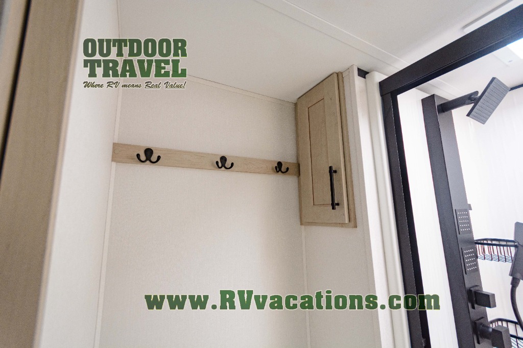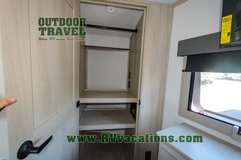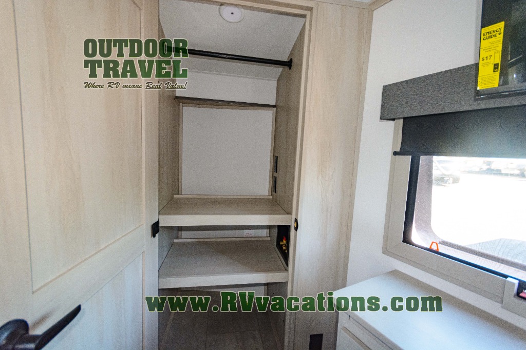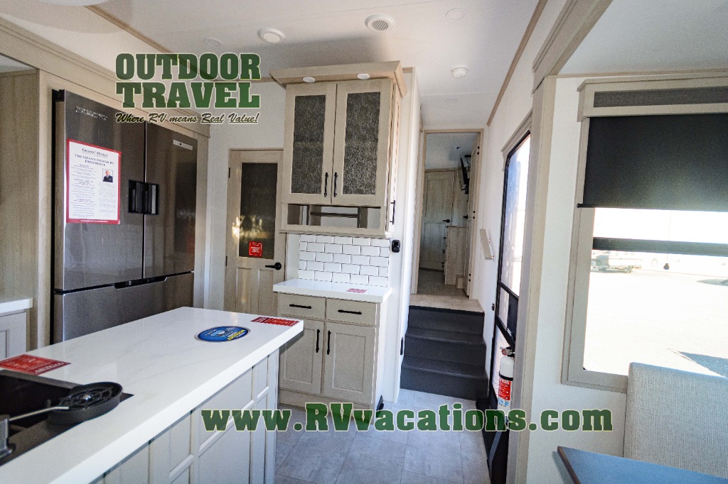 Traveling for long periods at a time is made easy with this gourmet kitchen that can feed your entire group a holiday meal! The professional-grade stainless steel cooktop with a built-in oven, microwave, 12V 20 cu. ft. refrigerator, and a kitchen island offers everything you will need to enjoy cooking for your family and guests. There is abundant storage throughout multiple overhead cabinets, a kitchen pantry and hutch, a bath linen cabinet for your towels, and in the front master bedroom which features a large closet. In the bedroom there is also a queen bed slide for added space to sleep comfortable at night, or you may choose an optional king bed if you enjoy more space. You will also find a closet with washer/dryer prep, large wardrobe, a clothes hamper plus a slide top dresser. Two nice awnings will provide outdoor living space keeping you protected from the sun and rain, and you can add an optional pull-out kitchen to enjoy convenient cooking outdoors as well.