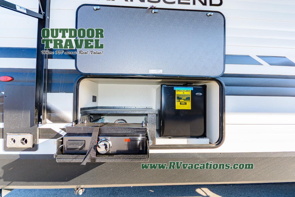 You're going to love every minute spent in this Transcend travel trailer! Your guests or the little ones will have the rear bunkhouse all to themselves that includes a residential full-size bed and two bunks, storage drawers, and TV prep if you want to add a television here. You'll enjoy your own space up front in the private bedroom with a queen bed, storage drawers, and TV prep here also. The combined kitchen and living area includes a sleeper sofa with an optional theater seating, a booth dinette where you can dine together, and a 32" TV for movie nights! The exterior is just as accommodating with its 20' awning, rear storage, plus exterior griddle and refrigerator!
