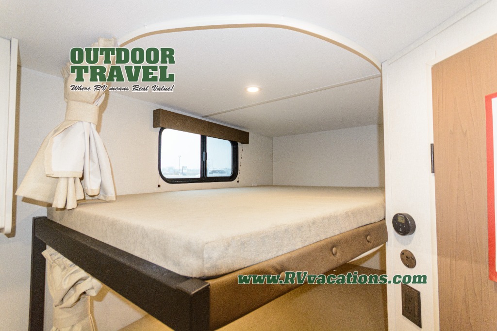 Camping trips are made complete in this travel trailer that can sleep seven each night! The little ones or your guest will love sleeping on the double-size bunks, while you take the queen bed in the front semi-private bedroom with a privacy curtain. A three-burner range and microwave oven will let you make meals each day, and a booth dinette provides a place to dine together. There are also convenient features found here, such as a pull-out pet dish and pull-out trash can, and there is ample storage space for your belongings. You will also appreciate the full bath that will let you stay clean throughout your trip without having to leave your trailer!
