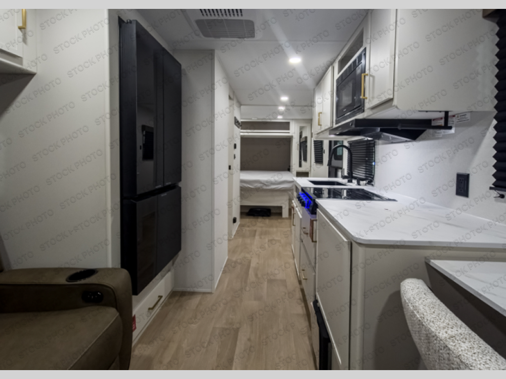 It will be so easy to enjoy camping trips in this travel trailer. The rear living area includes a 70" bi-fold sofa where your guests can sleep, plus a countertop with two chairs for dining space. You'll find your own bedroom up front with a walk-around queen bed, dual beside wardrobes, a privacy curtain and TV prep if you choose to add entertainment. The kitchen includes a three-burner cooktop, a microwave oven, and a 10-cu. ft. refrigerator to cook and store food, and you'll appreciate the middle bath that is easily accessible for all.
