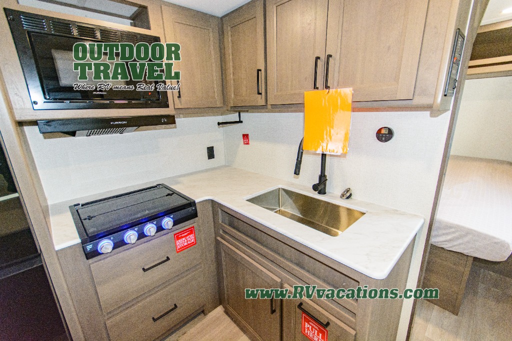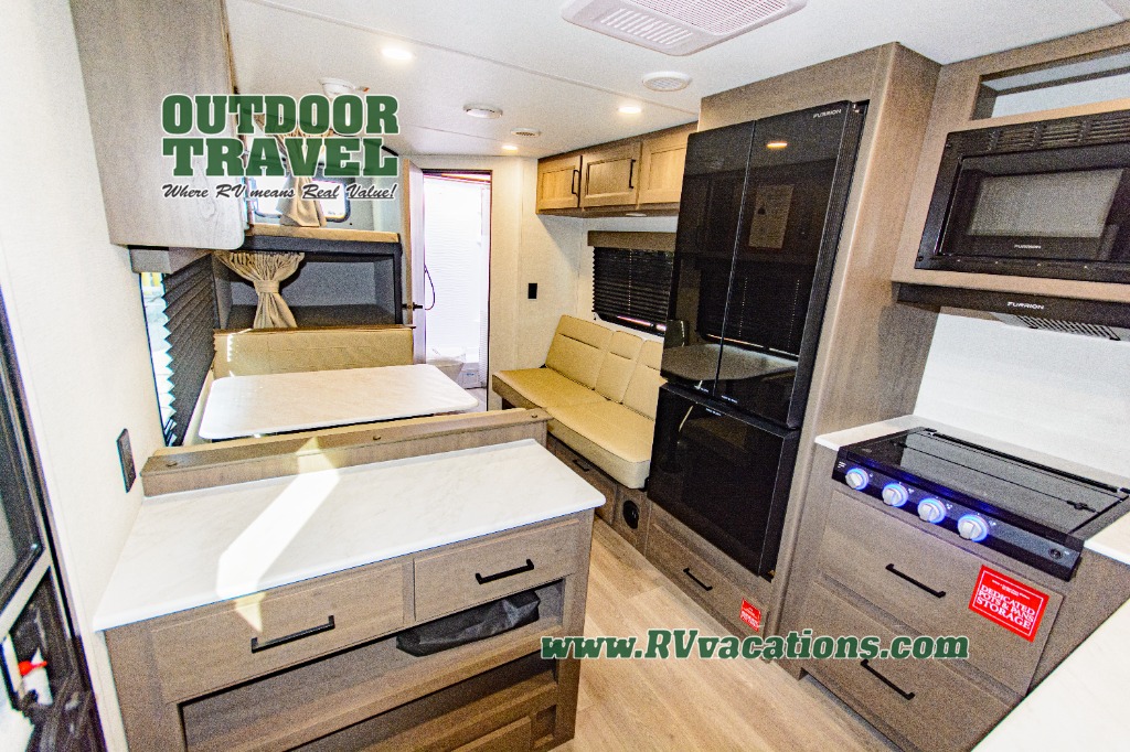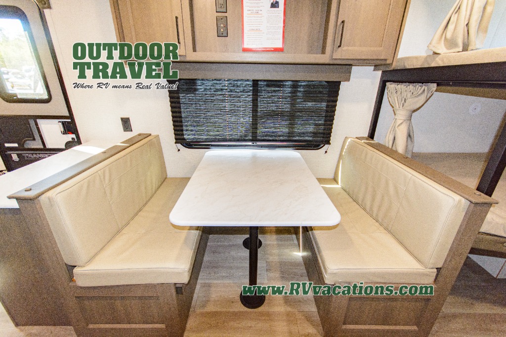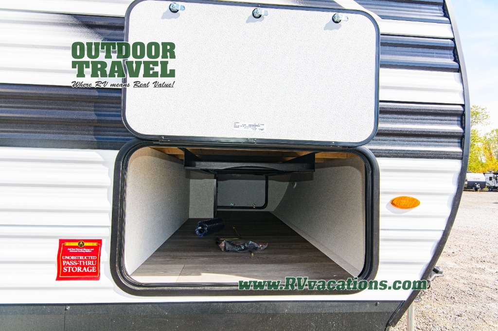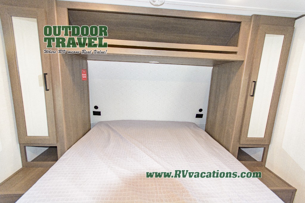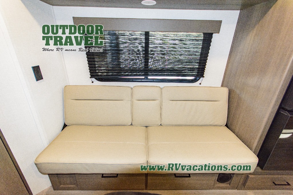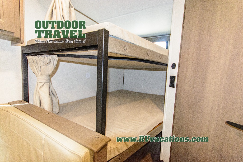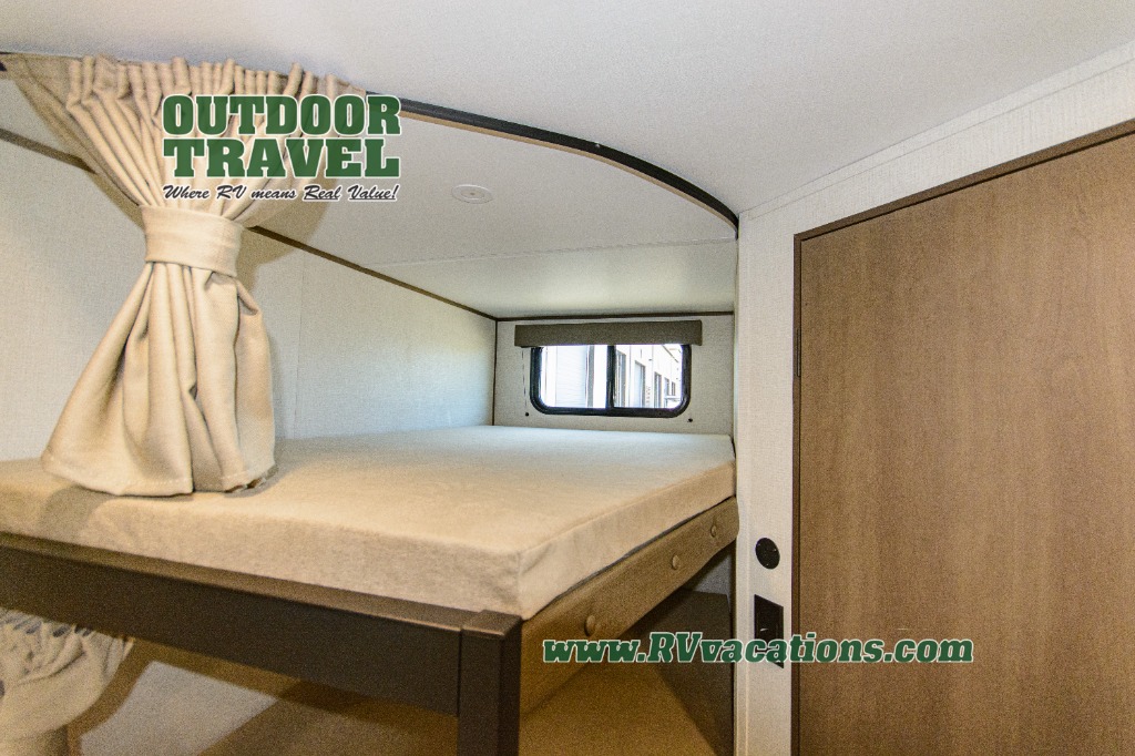 This is the perfect travel trailer if you like to camp with friends and family. Since there are double-size bunks, a queen bed in the front bedroom, plus a booth dinette and sofa, you can sleep eight campers each night! The three burner range and microwave in the kitchen will let you cook meals each day, and the 12V refrigerator will keep your cold items fresh. This model also includes a counter with extra storage underneath, a pull-out trash can storage for convenience, and a full bath to freshen up in each day. And you'll love having your own space in the front bedroom with a privacy curtain, dual wardrobes, and TV prep if you want to add a television!