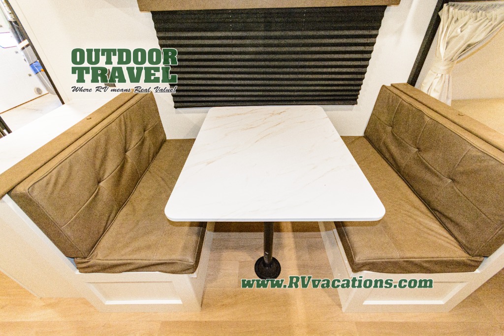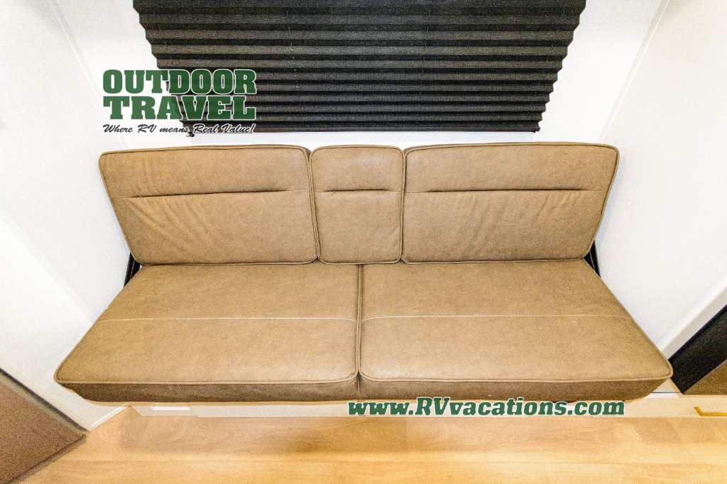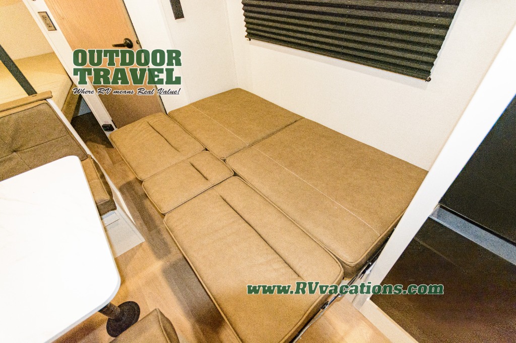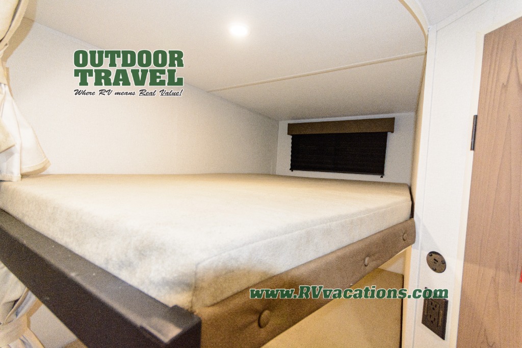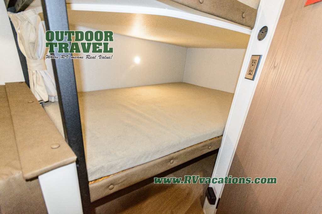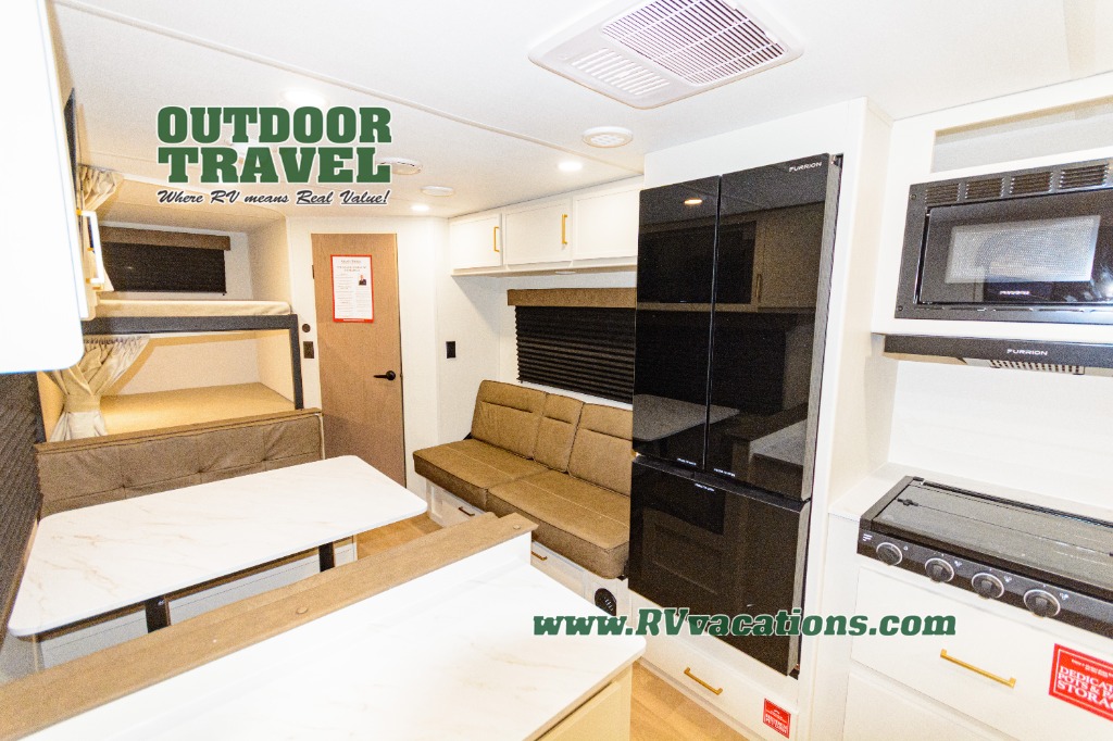 This is the perfect travel trailer if you like to camp with friends and family. Since there are double-size bunks, a queen bed in the front bedroom, plus a booth dinette and sofa, you can sleep eight campers each night! The three burner range and microwave in the kitchen will let you cook meals each day, and the 12V refrigerator will keep your cold items fresh. This model also includes a counter with extra storage underneath, a pull-out trash can storage for convenience, and a full bath to freshen up in each day. And you'll love having your own space in the front bedroom with a privacy curtain, dual wardrobes, and TV prep if you want to add a television!