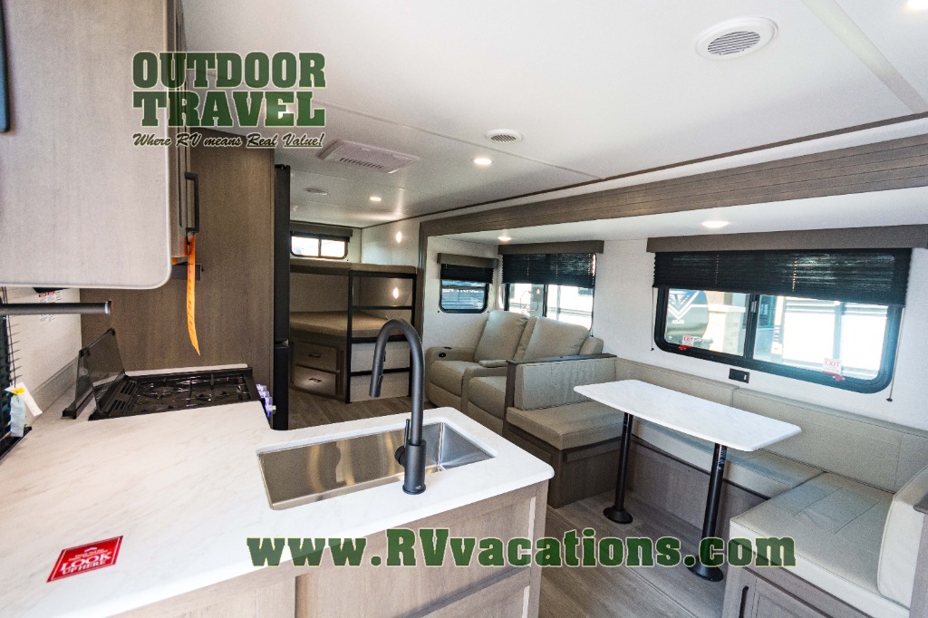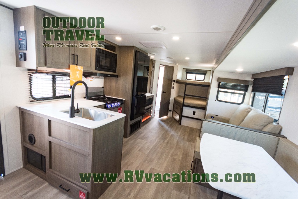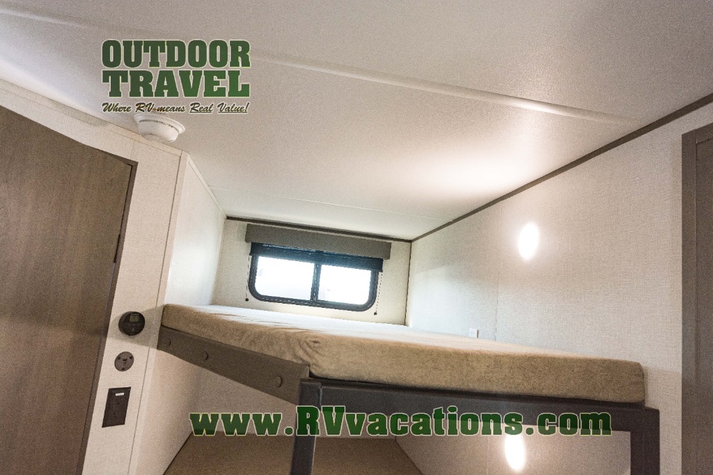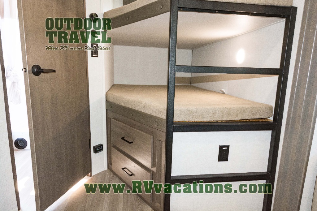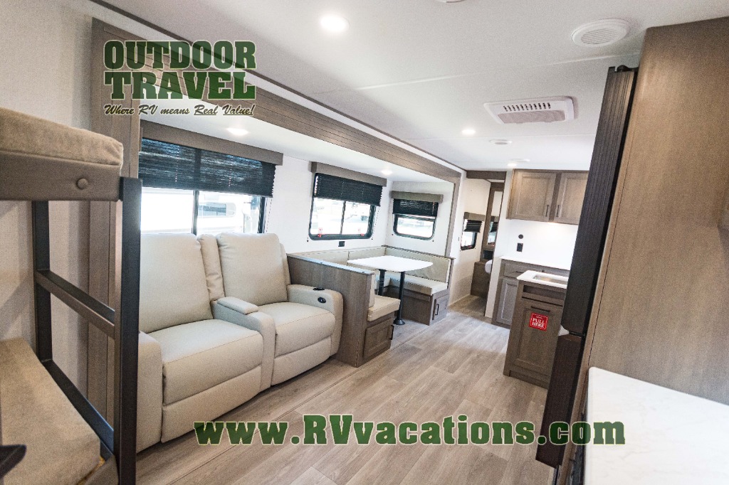 Get ready to take your travels to new heights with our incredible luxury travel trailer! The front bedroom has a queen bed, wardrobe, and overhead cabinets for all your favorite belongings, the perfect place to relax and recharge after a long day of adventure. The living room/kitchen combined area is equipped with a U-shaped dinette, three-burner cooktop, microwave, refrigerator, pantry, and 62” theater seating. Perfect for cooking up your favorite meals, entertaining friends and family, or simply relaxing and enjoying the comforts of home. The full bathroom is spacious and complete with a linen closet for added convenience. And with double-sized bunk beds featuring curtains and under-bunk storage, the kids will have their cozy retreat. But the adventure doesn't stop there! Outside, you'll find an exterior griddle with a 1.7 refrigerator, perfect for cooking up a storm in the great outdoors. And with a massive 19’ awning, you'll have plenty of shade and protection from the elements, plus, with two entry/exit doors and pass-through storage, you'll have easy access to the trailer and all your gear.
