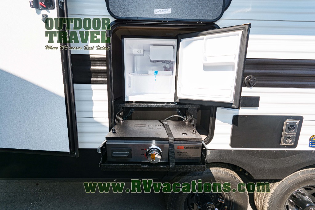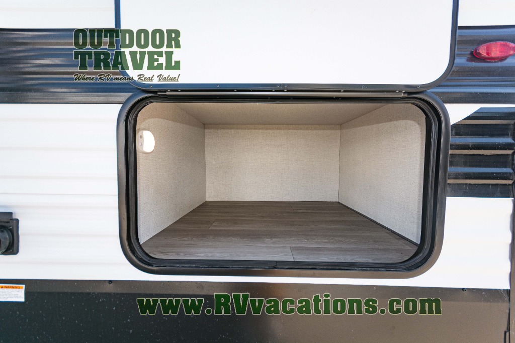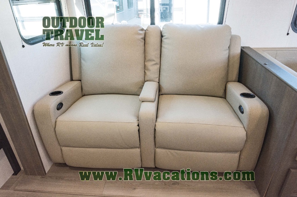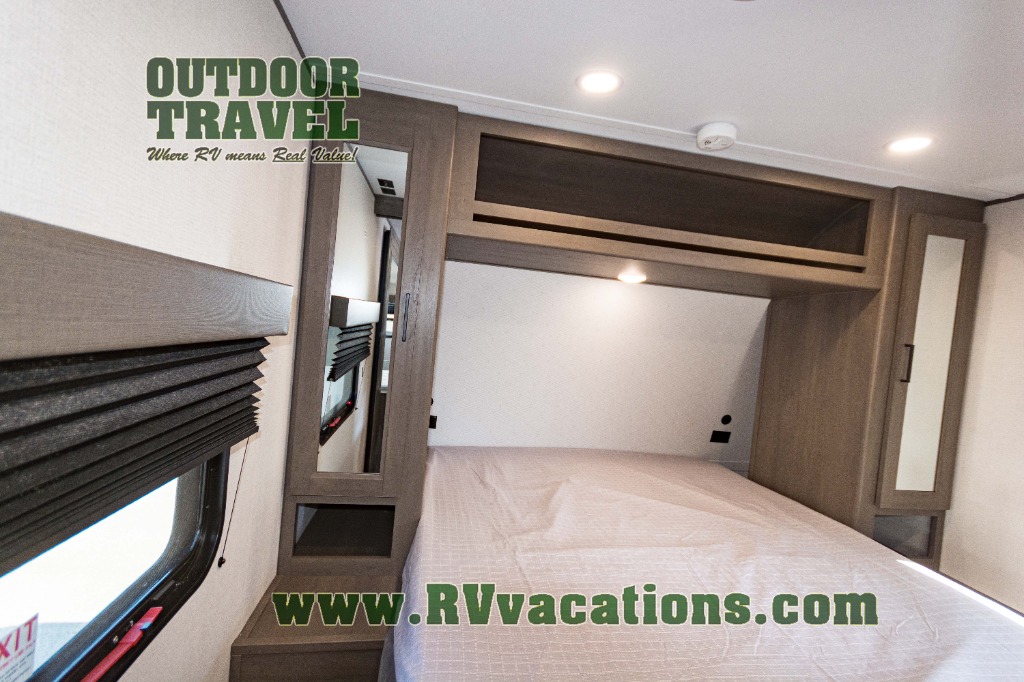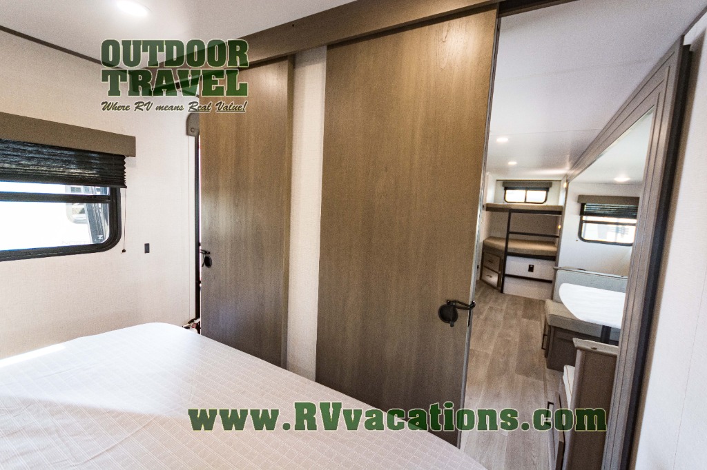 Get ready to take your travels to new heights with our incredible luxury travel trailer! The front bedroom has a queen bed, wardrobe, and overhead cabinets for all your favorite belongings, the perfect place to relax and recharge after a long day of adventure. The living room/kitchen combined area is equipped with a U-shaped dinette, three-burner cooktop, microwave, refrigerator, pantry, and 62” theater seating. Perfect for cooking up your favorite meals, entertaining friends and family, or simply relaxing and enjoying the comforts of home. The full bathroom is spacious and complete with a linen closet for added convenience. And with double-sized bunk beds featuring curtains and under-bunk storage, the kids will have their cozy retreat. But the adventure doesn't stop there! Outside, you'll find an exterior griddle with a 1.7 refrigerator, perfect for cooking up a storm in the great outdoors. And with a massive 19’ awning, you'll have plenty of shade and protection from the elements, plus, with two entry/exit doors and pass-through storage, you'll have easy access to the trailer and all your gear.