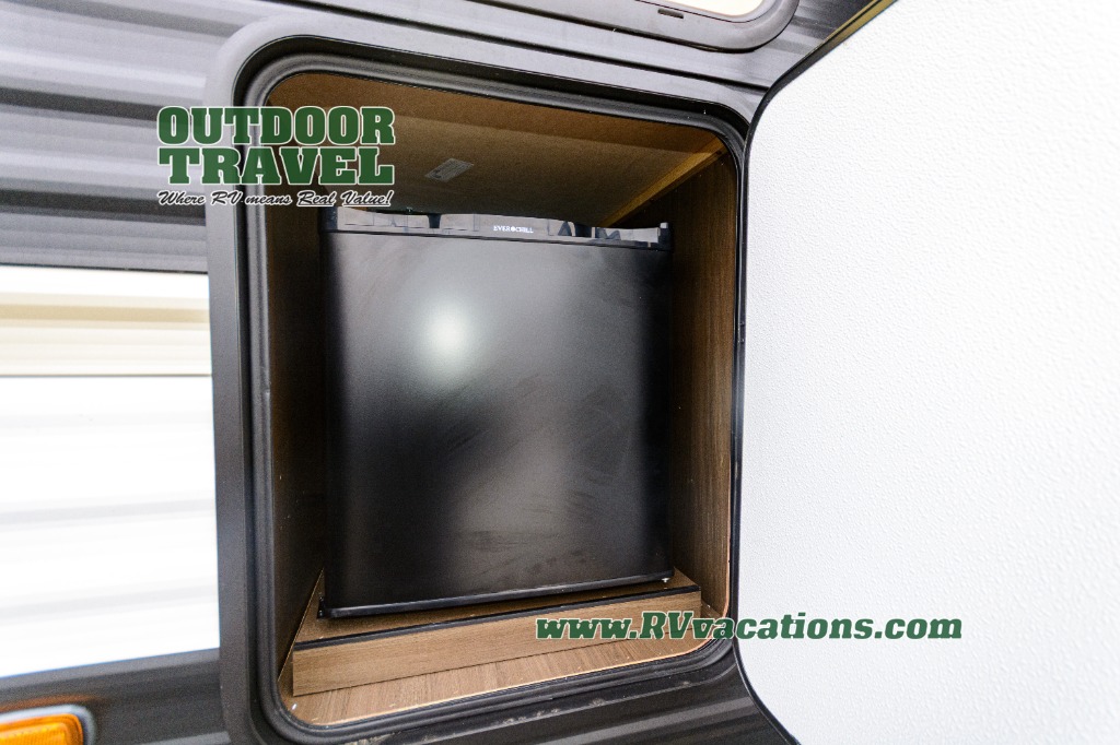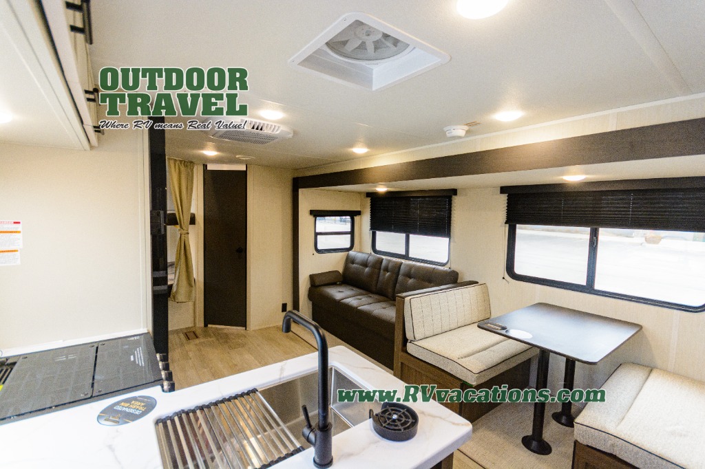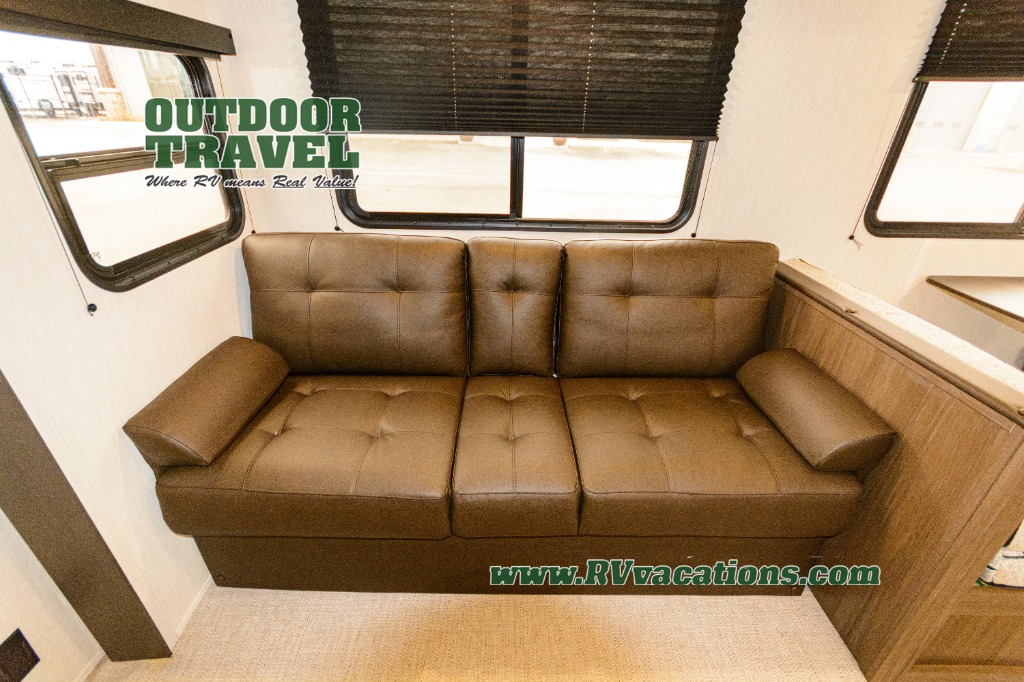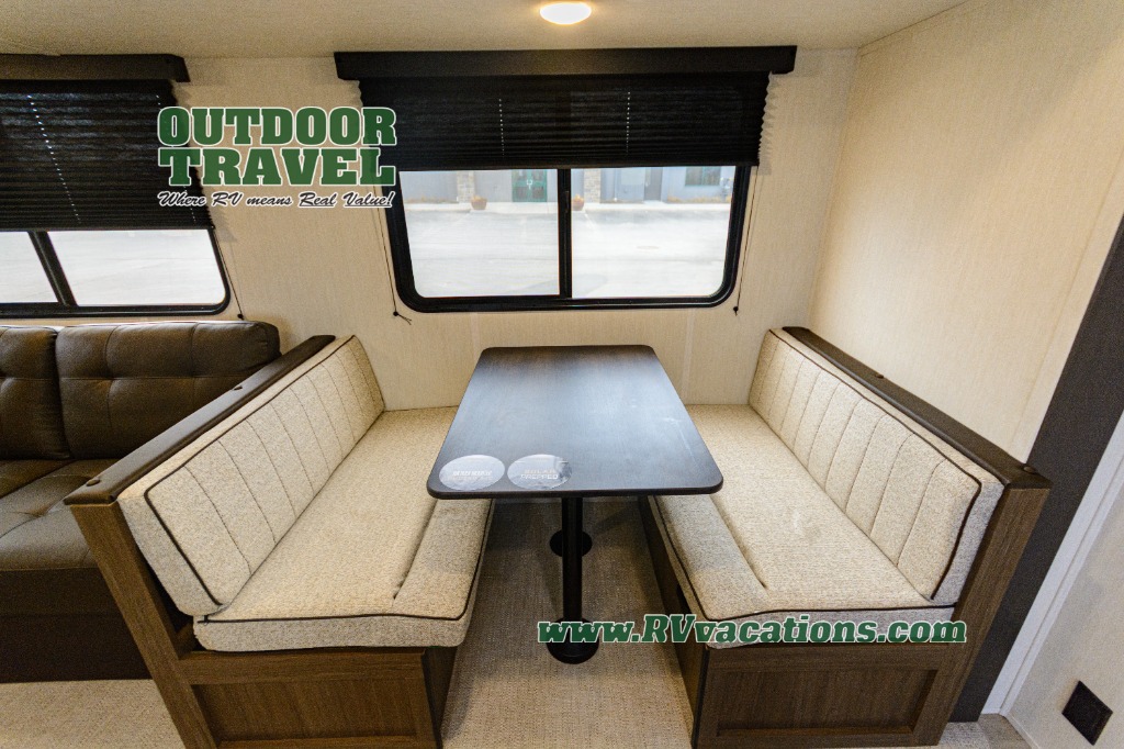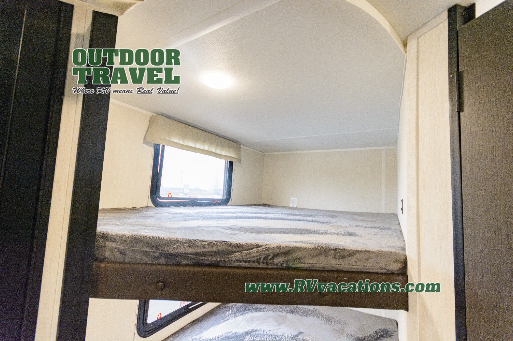 You'll appreciate the added space in this travel trailer thanks to the large slide out! The booth dinette and sofa are found here, and there is a moveable storage ottoman for extra blankets or board games. You'll have your own space up front in the private bedroom, complete with a camp king bed and storage for your things, while your guests take the double-size bunk beds towards the back. The chef of your group will find a three-burner cooktop and a built-in convection microwave with an air fryer to cook meals, plus there is a 12V refrigerator and large hidden pantry for food storage. This unit also includes a power awning outdoors and an outside refrigerator to keep cold drinks close by.
