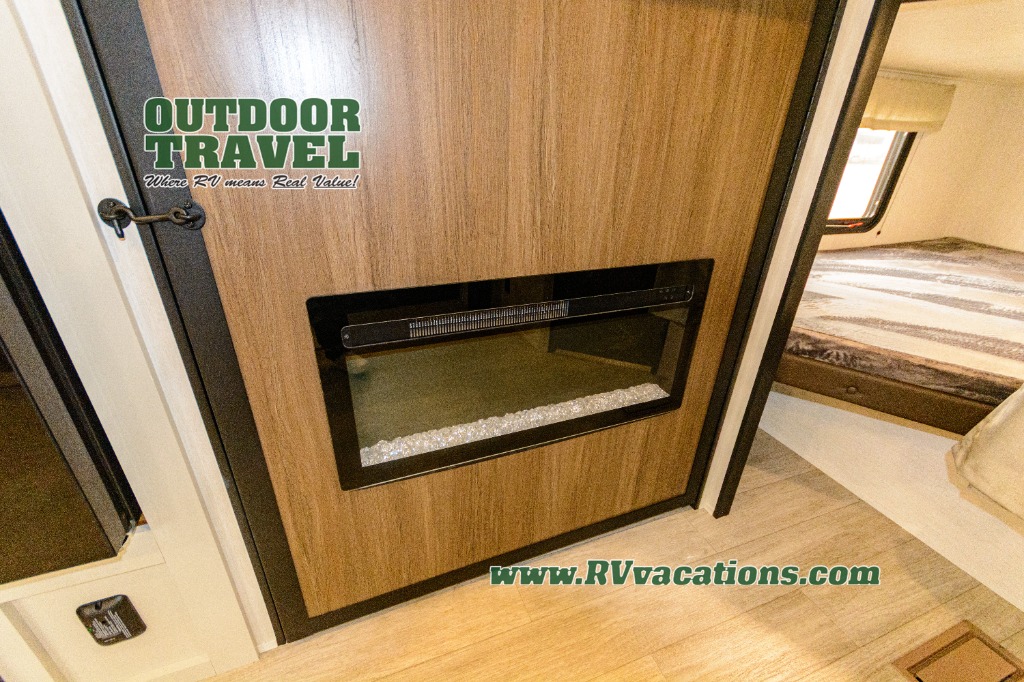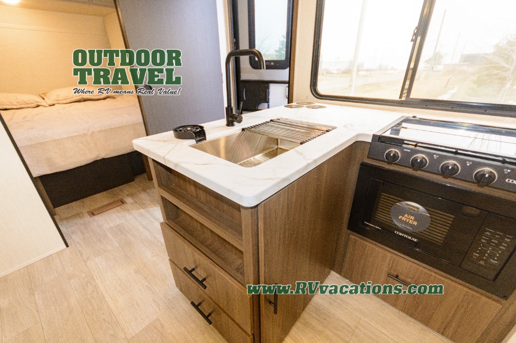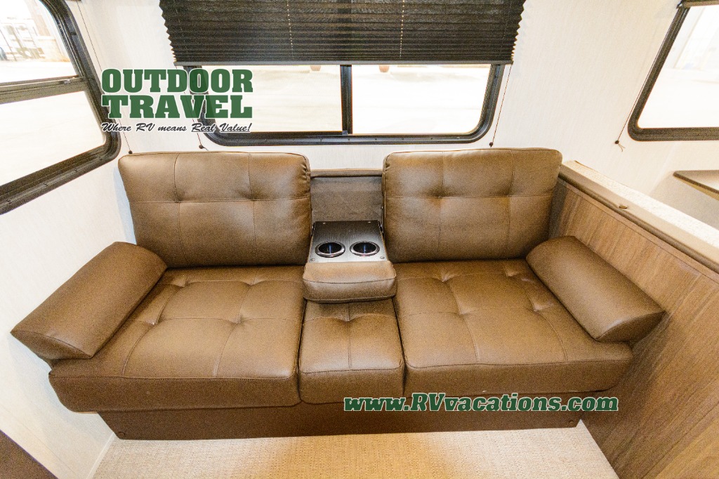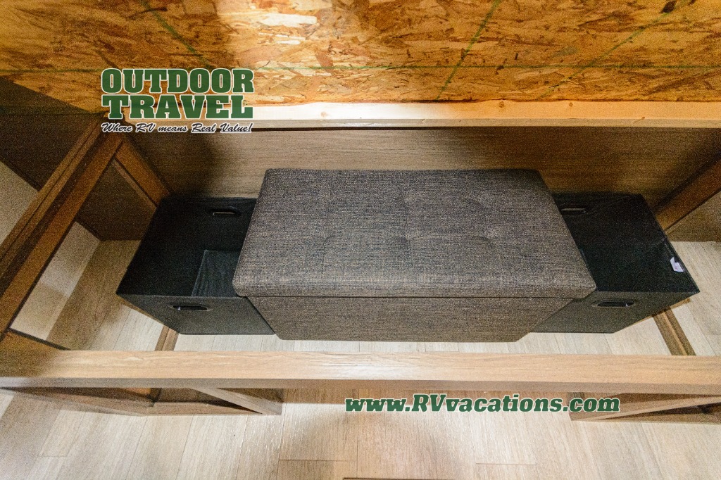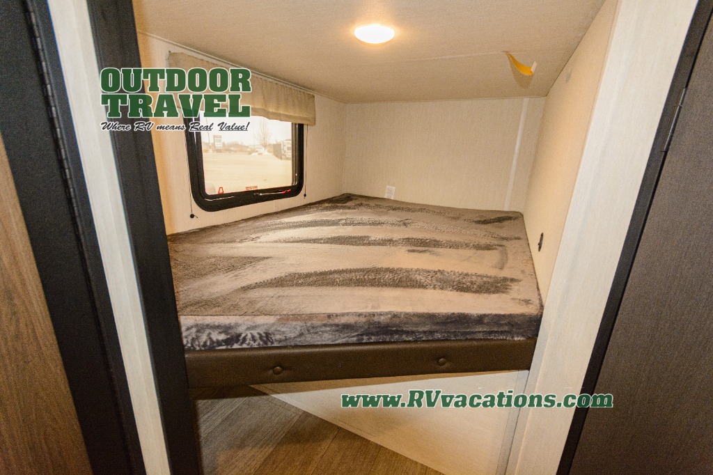 You'll appreciate the added space in this travel trailer thanks to the large slide out! The booth dinette and sofa are found here, and there is a moveable storage ottoman for extra blankets or board games. You'll have your own space up front in the private bedroom, complete with a camp king bed and storage for your things, while your guests take the double-size bunk beds towards the back. The chef of your group will find a three-burner cooktop and a built-in convection microwave with an air fryer to cook meals, plus there is a 12V refrigerator and large hidden pantry for food storage. This unit also includes a power awning outdoors and an outside refrigerator to keep cold drinks close by.