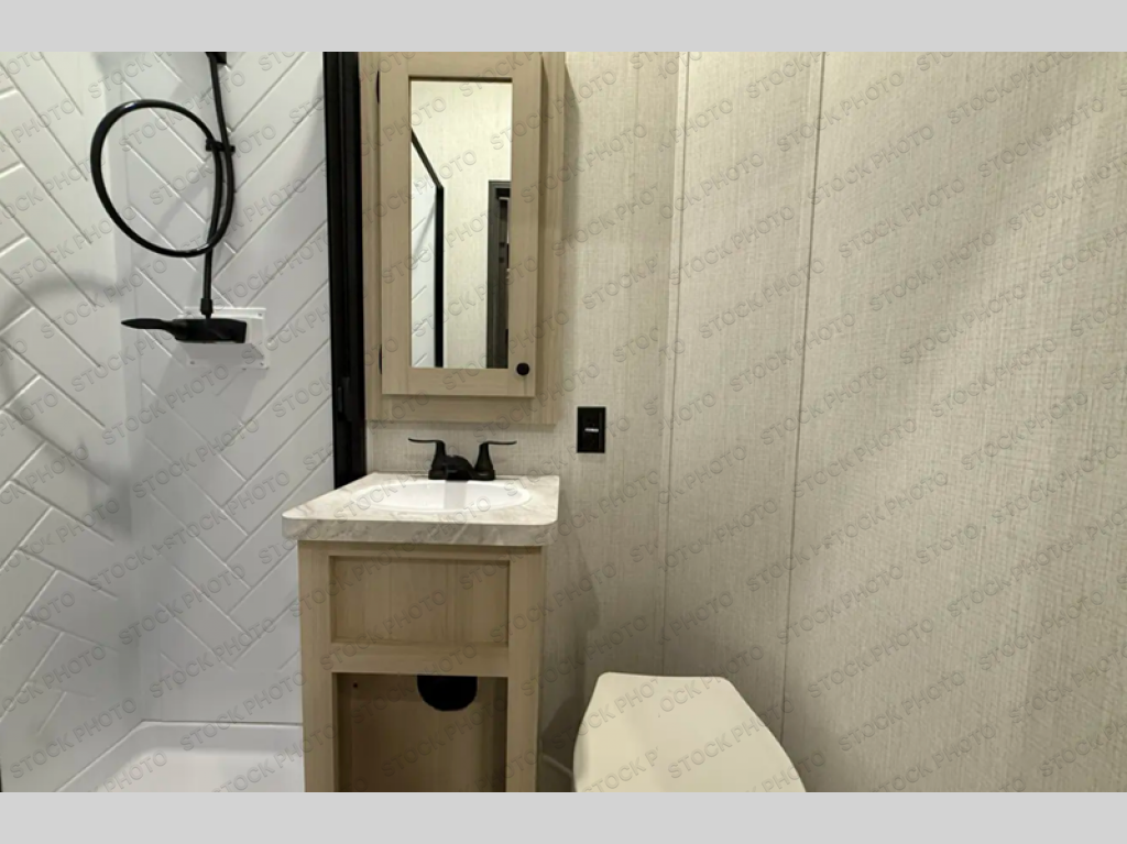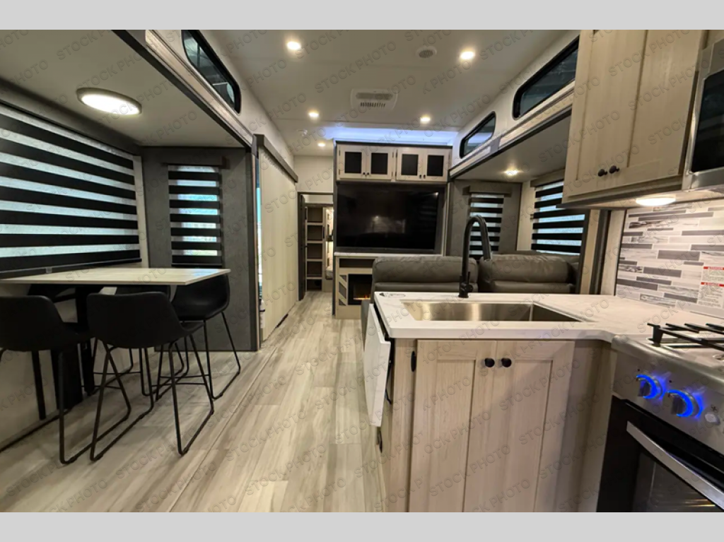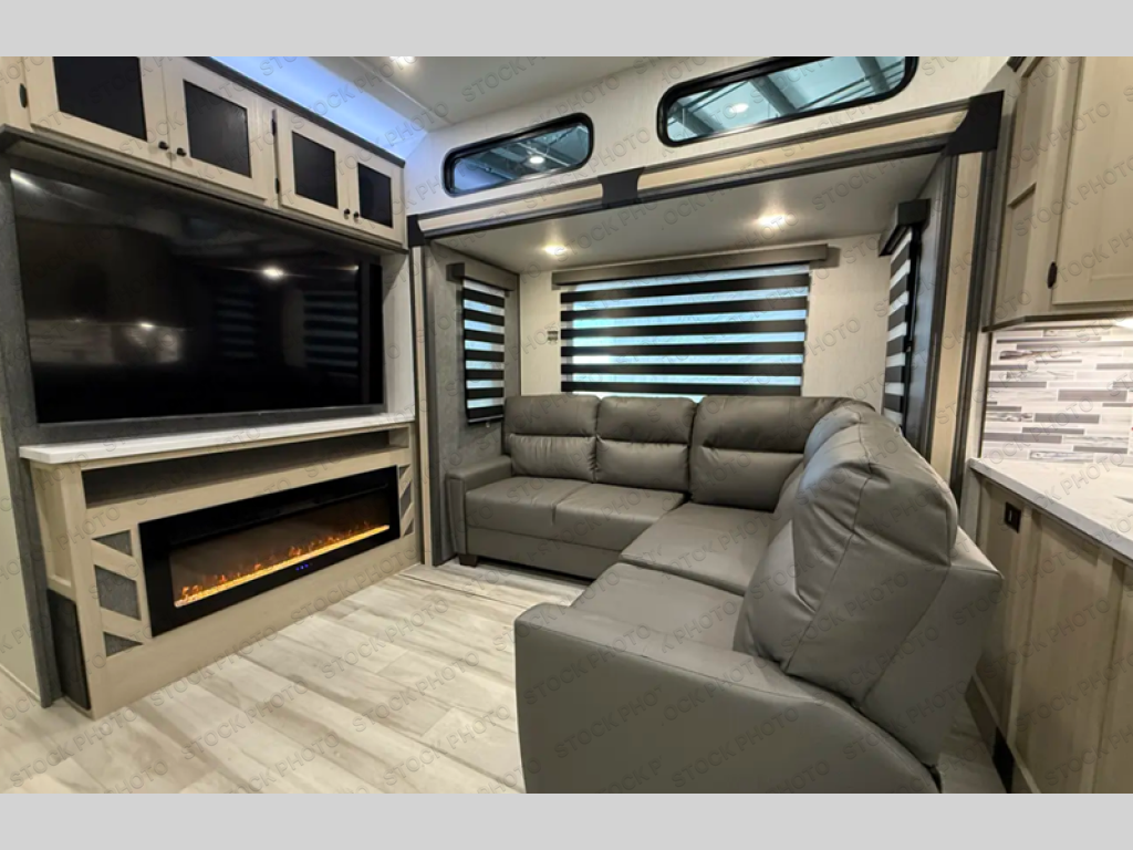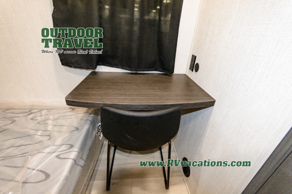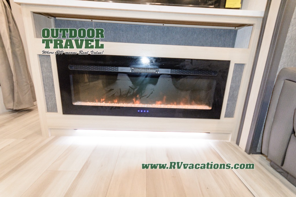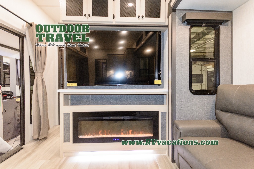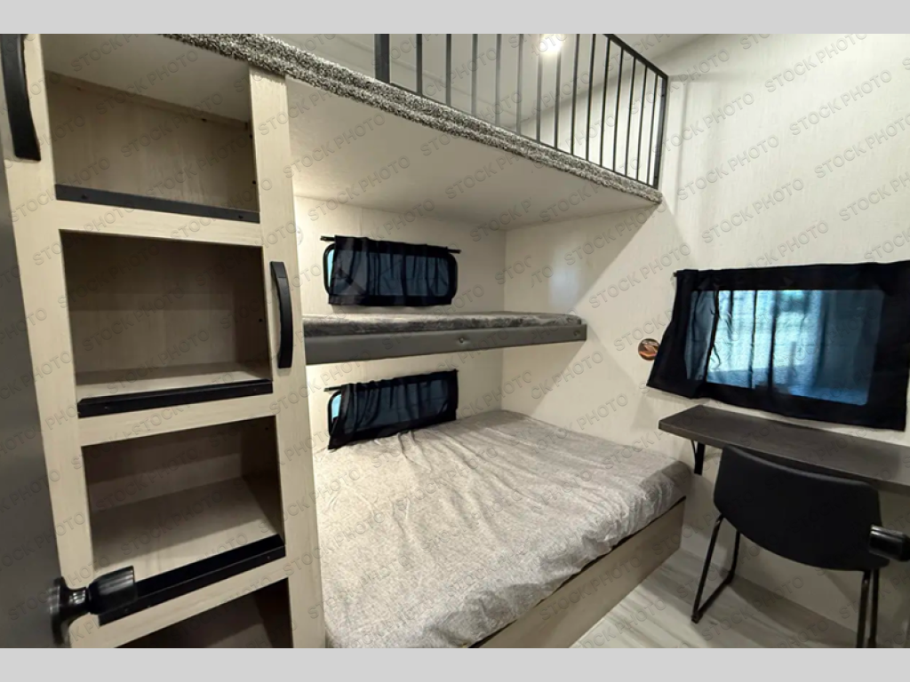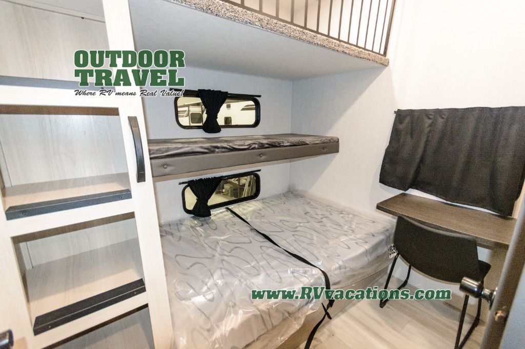 This stunning travel trailer is designed for families and travelers who crave comfort. Two rear bunk beds and a cozy loft above them create a fun and playful sleeping area for kids or guests, perfect for family bonding and sweet dreams. The full bathroom is equipped with everything you need to start your day feeling refreshed and revitalized. In the living area, the entertainment center features a warm fireplace, ideal for chilly evenings and cozy movie nights, while the plush L sofa is the perfect spot to unwind and enjoy quality time with loved ones. The pantry is stocked with storage for your favorite snacks and ingredients, while the fridge keeps everything fresh. There is a well-equipped kitchen with a spacious countertop for added convenience. Plus, the main bedroom is a peaceful sanctuary, featuring a luxurious king bed, spacious wardrobes, a stylish dresser, and the front bathroom is a thoughtful touch, offering privacy for your family or guests.